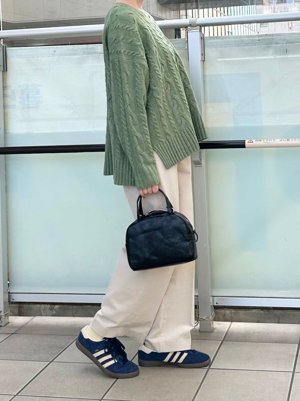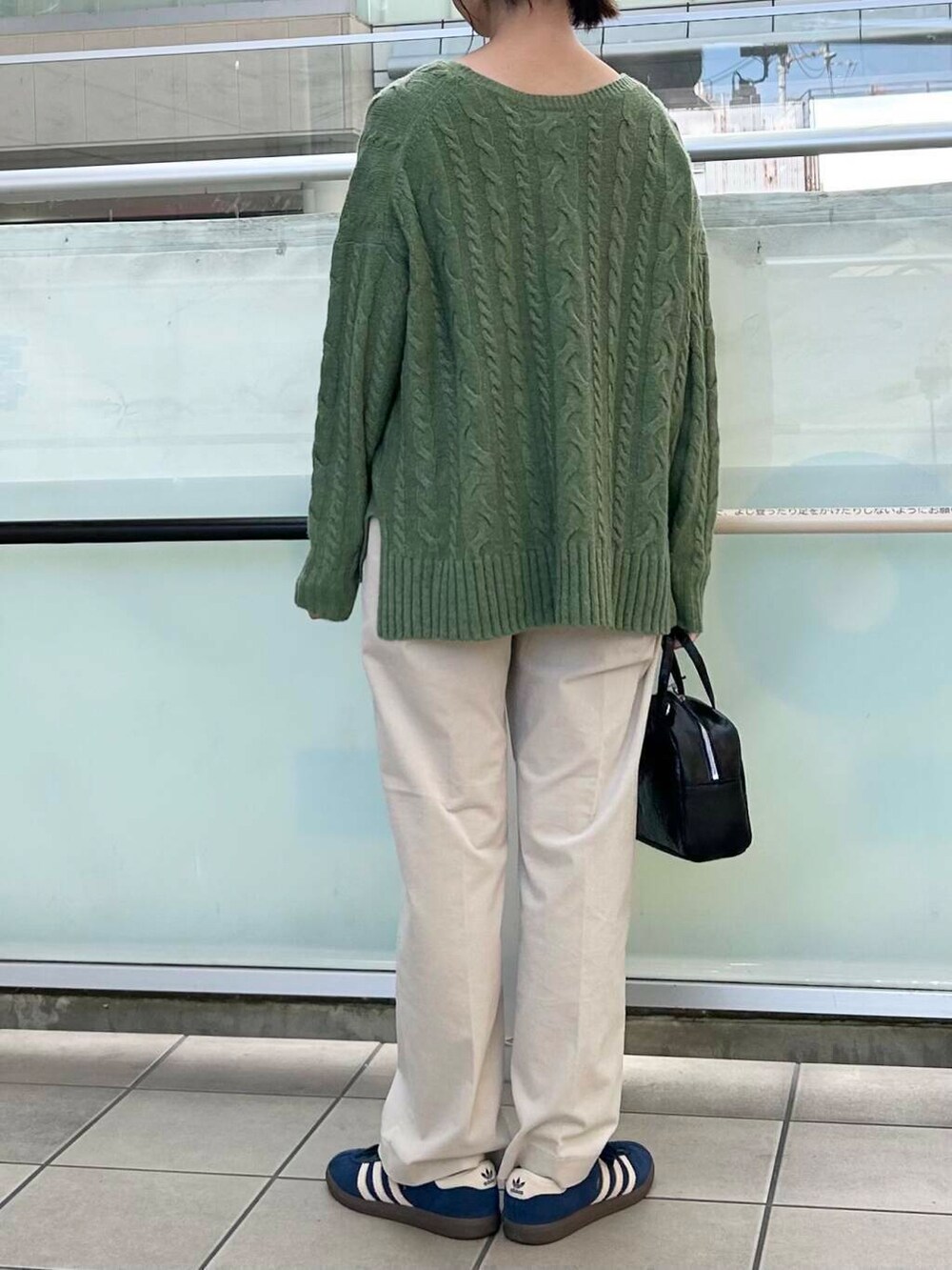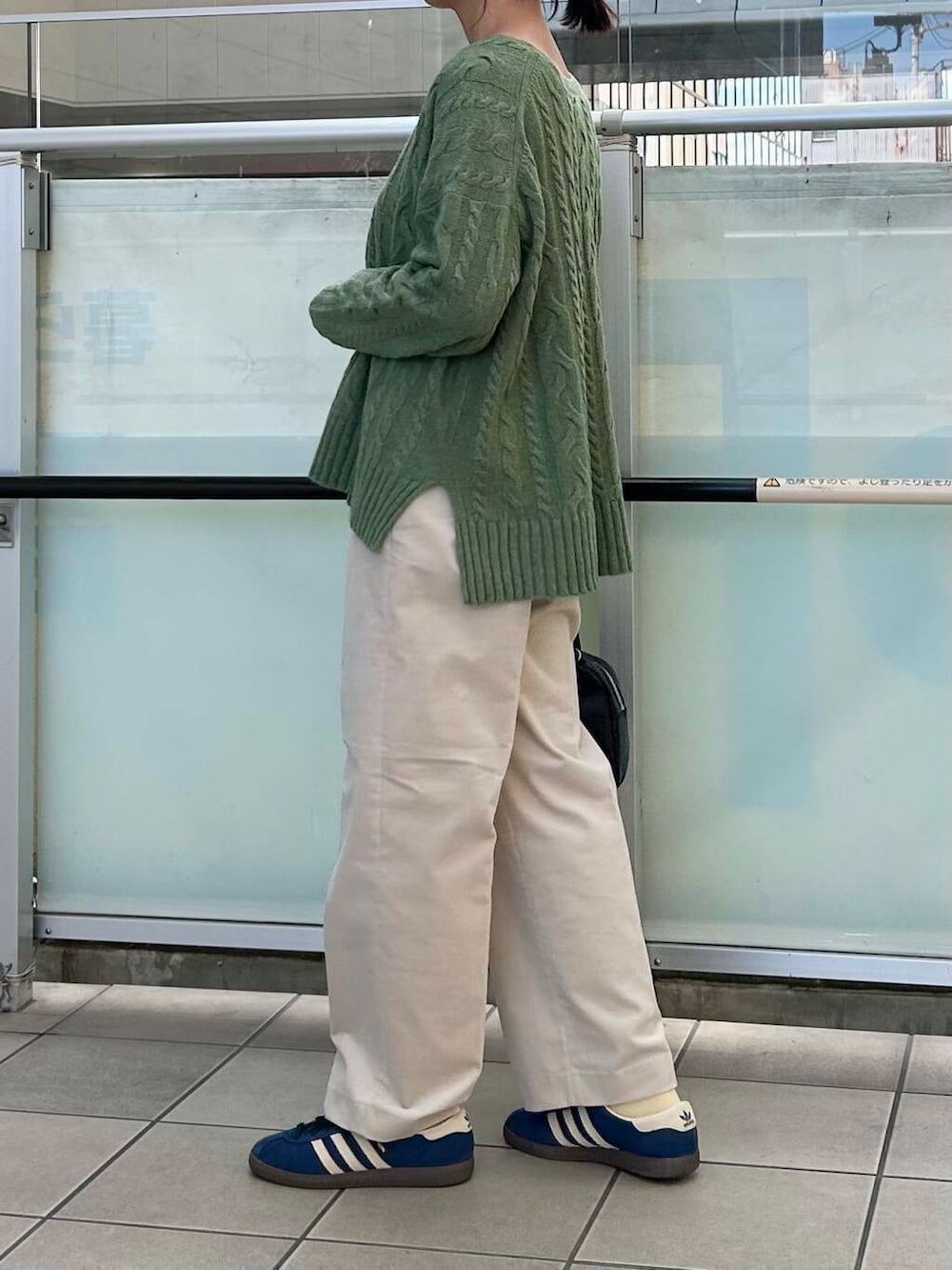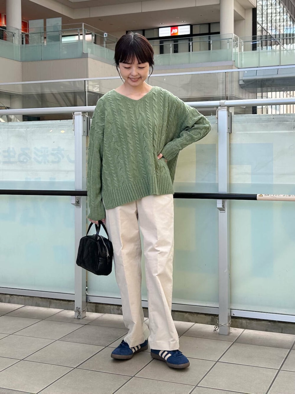 明るいグリーンをポイントにしたかったのでボトムはシンプルに合わせました。