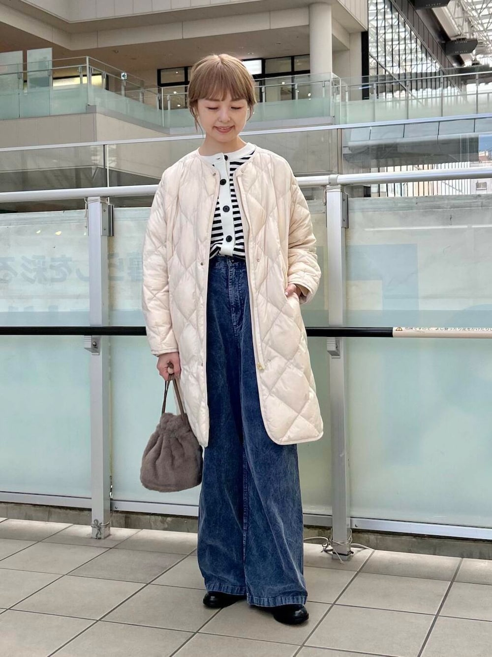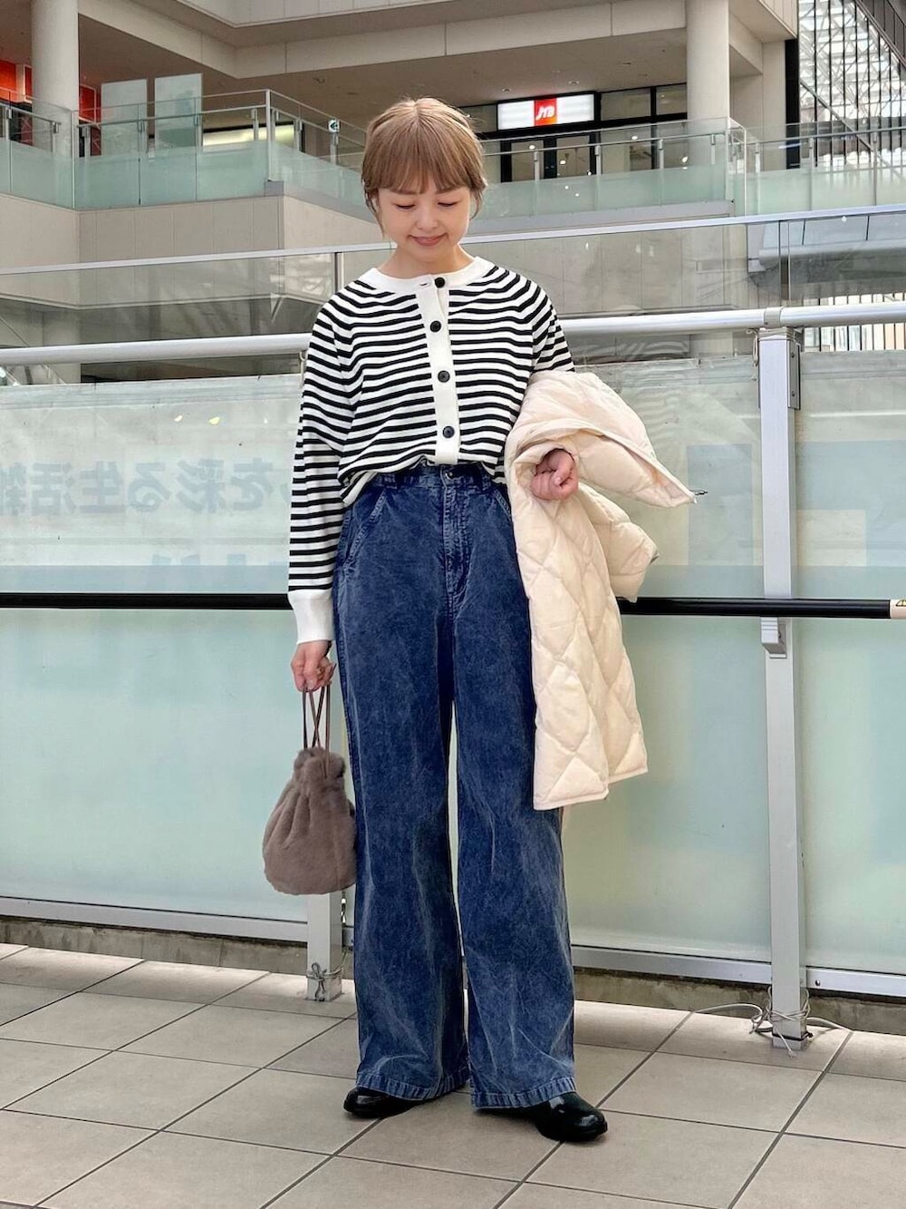 中はボーダーのニットカーディガンを合わせました。ボタンをとじてプルオーバーとして着てもかわいいです。