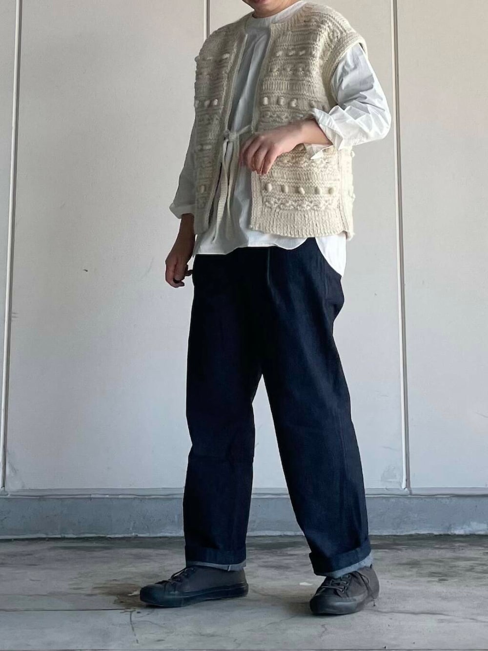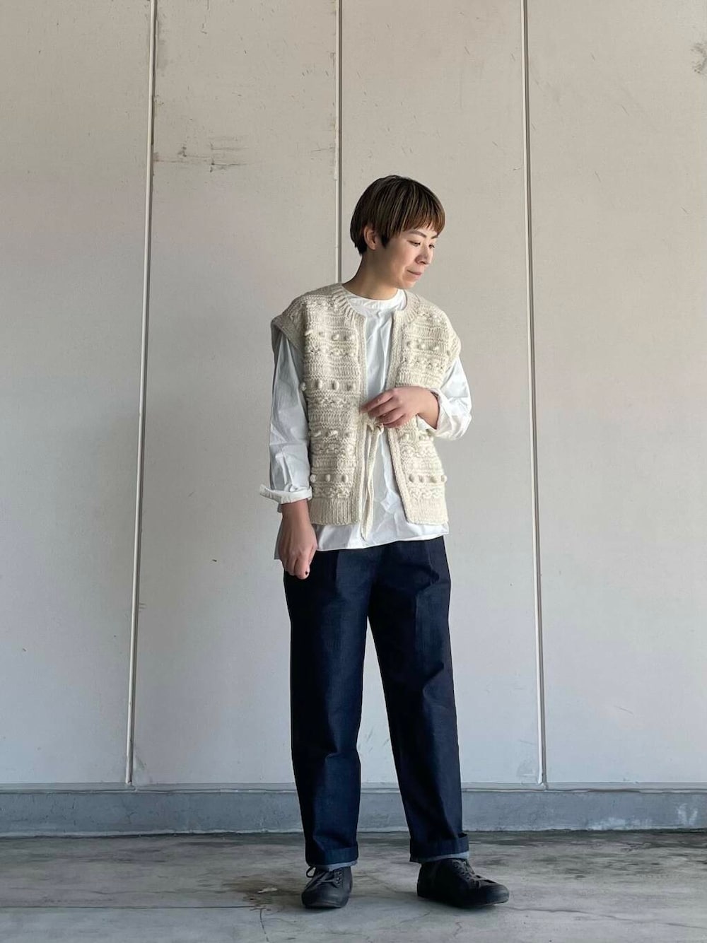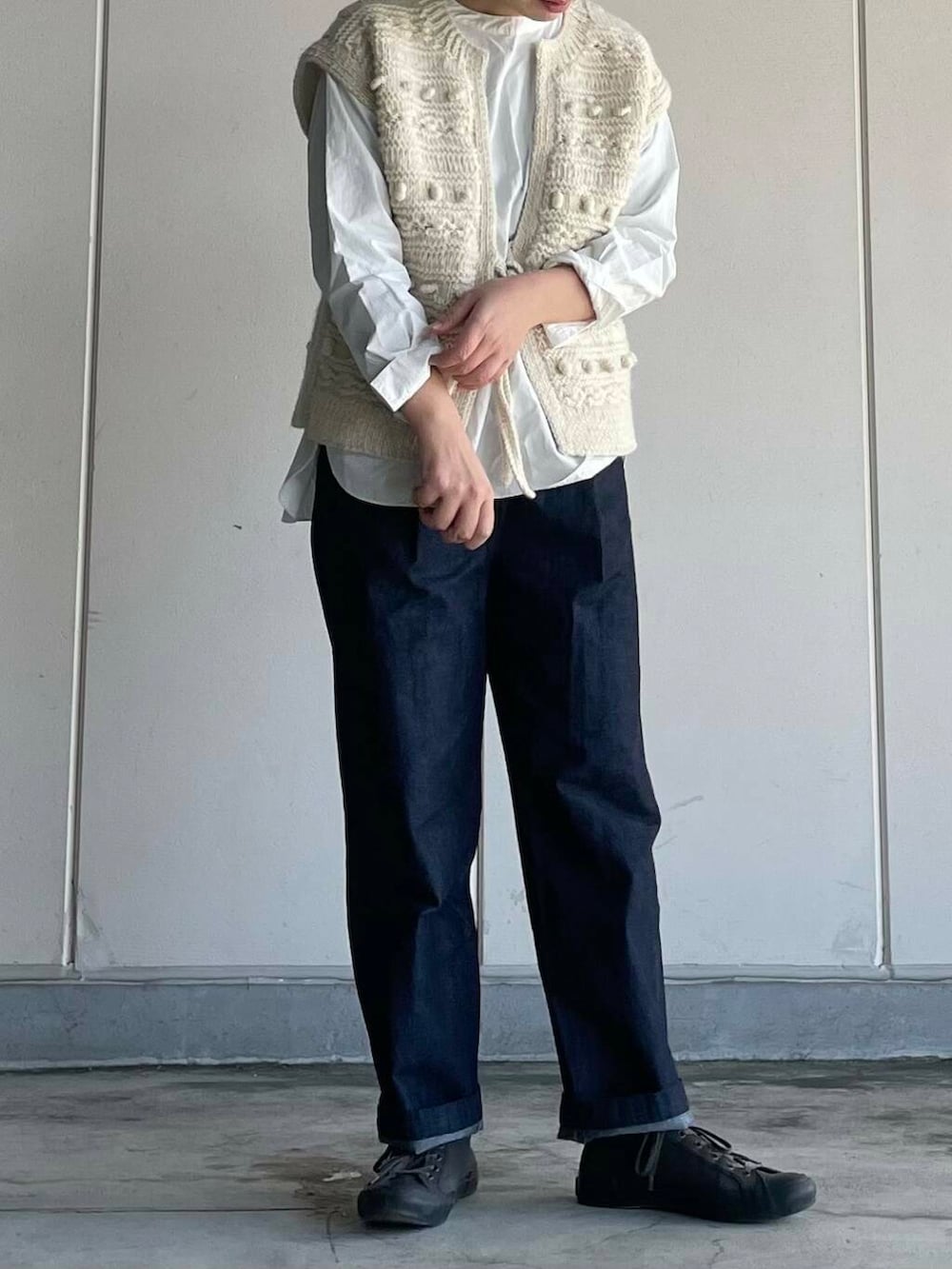 今回はブラウスにデニムのベーシックスタイルにベストを羽織ってアクセントに。
