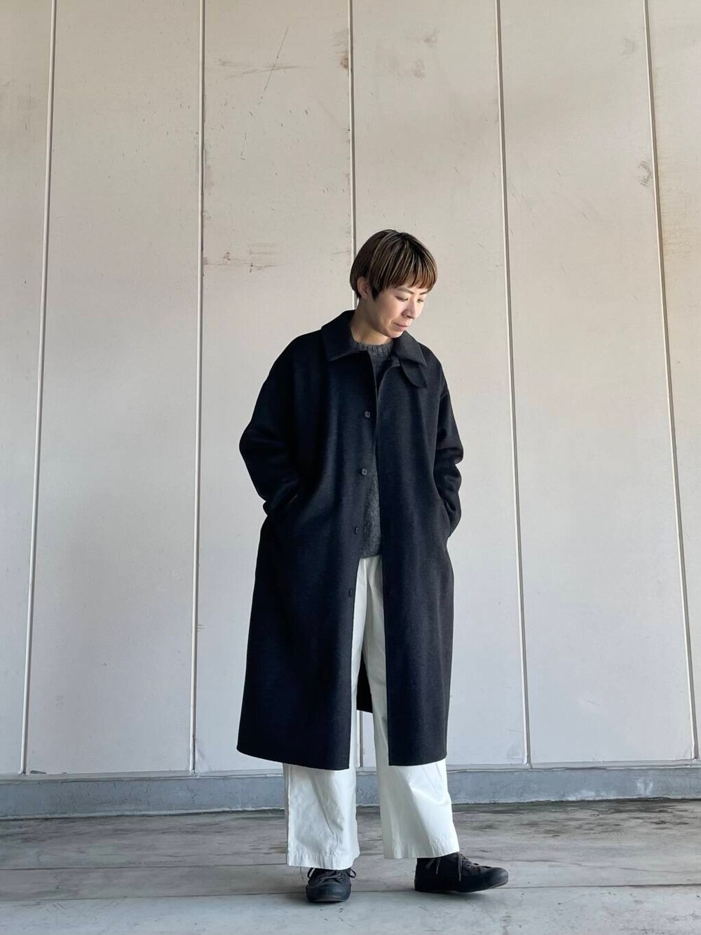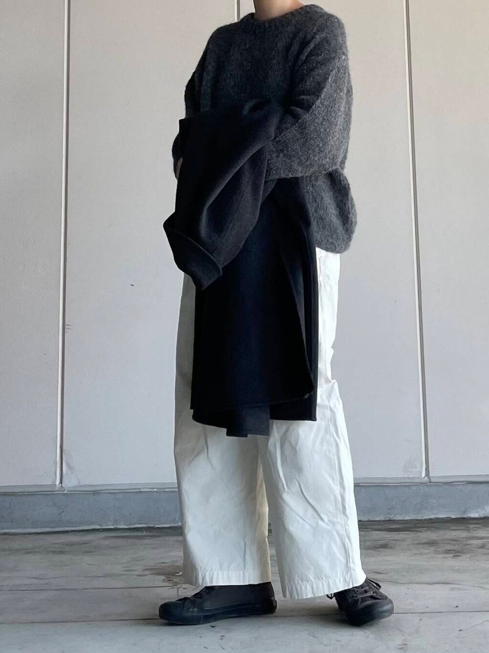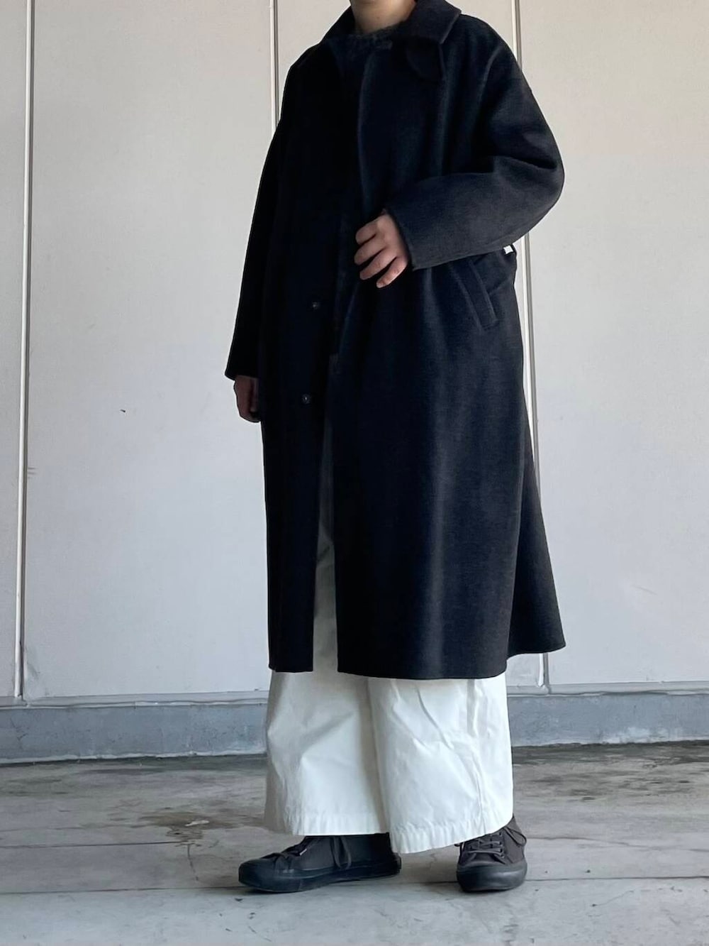 肩が落ちるシルエットで、やや長めの袖といったシンプルながらも細部にこだわっている1着。