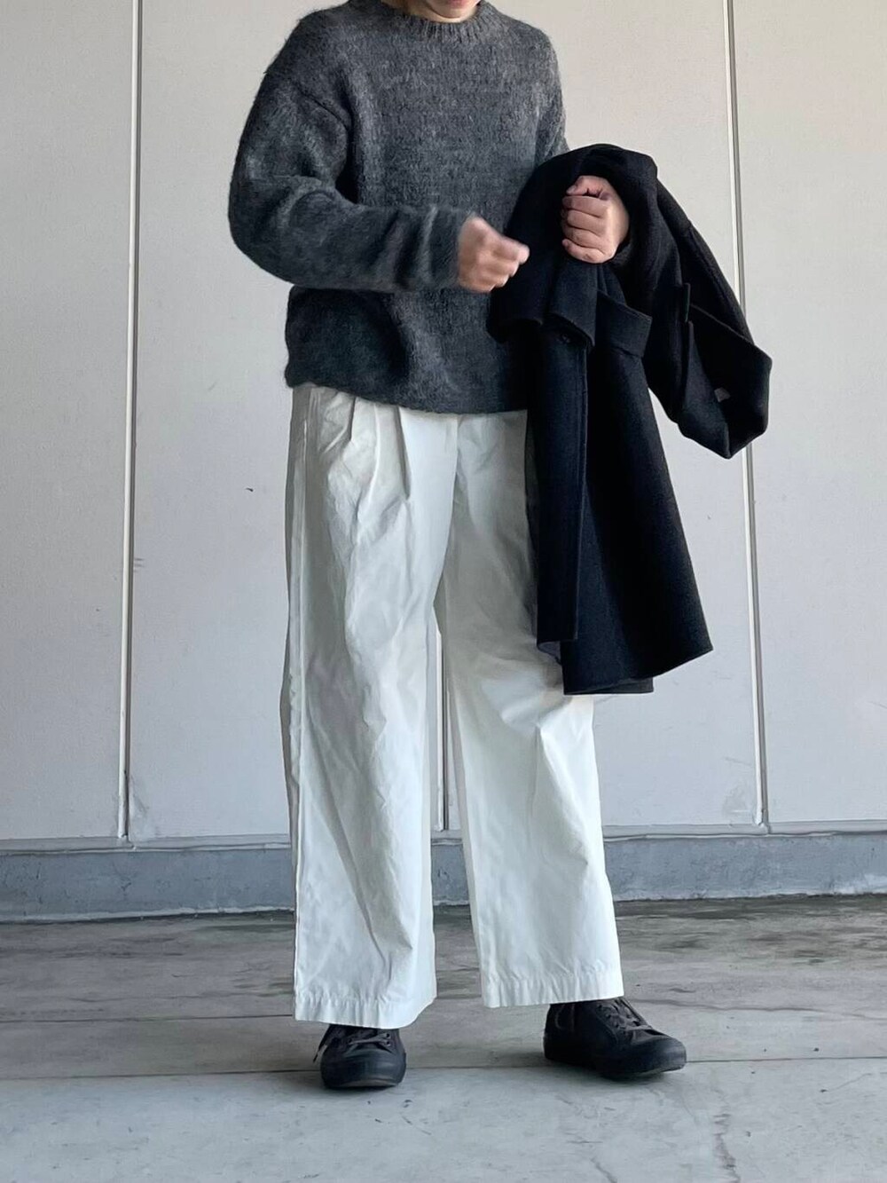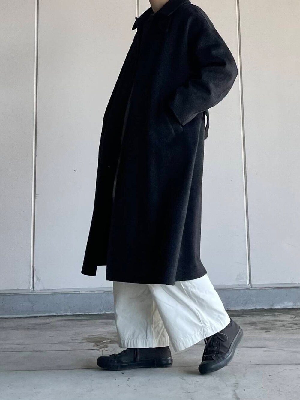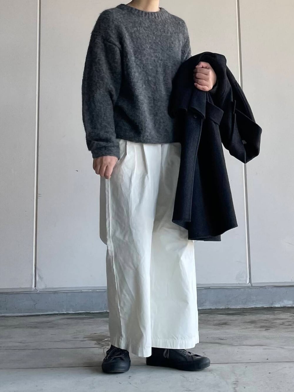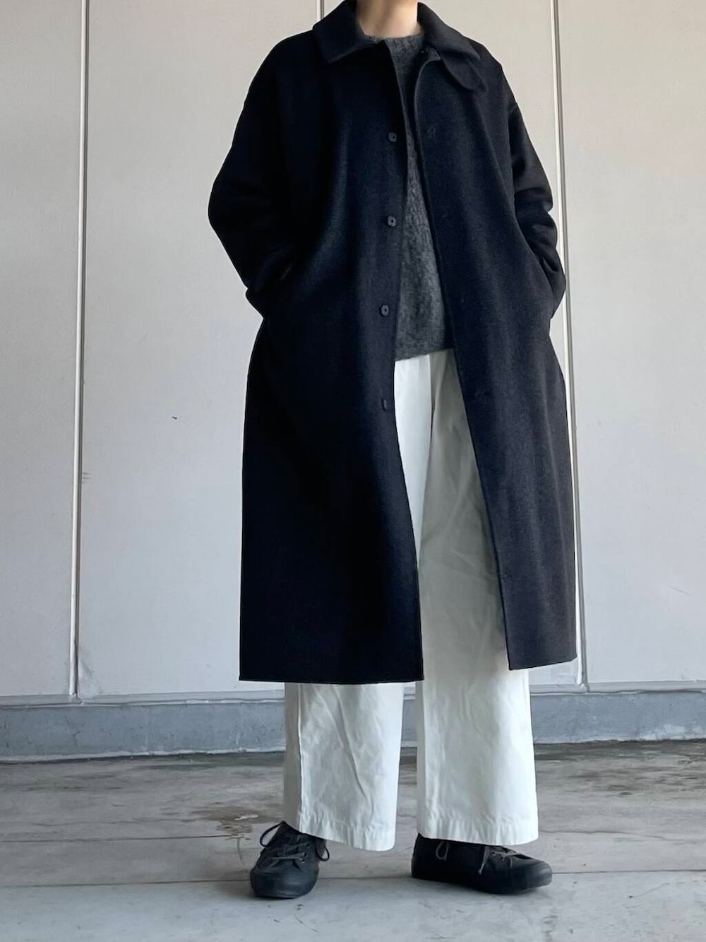 肩が落ちるシルエットで、やや長めの袖といったシンプルながらも細部にこだわっている1着。