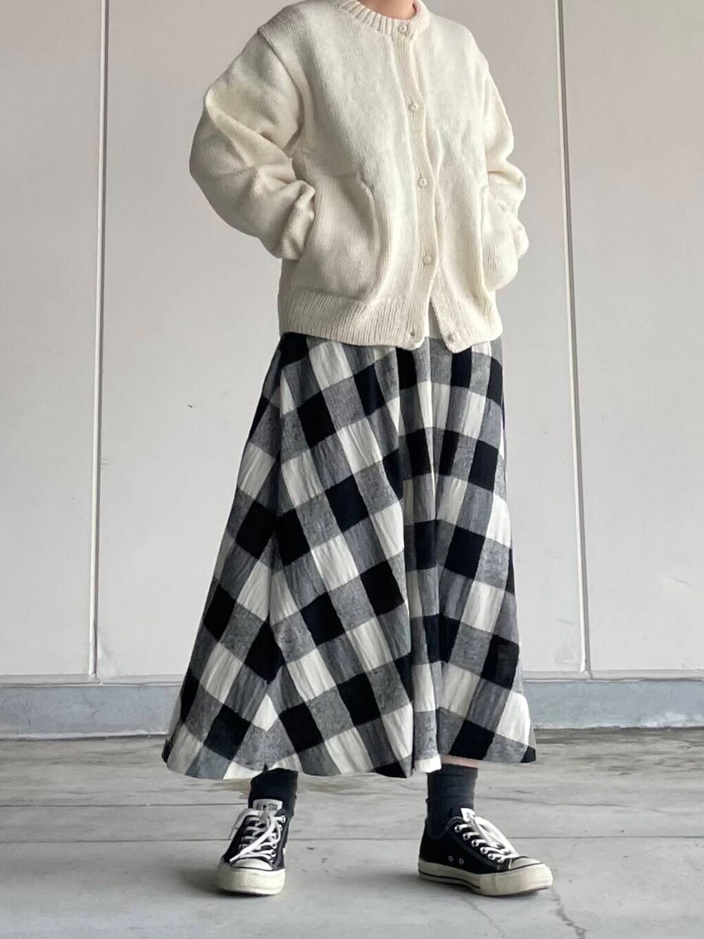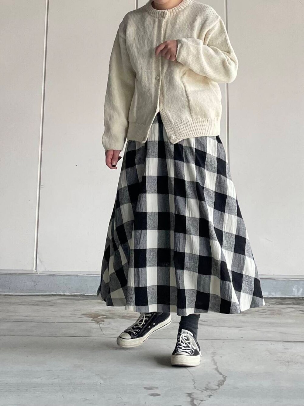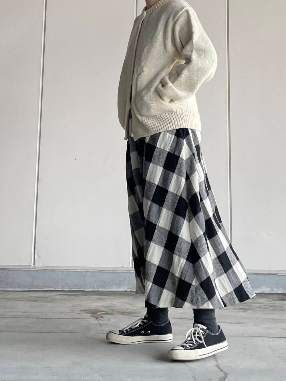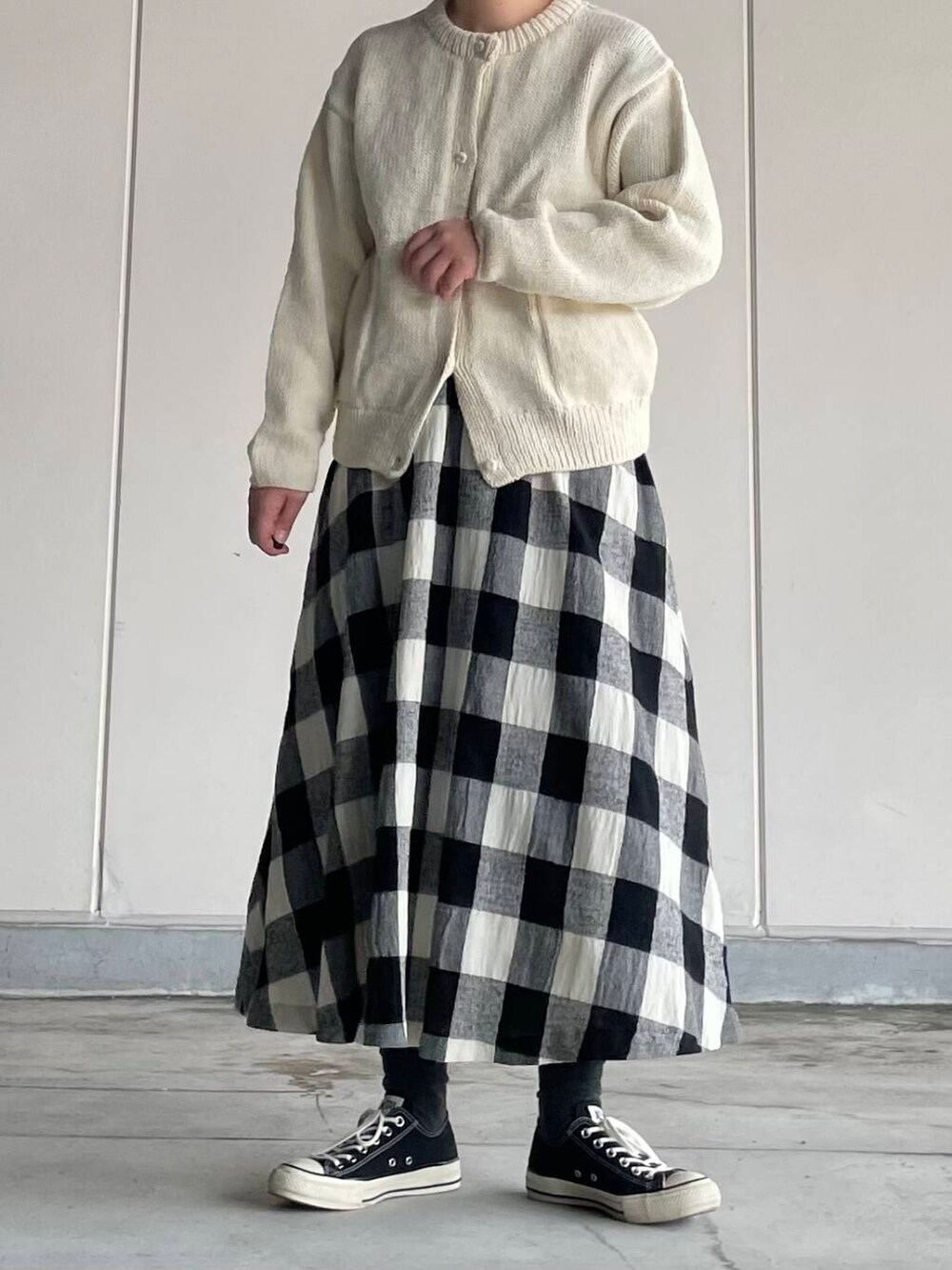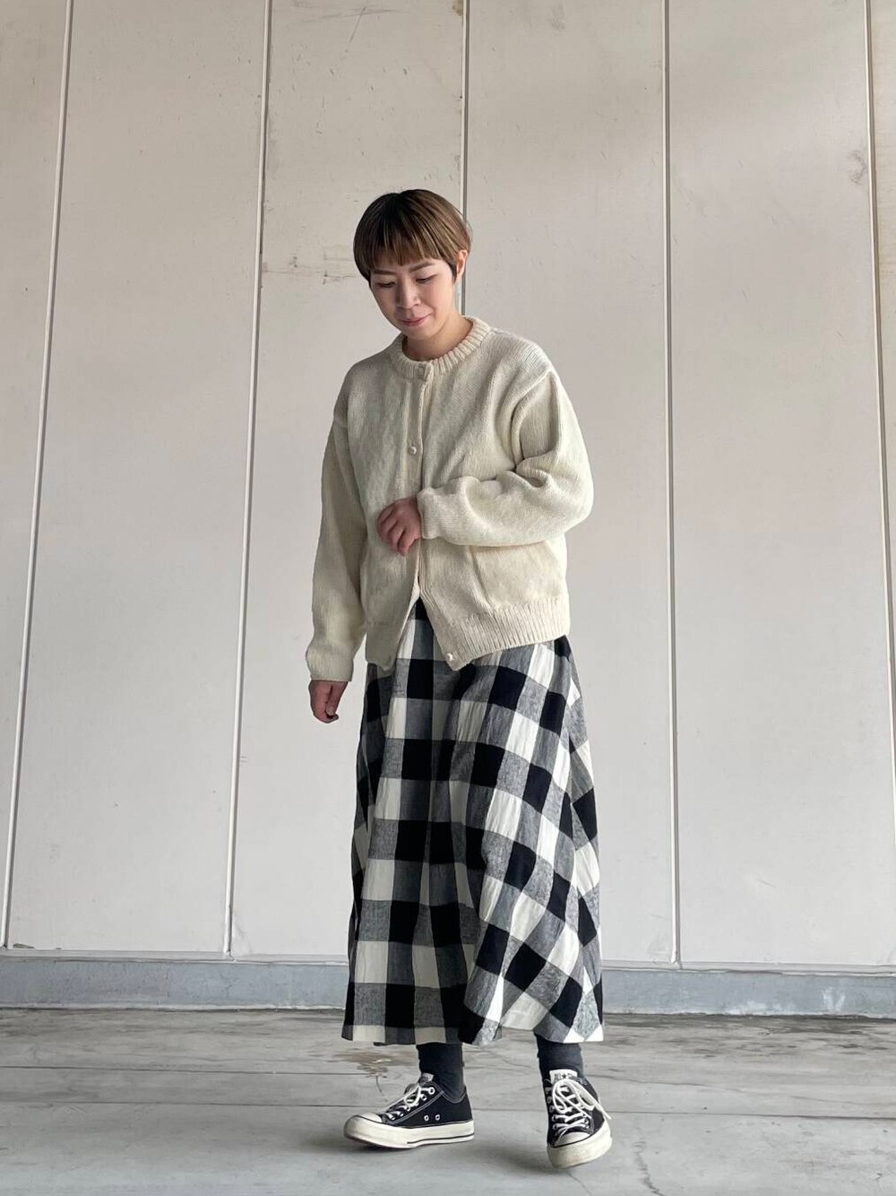 柄もののスカートとあわせて、アクセントの効いた大人のナチュラルスタイルに。