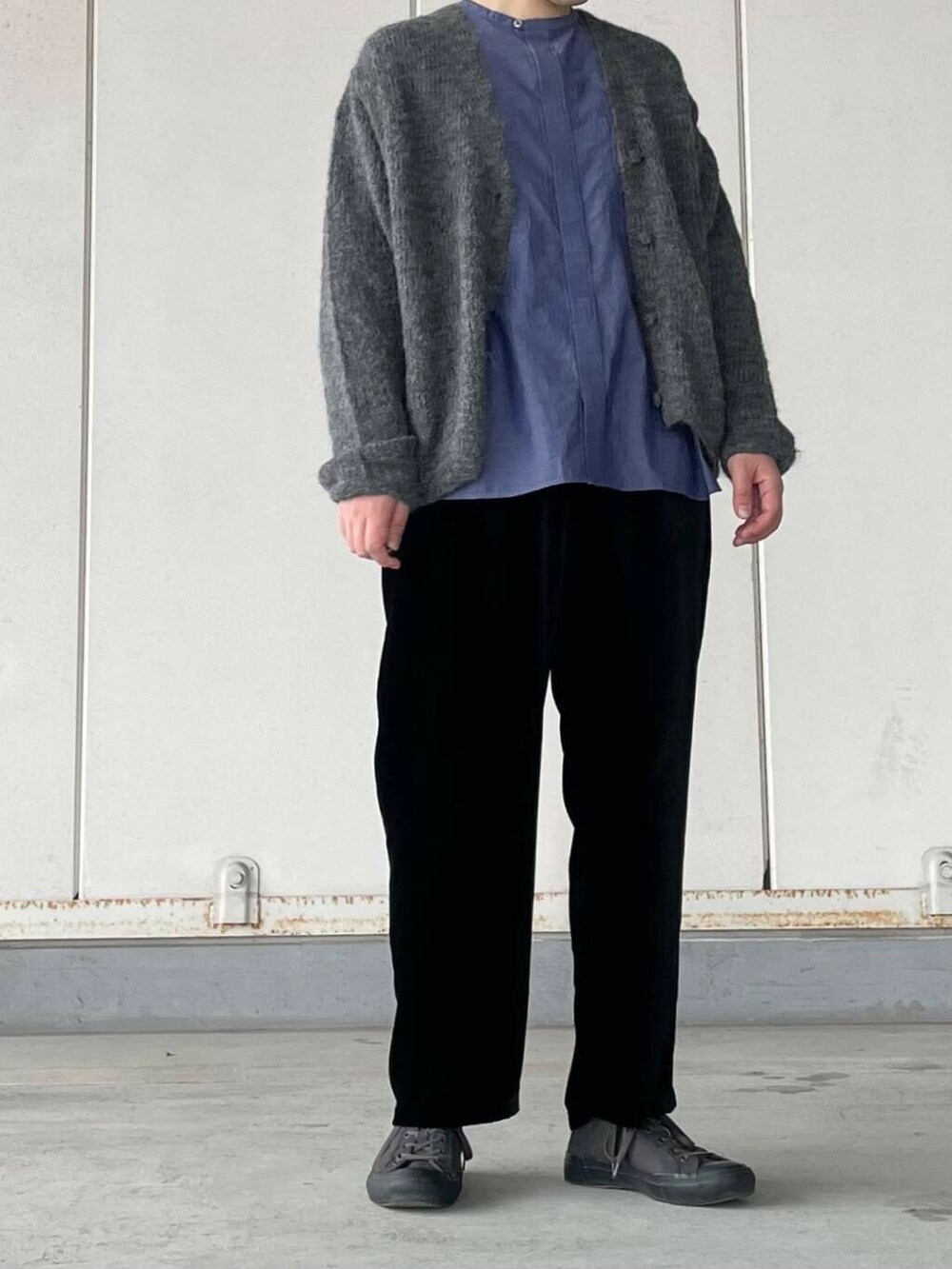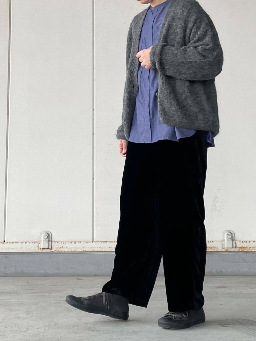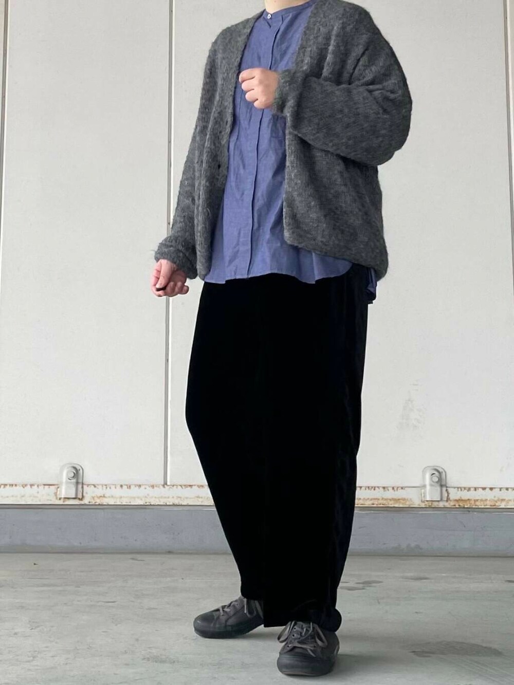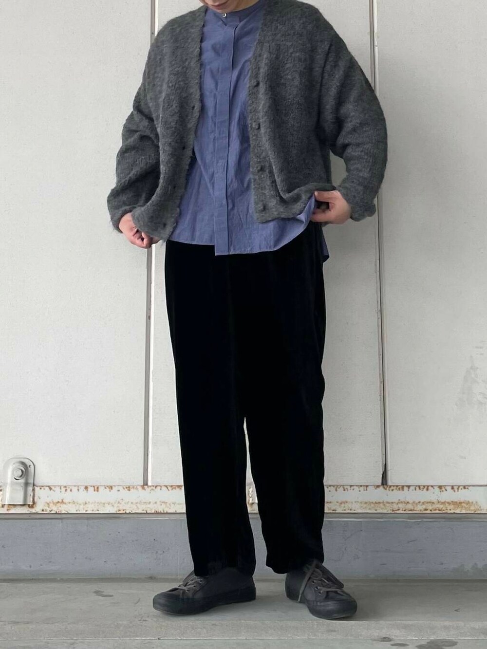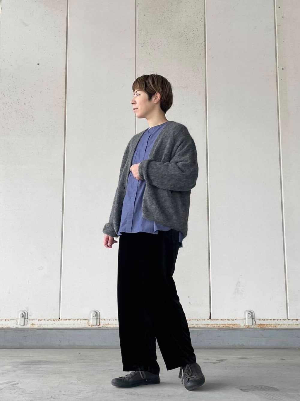 パンツはマットな質感と上品な光沢感がポイントです。からだの線を拾わないベルベット特有の落ち感がきれいです◎