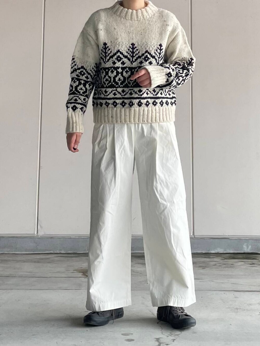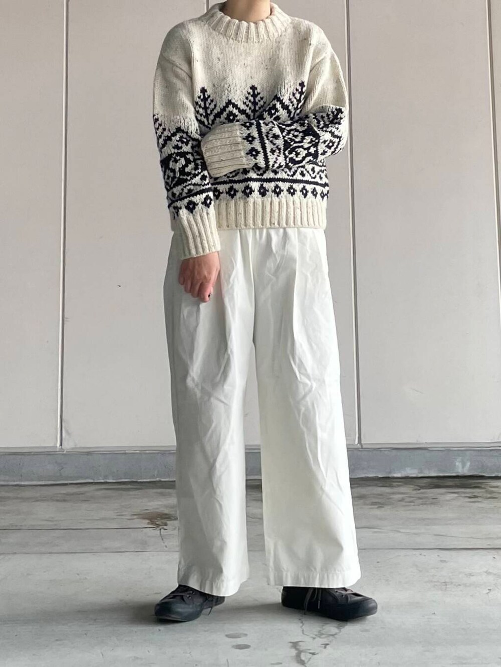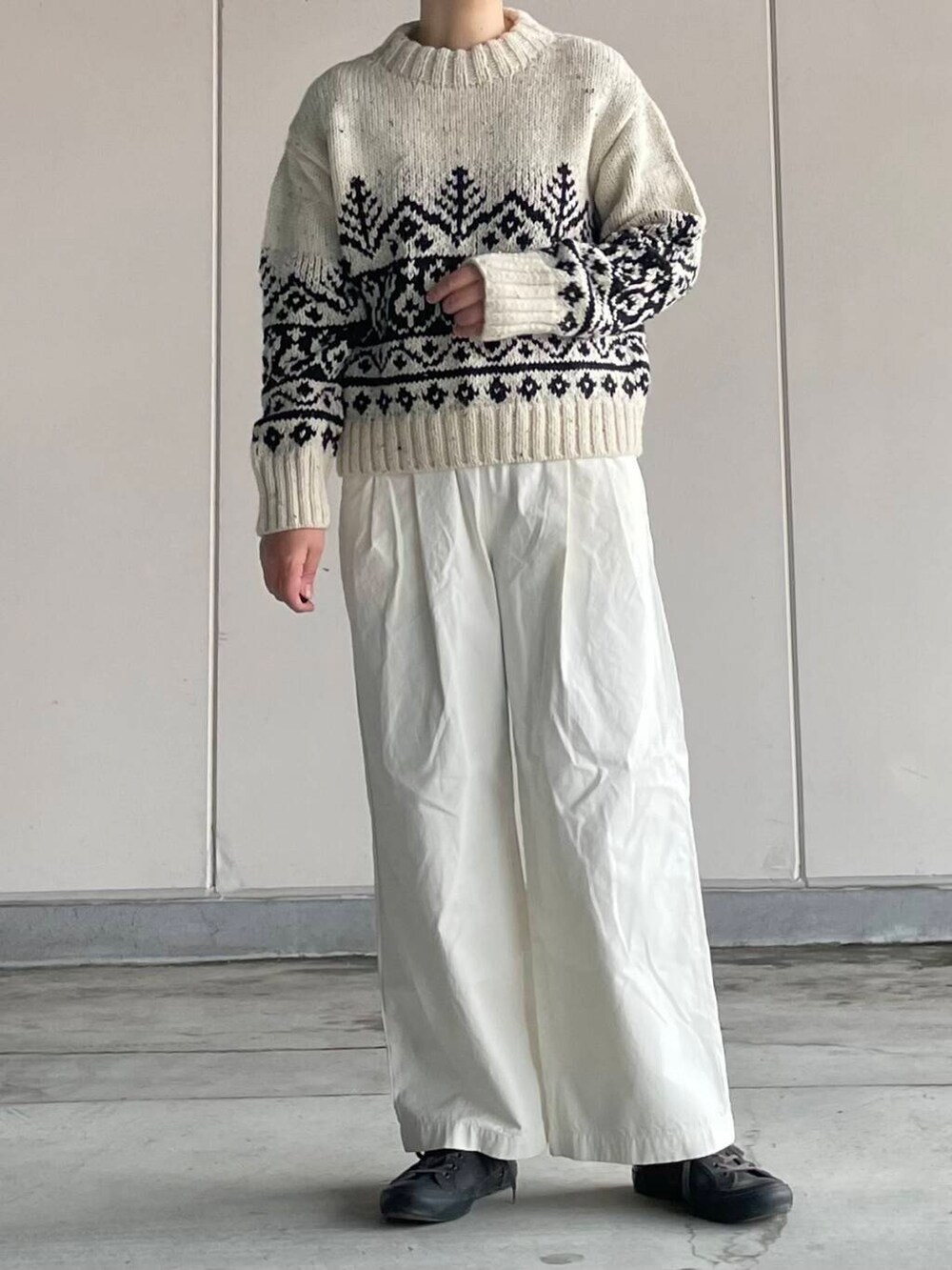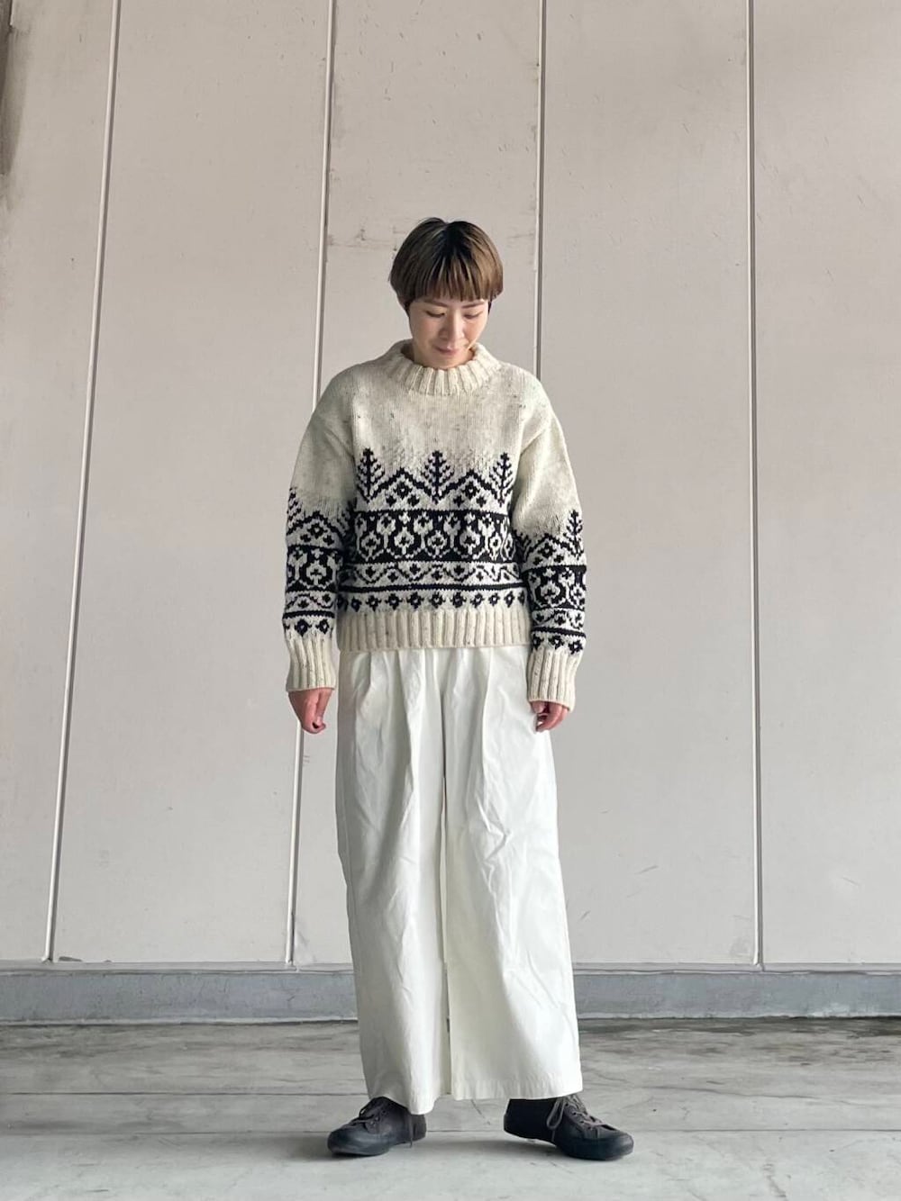 ニットは編み柄がかわいく、無地の部分のネップの色みが魅力的です。