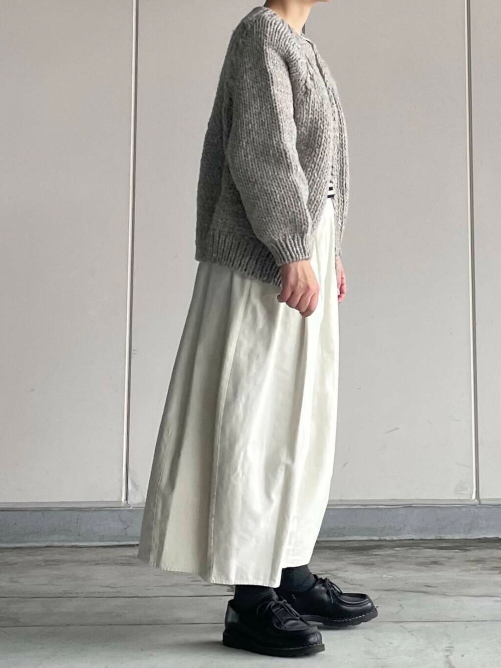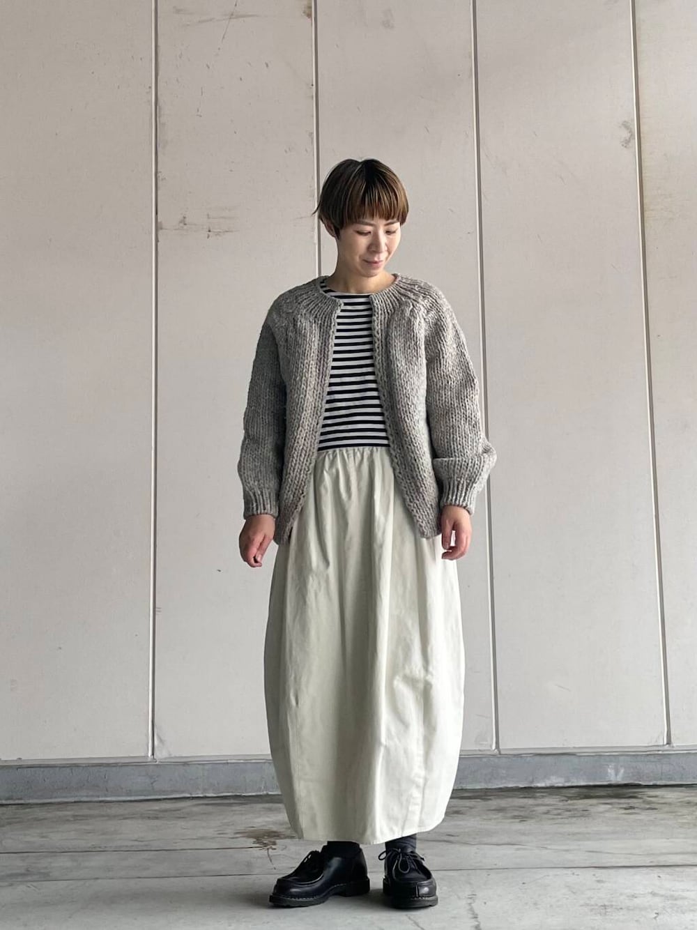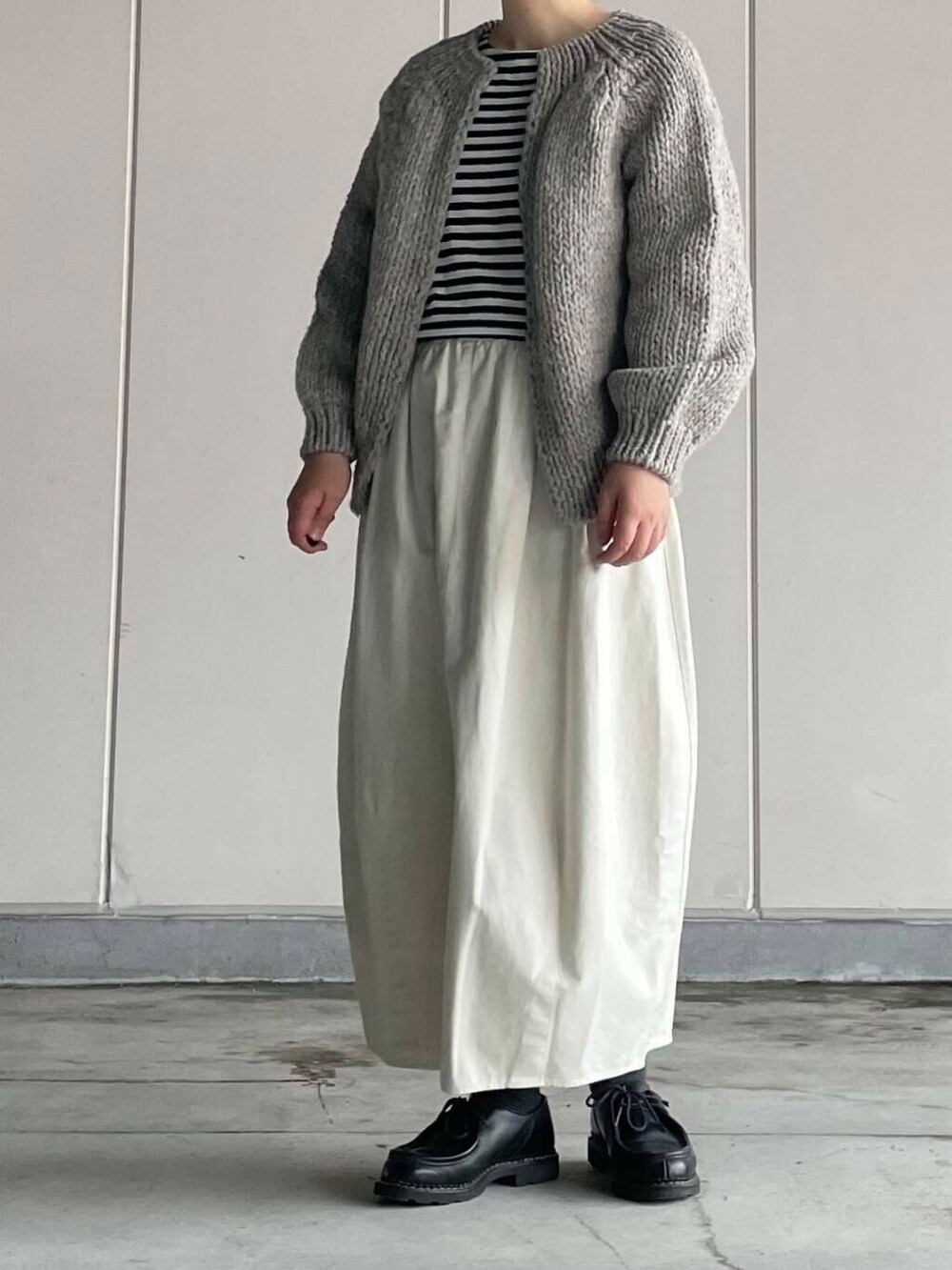 かぐれのニットカーディガンを羽織った大人のナチュラルスタイルです。