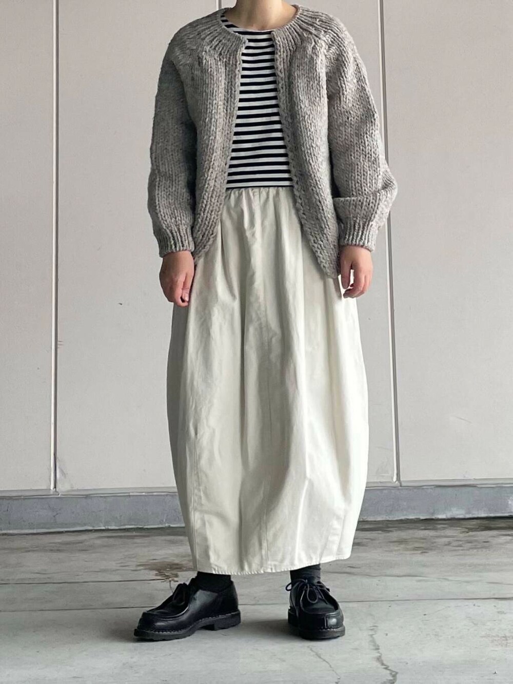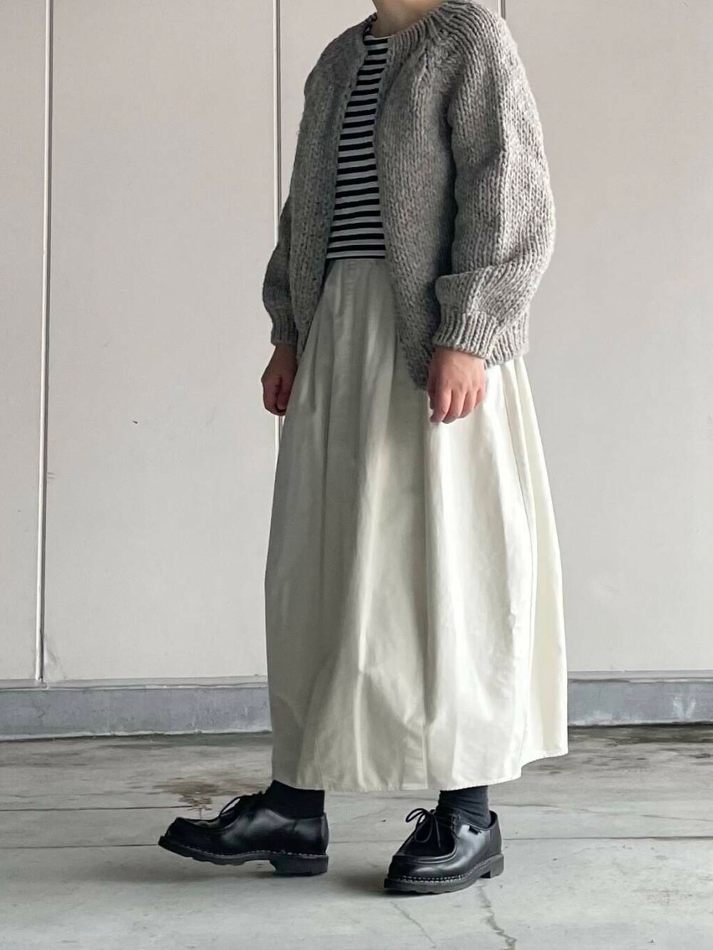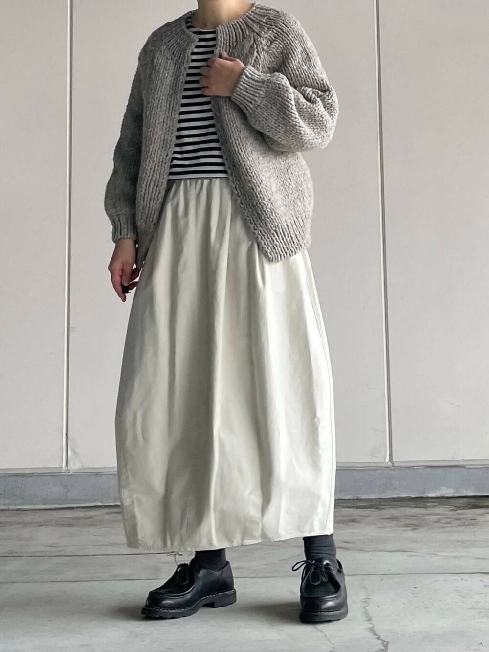 かぐれのニットカーディガンを羽織った大人のナチュラルスタイルです。