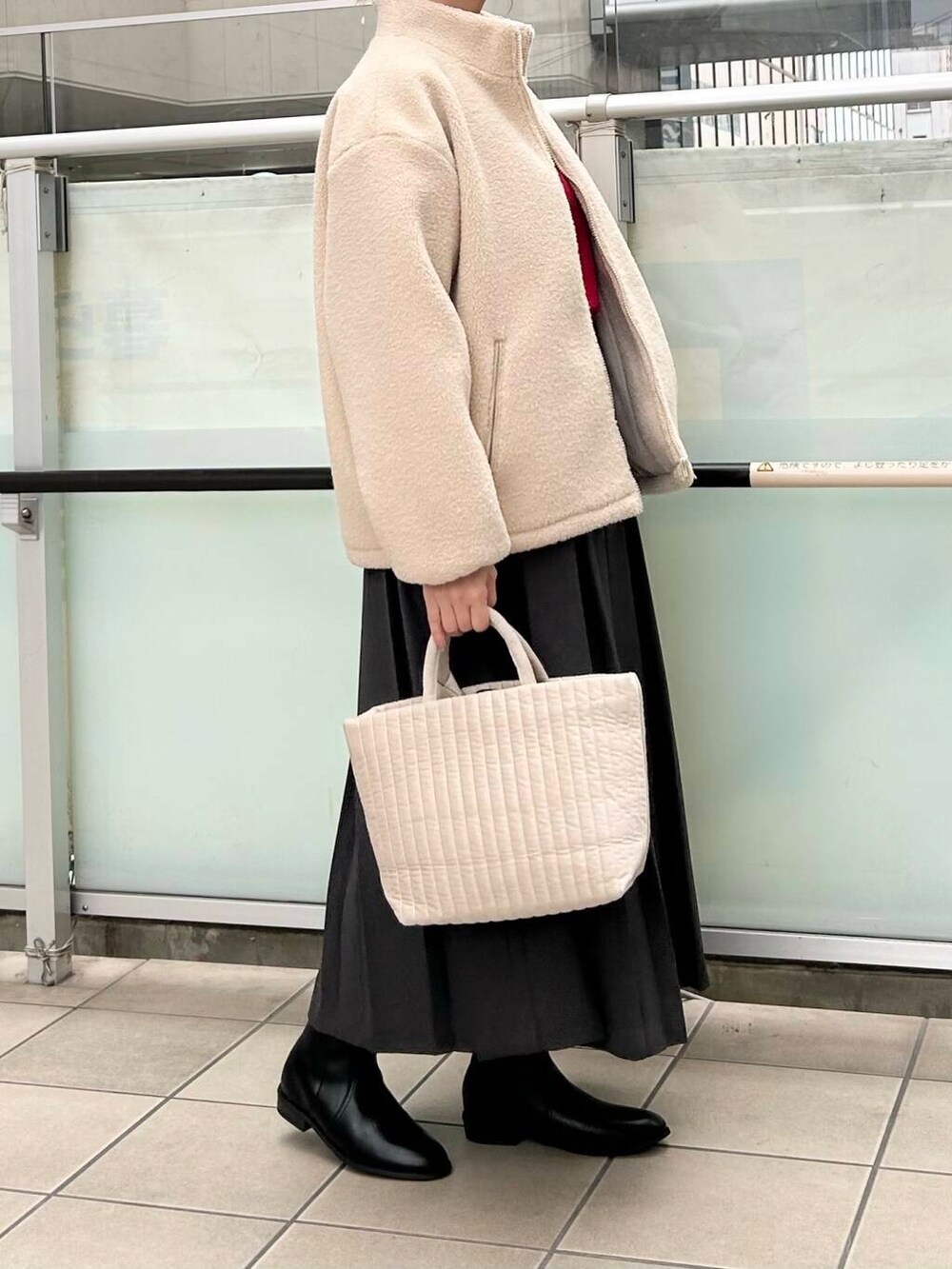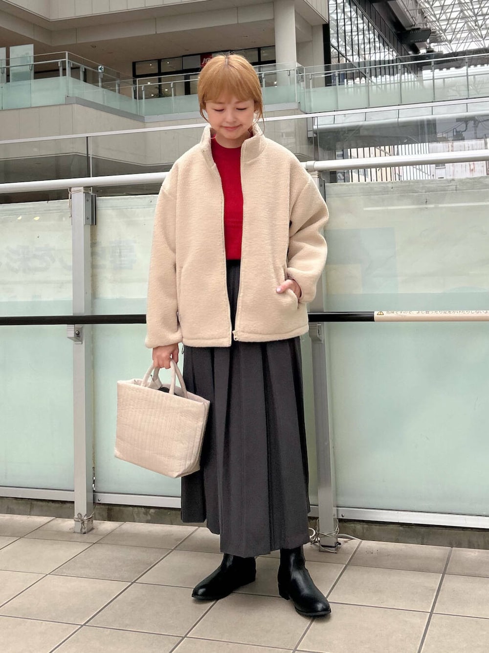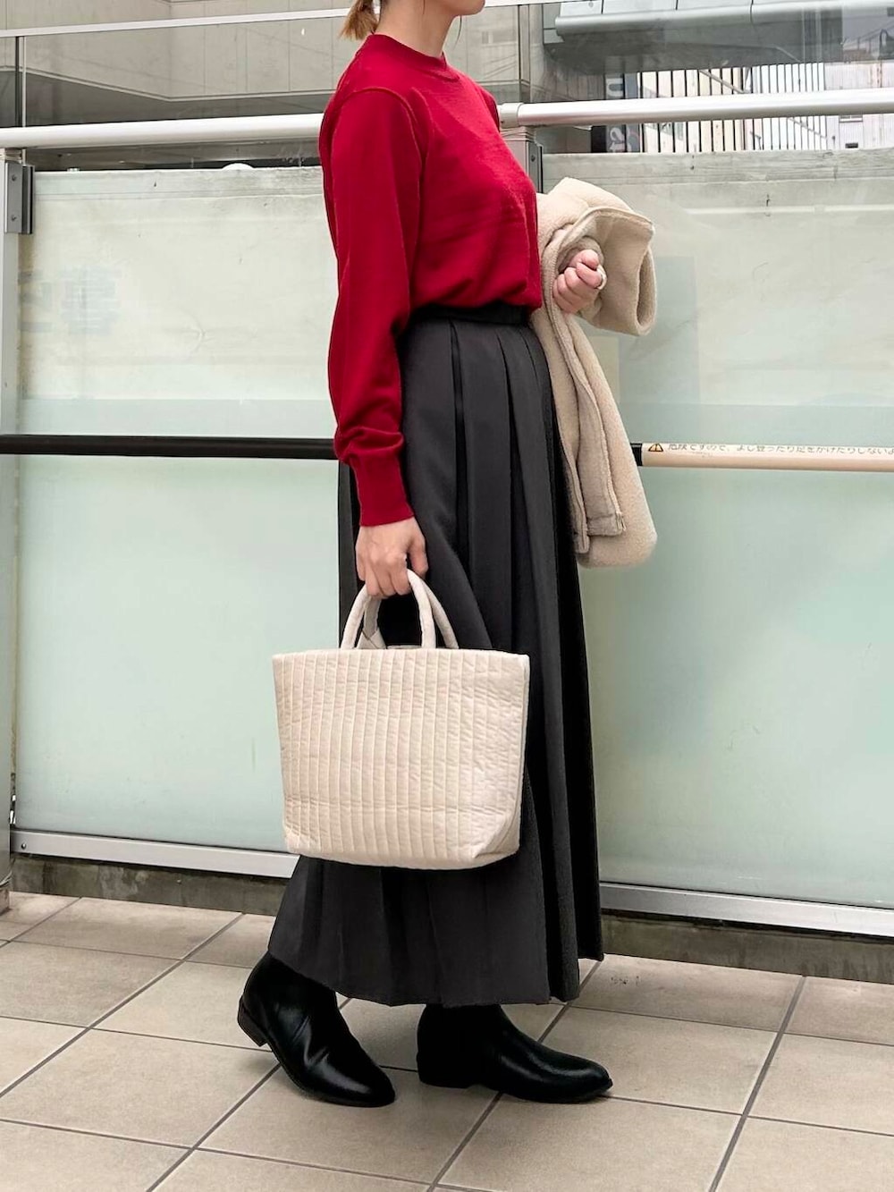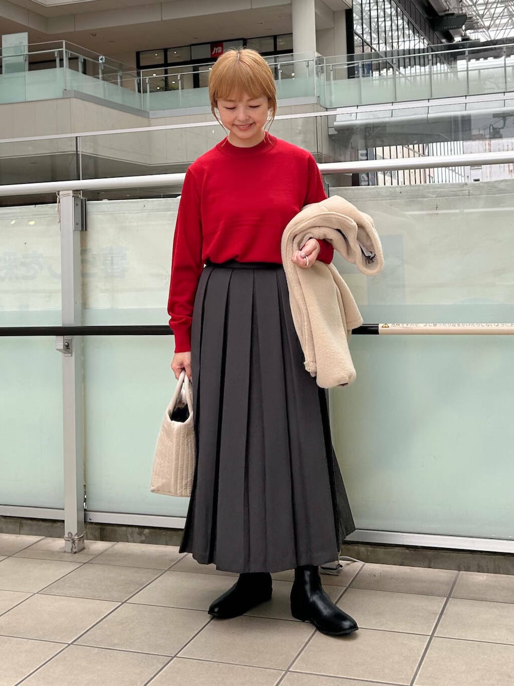 中に赤のニットを合わせてホリデーを意識しました。