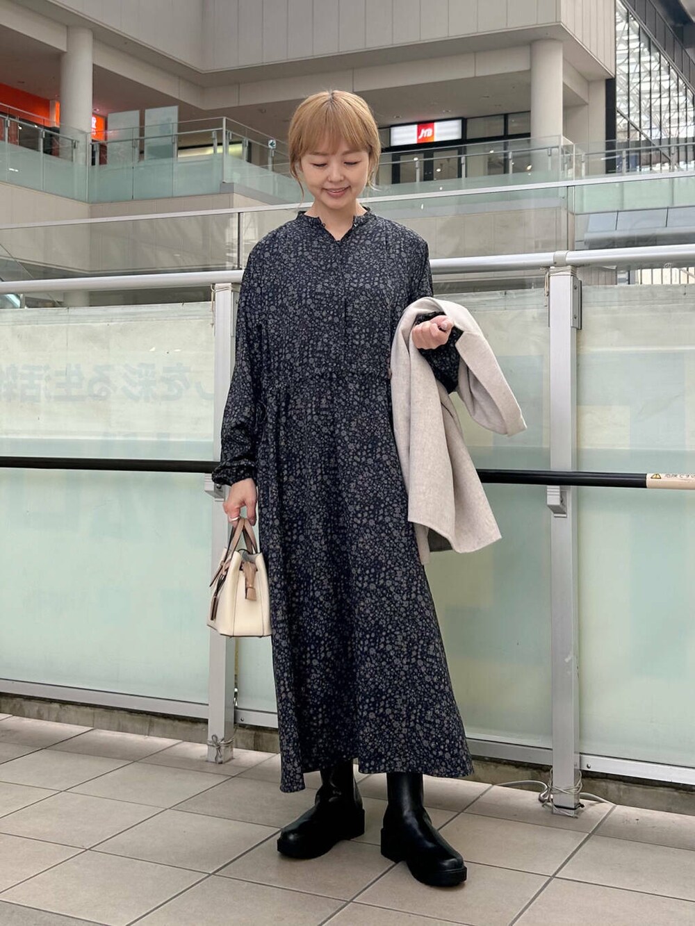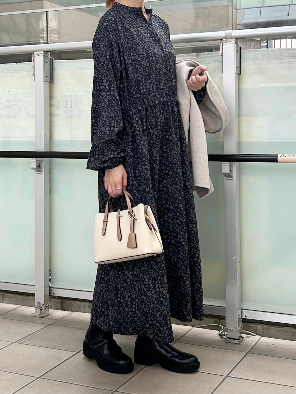 ワンピースはサラッとした生地で重ね着もしやすく中にタートルネックを着たり、上からカーディガンを羽織ったりとできるので長い時期着られます。