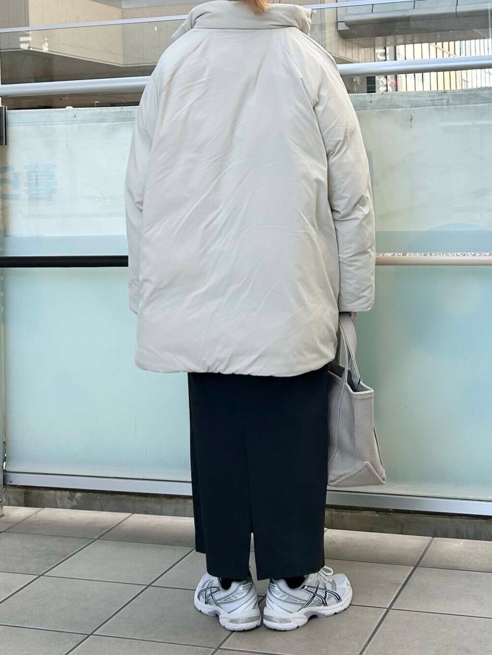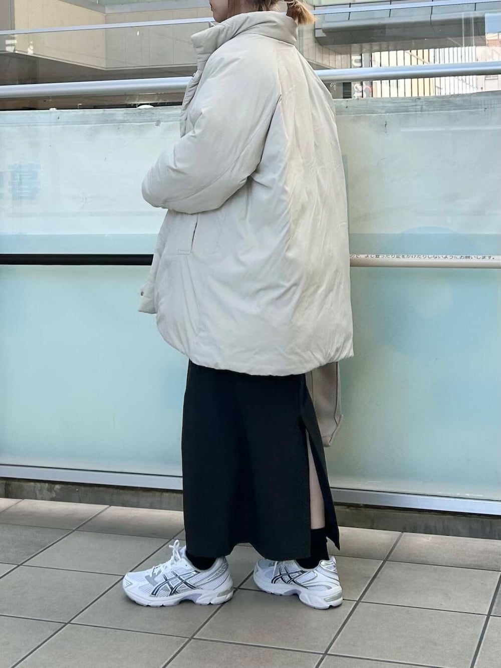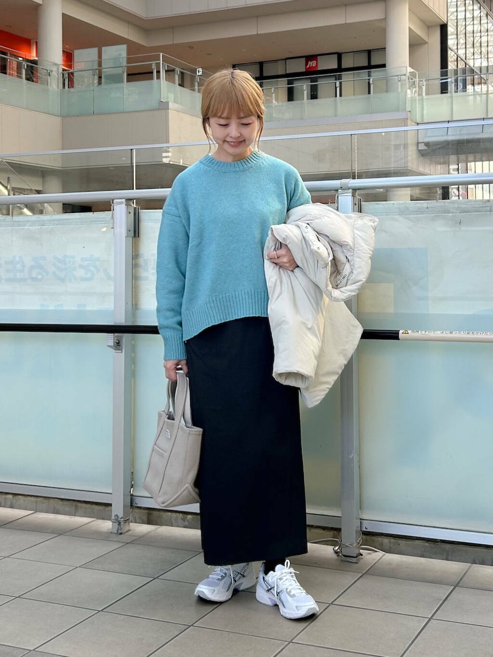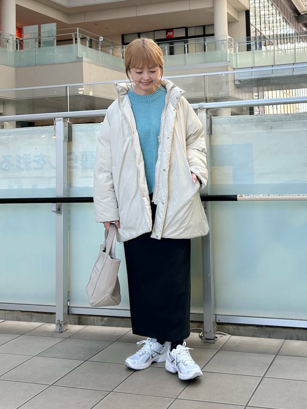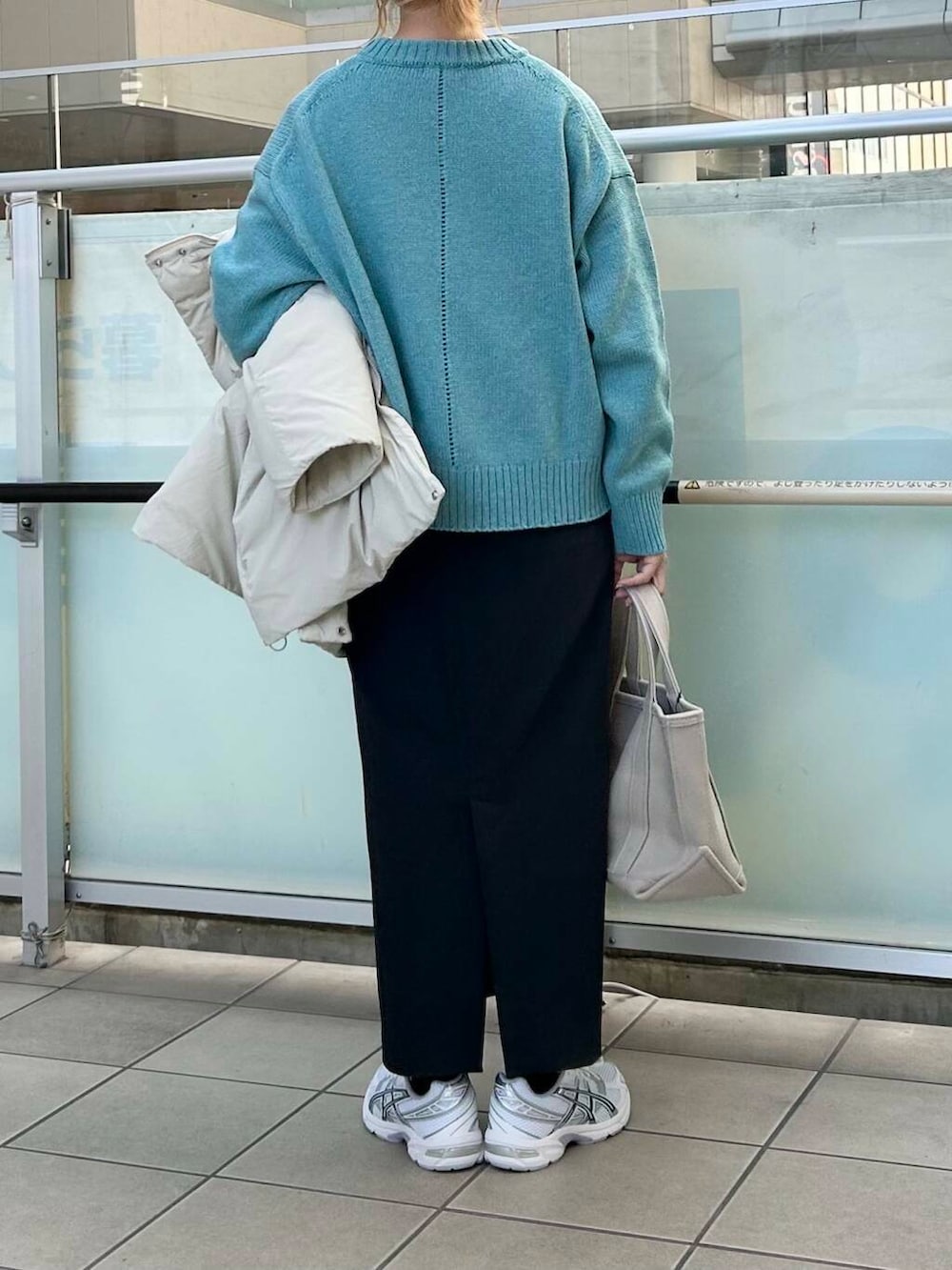アウターもニットもボリュームがあるのでスカートはタイトなものを合わせました。