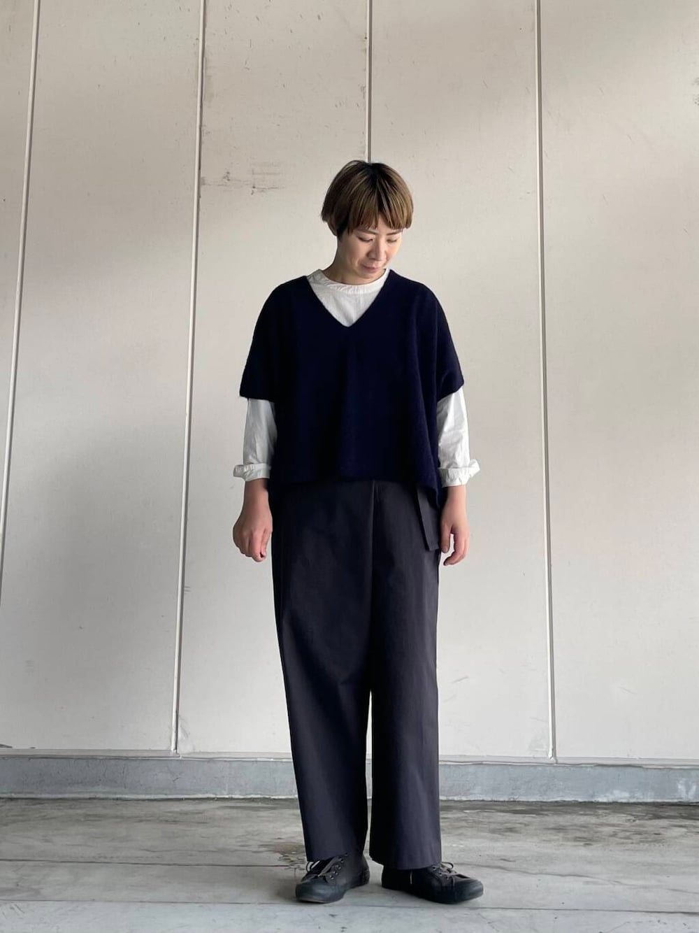 ベストとパンツをダークトーンの色合わせで統一感のある装いに。