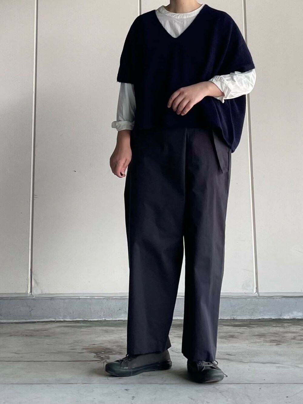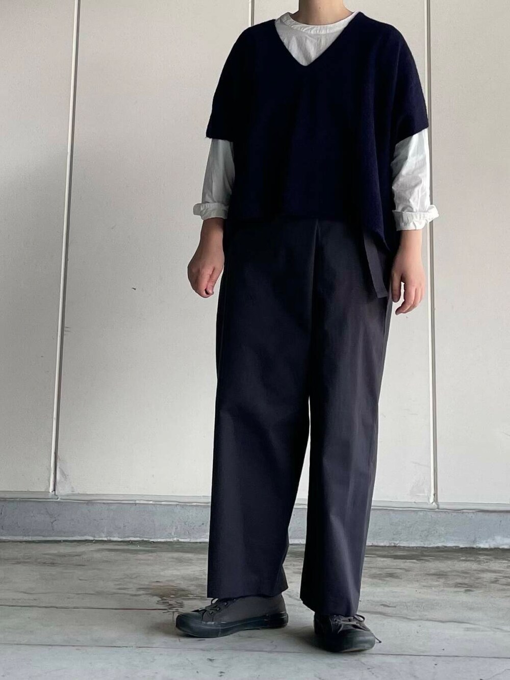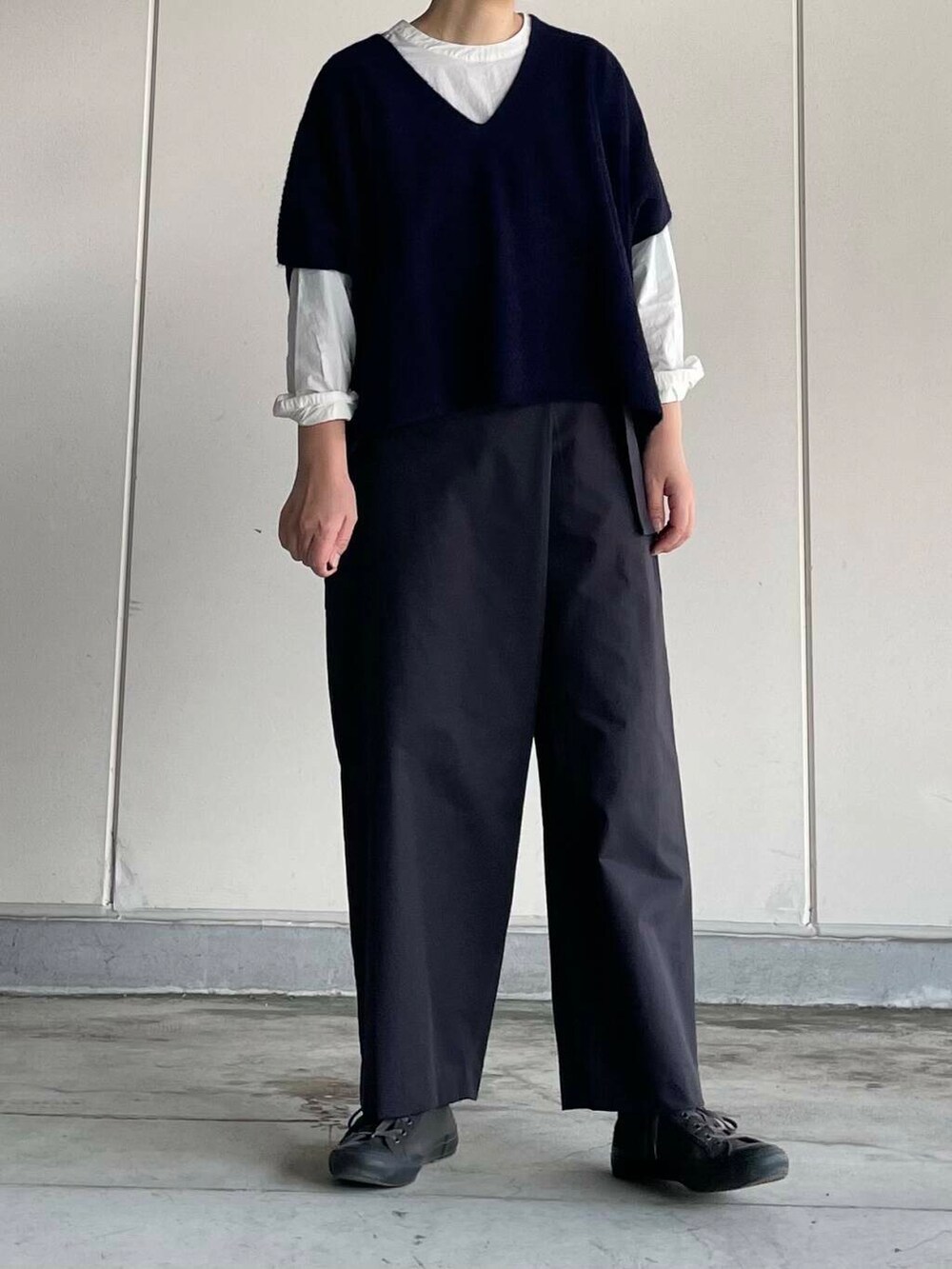 すっきりしたVネックの大人シンプルなワイドシルエットのベストです。