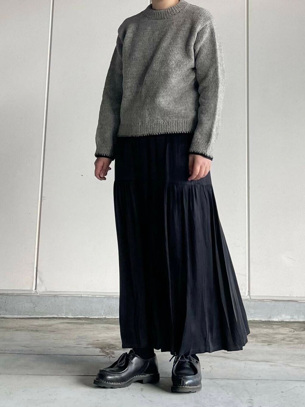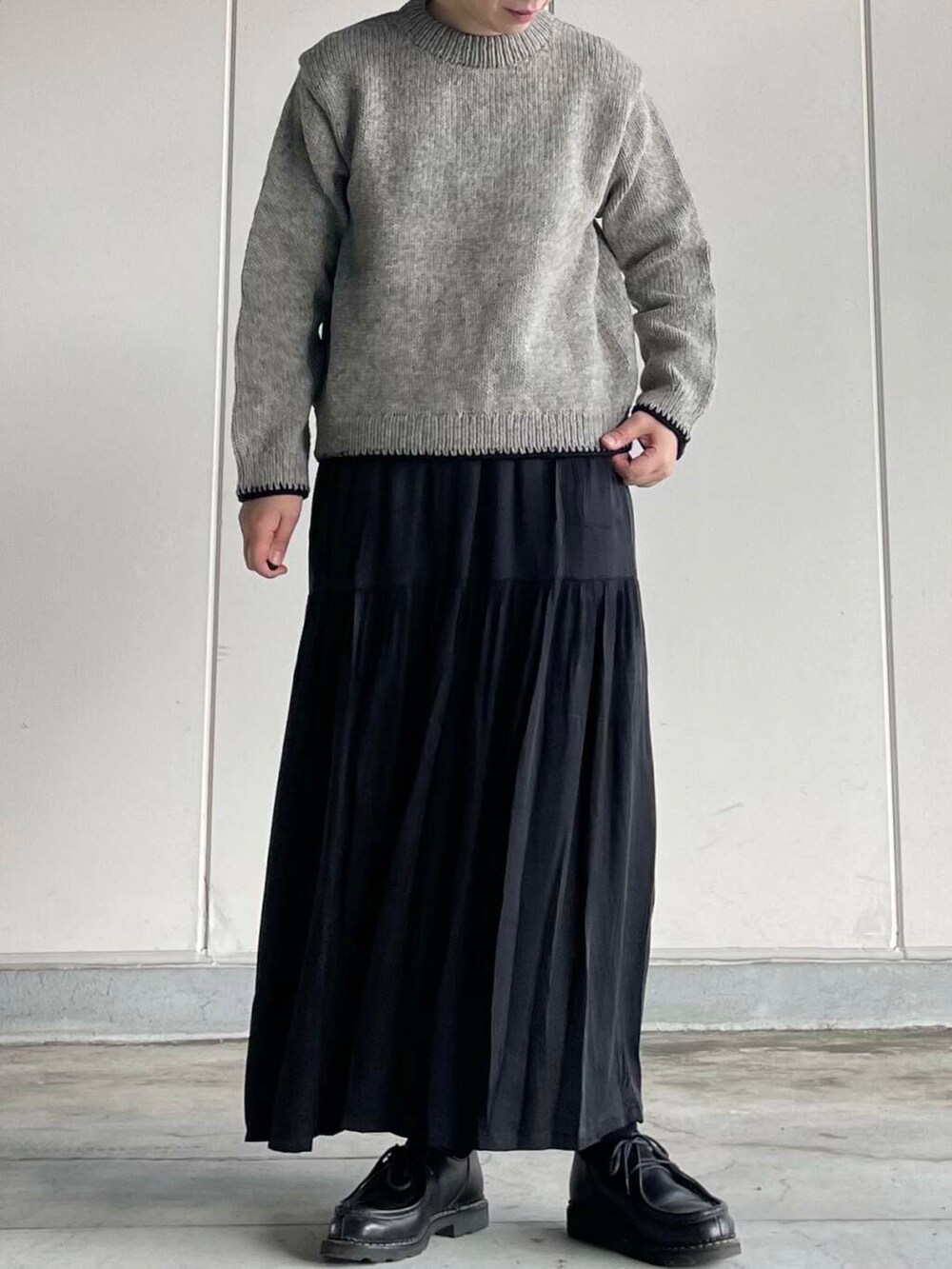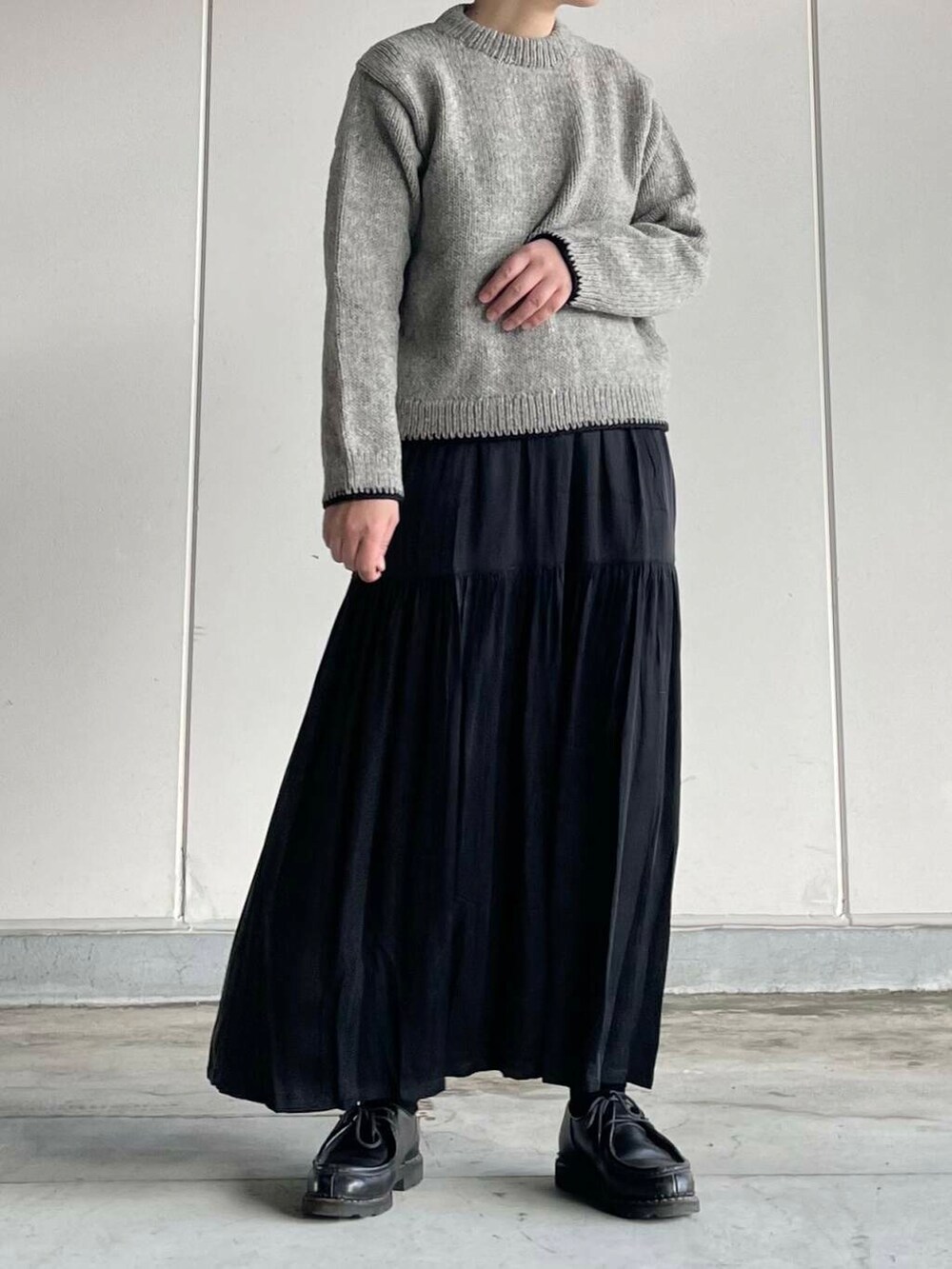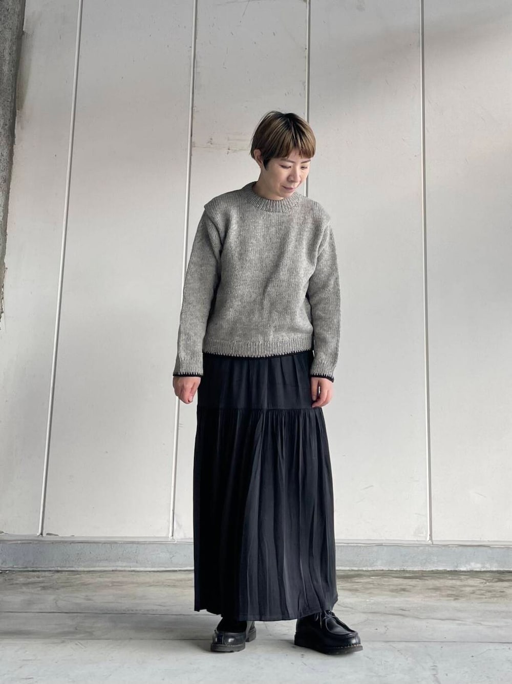 シンプルなニットに落ち感のキレイなスカートをあわせて大人の装いに。
