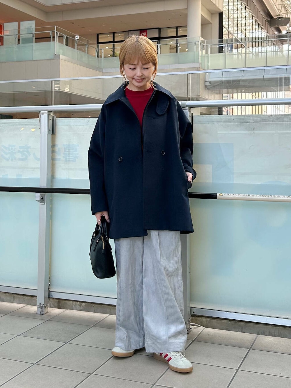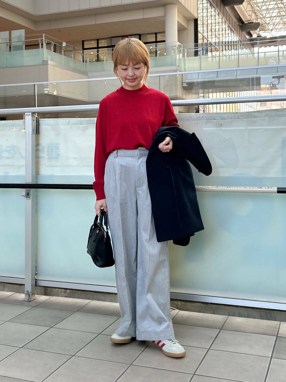 シンプルなコーディネートですがニットの赤をポイントにしました。