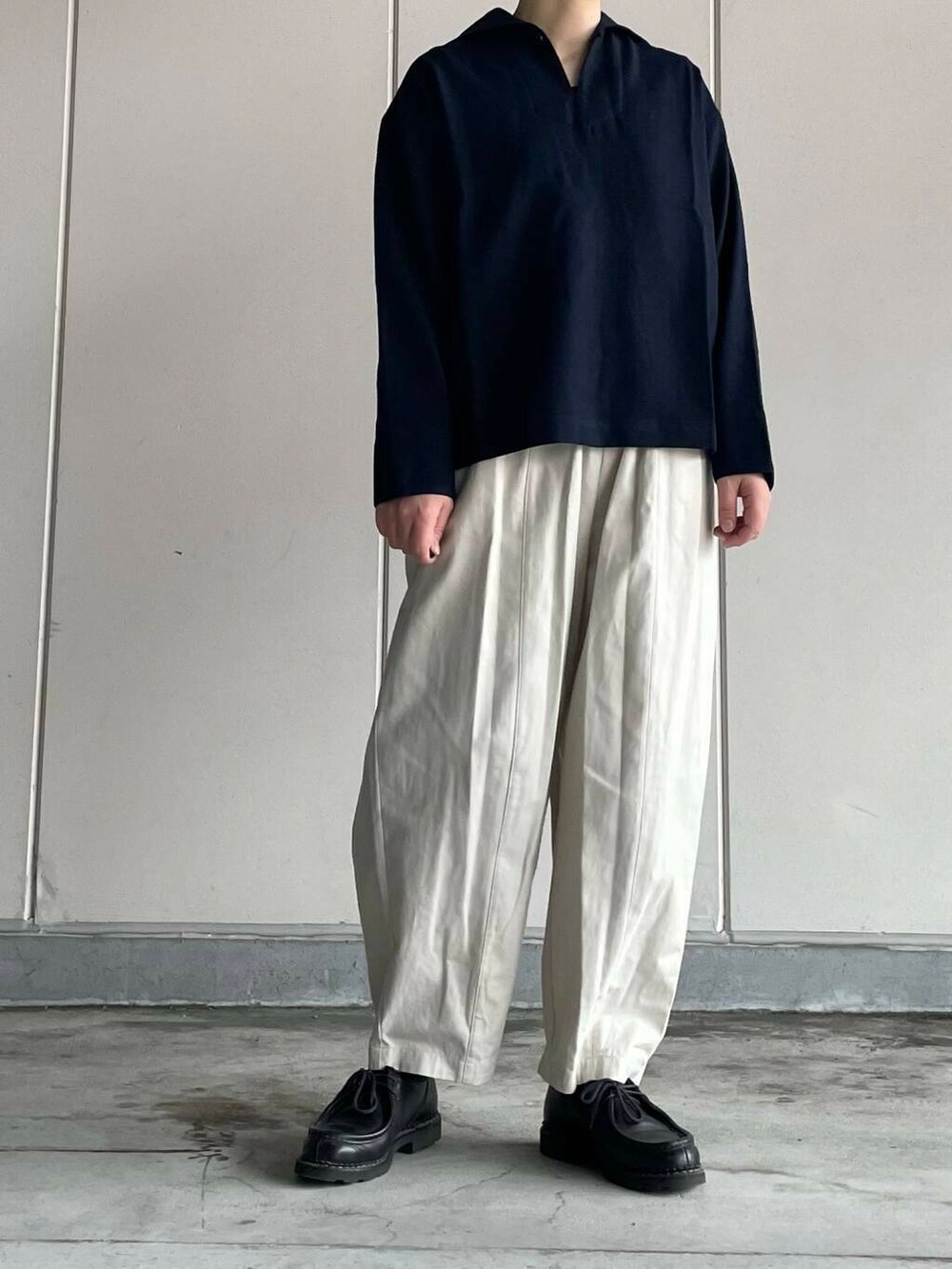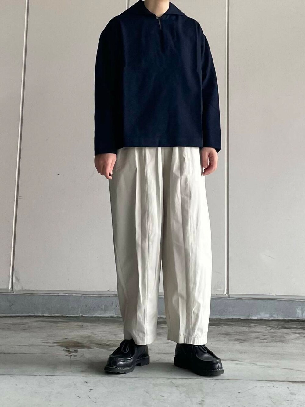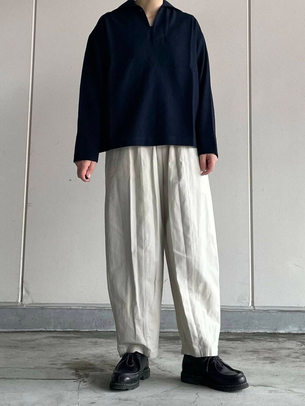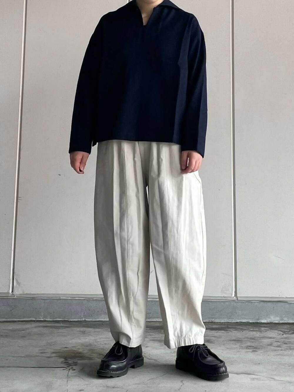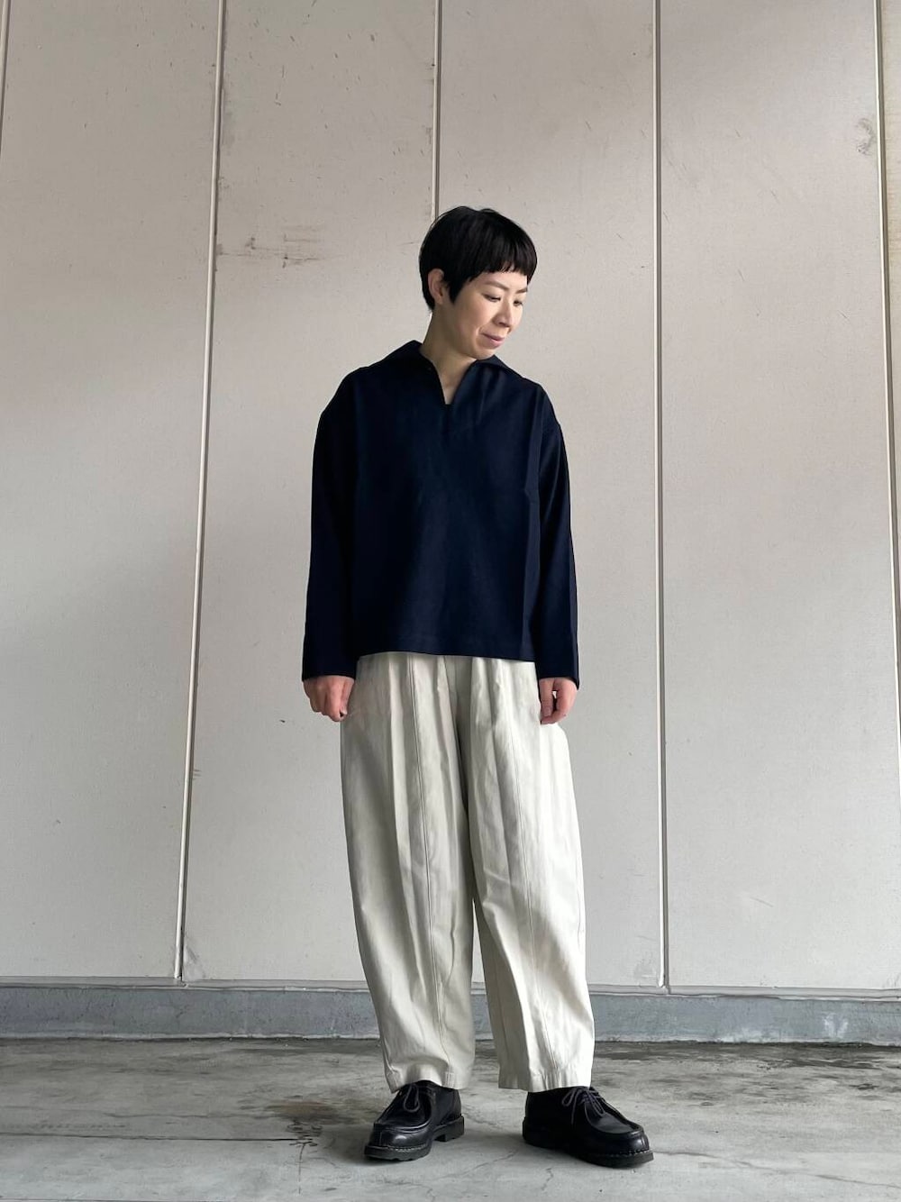 今回は、ボトムはボリュームパンツにあわせてシンプルな大人カジュアルに。