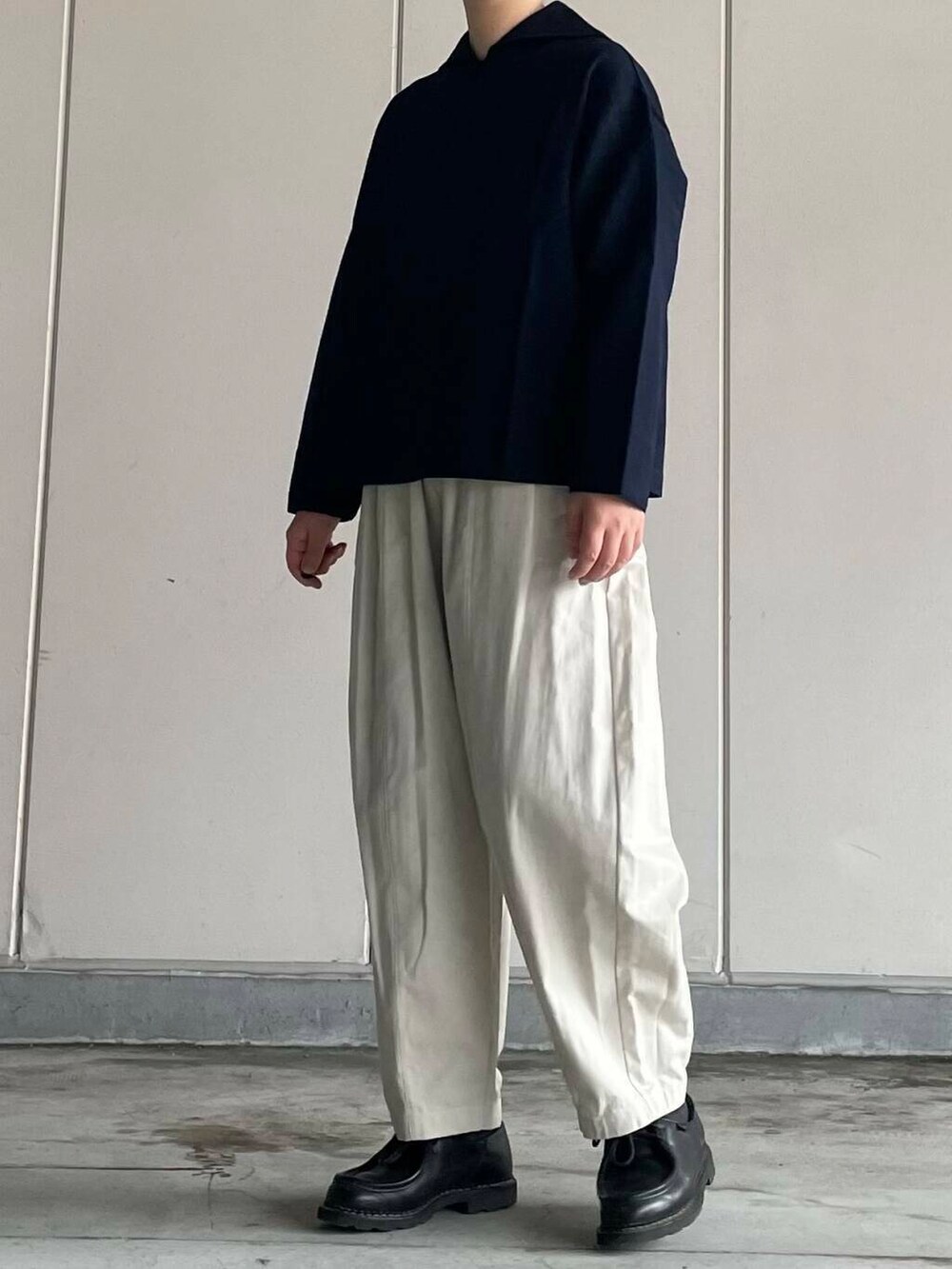 身幅は程よくゆとりがあるので、インナーにタートルネックなどもあわせていただけます。