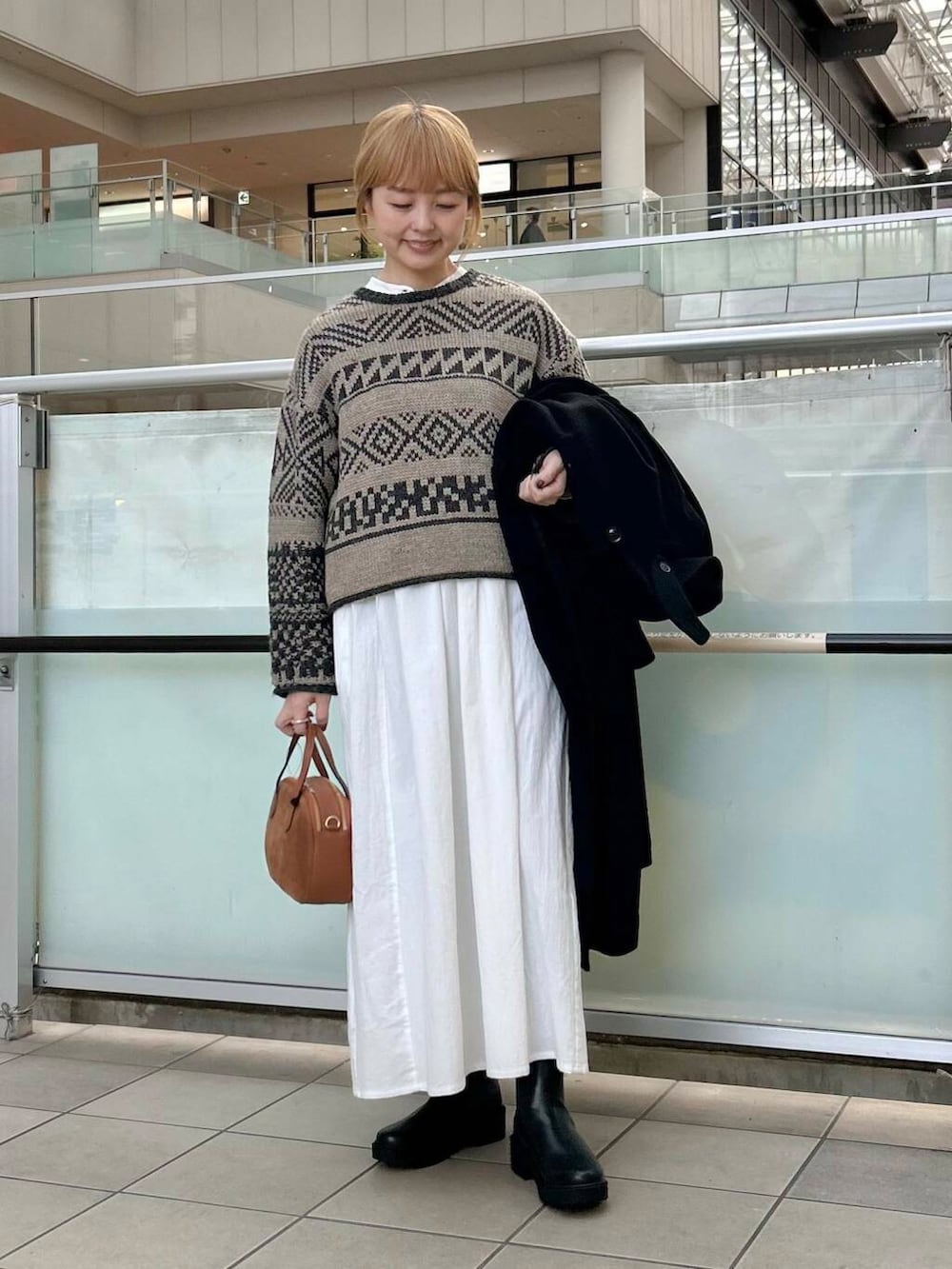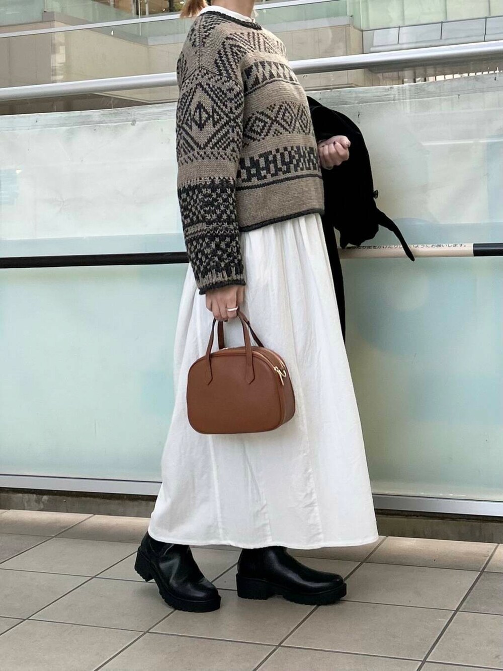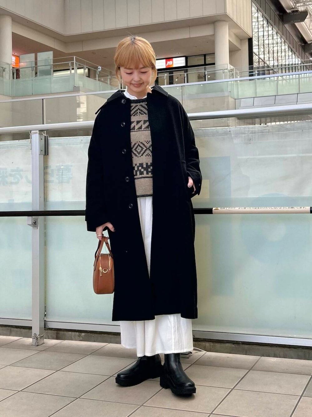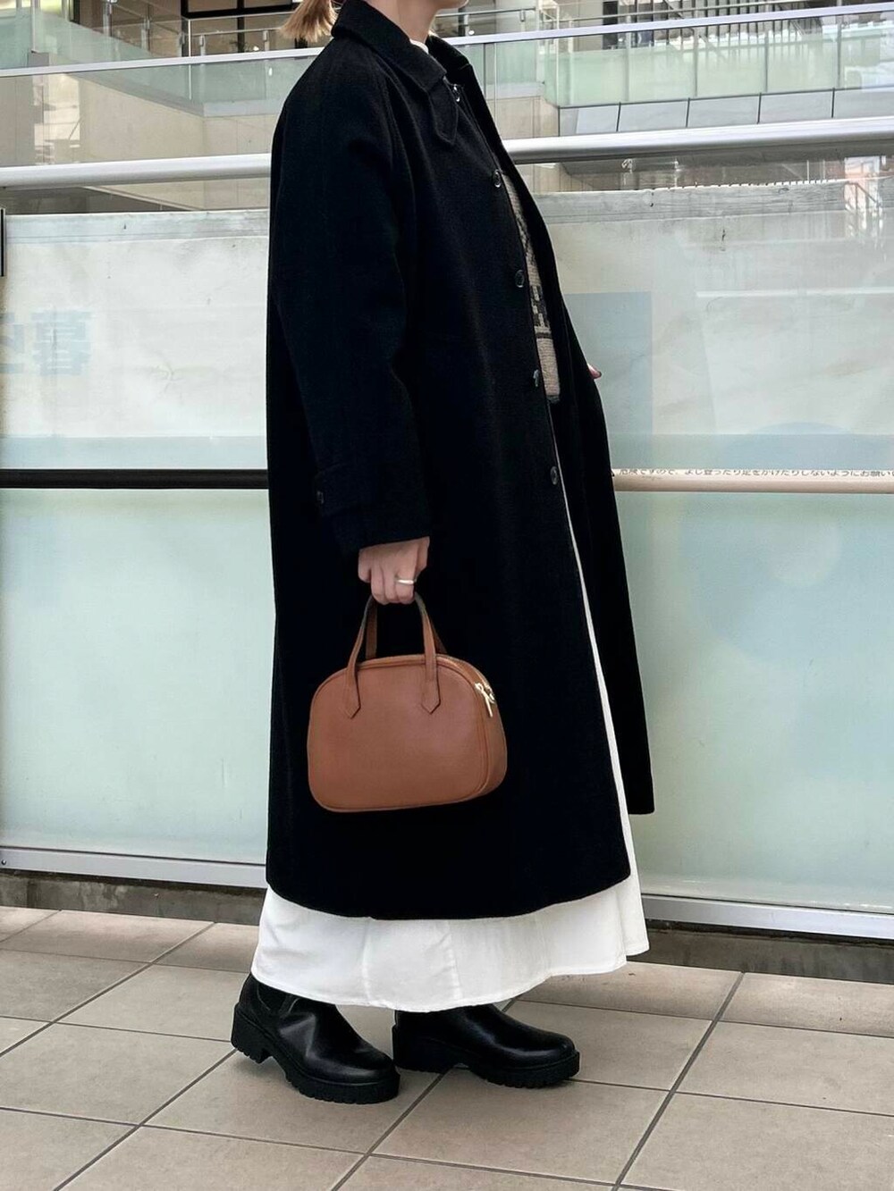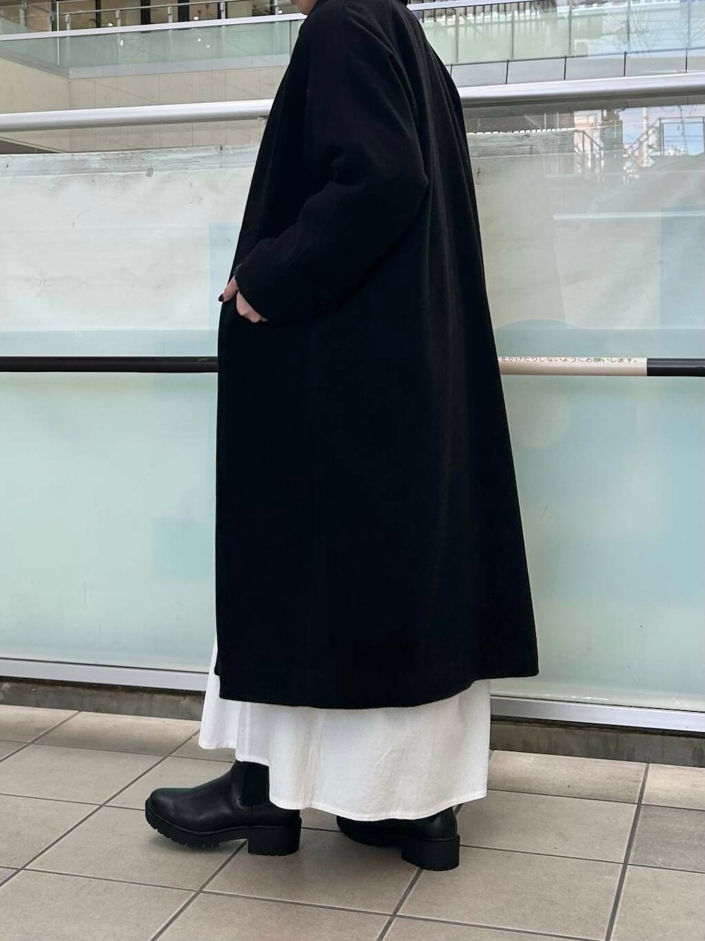 甘くならないようにアウターは黒のロングコートを合わせました。