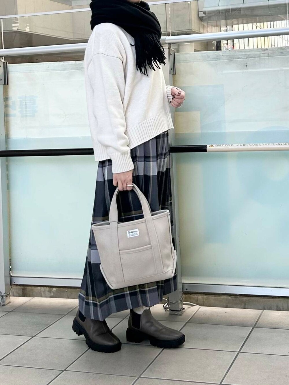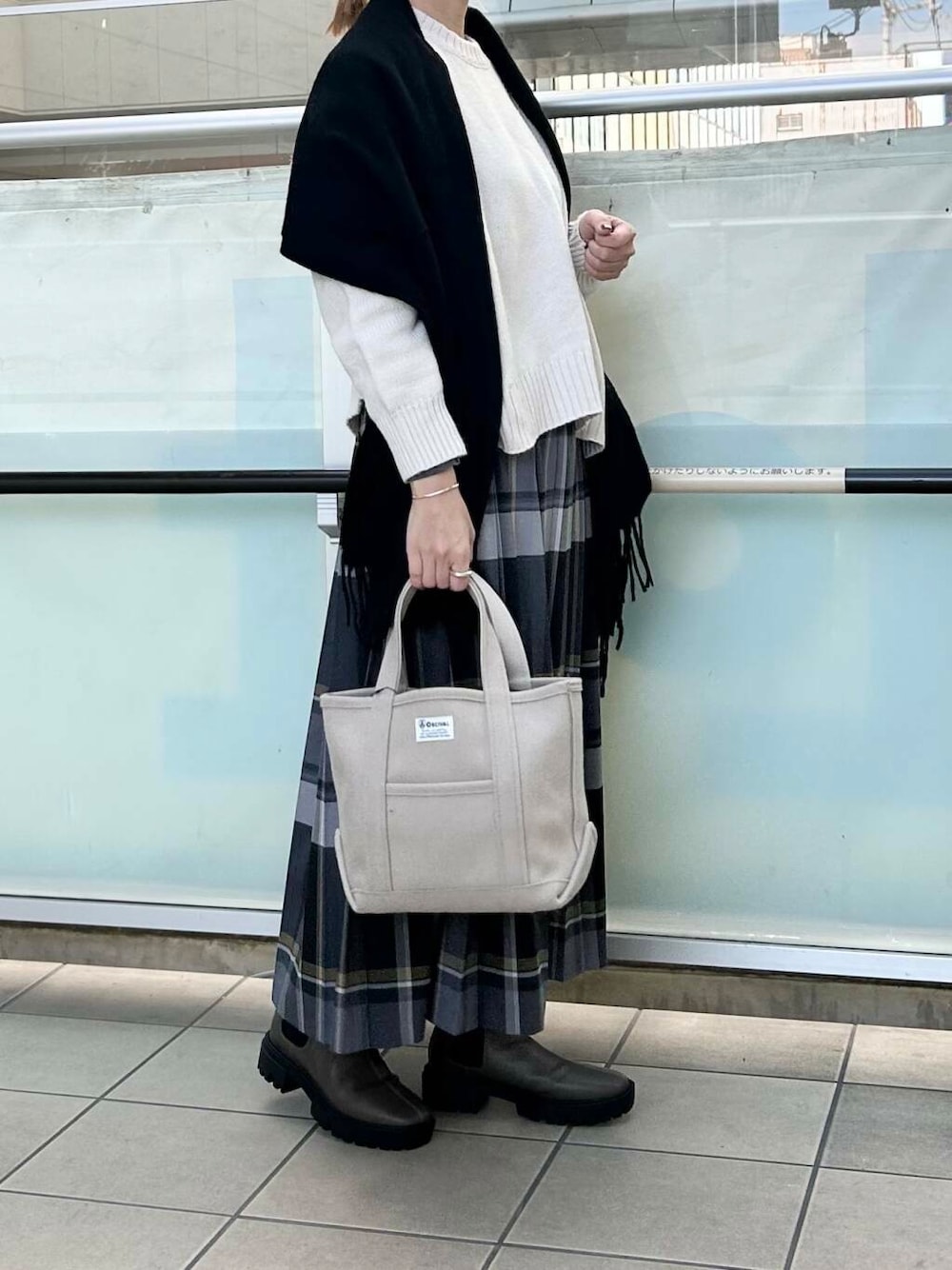 ブラックのストールでコーディネートを引き締めました。