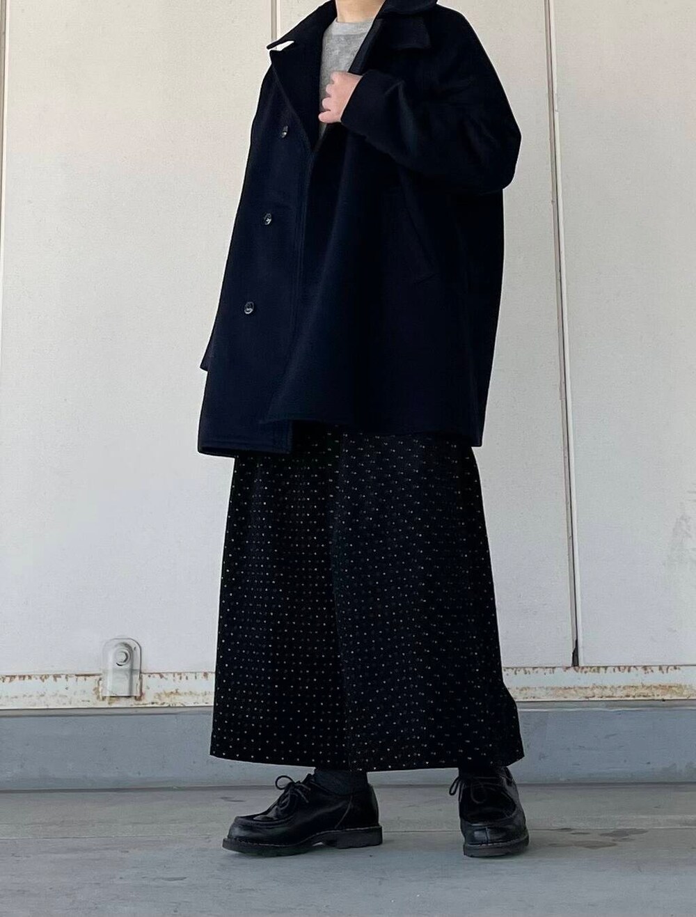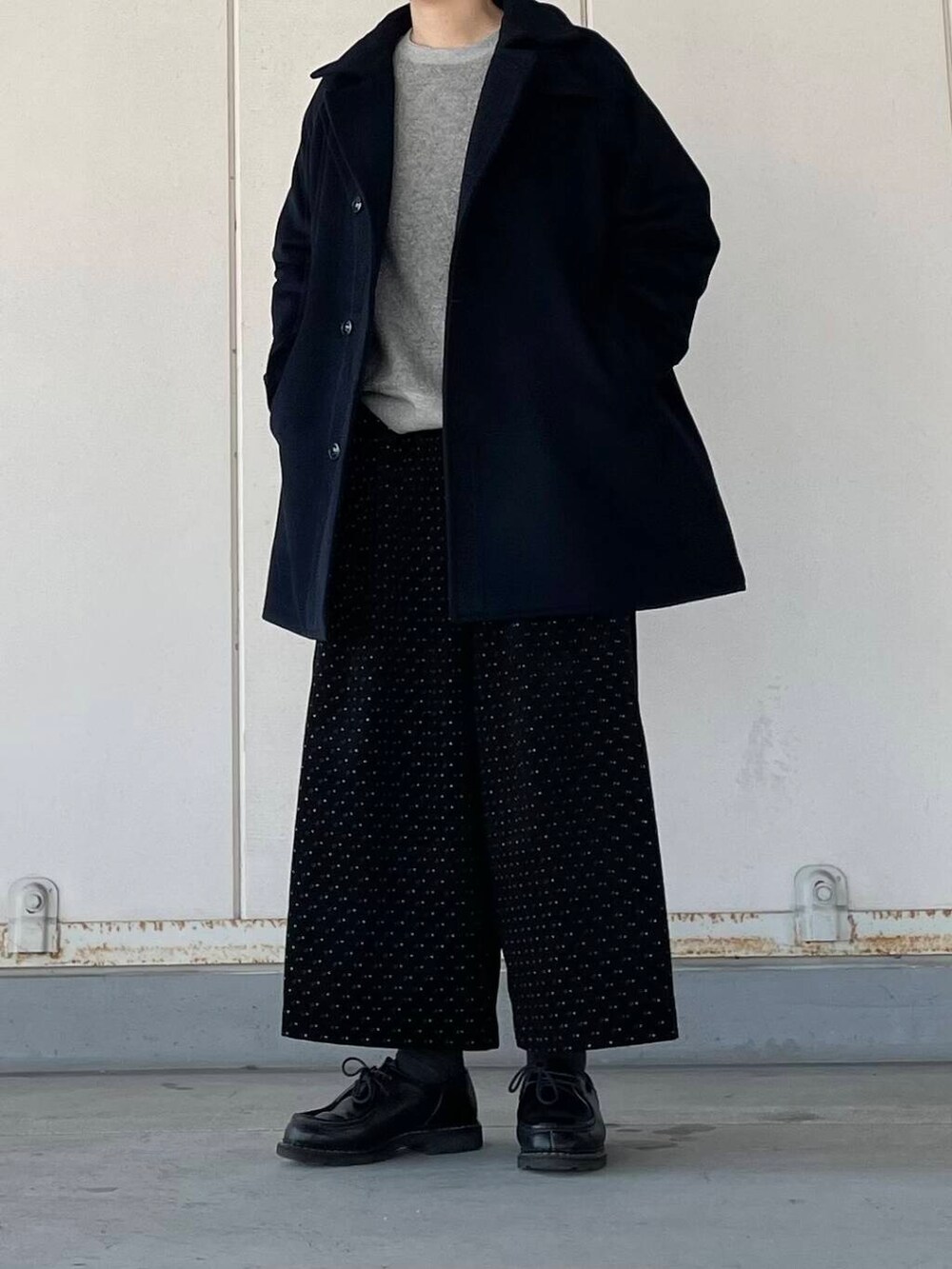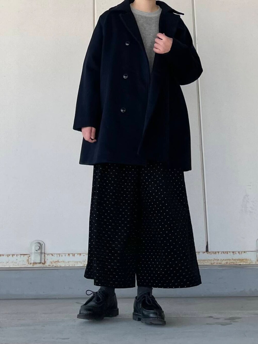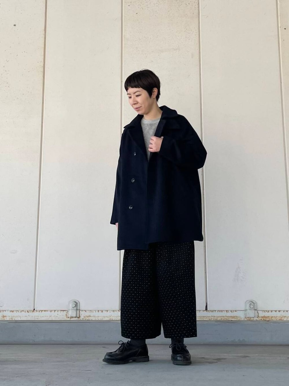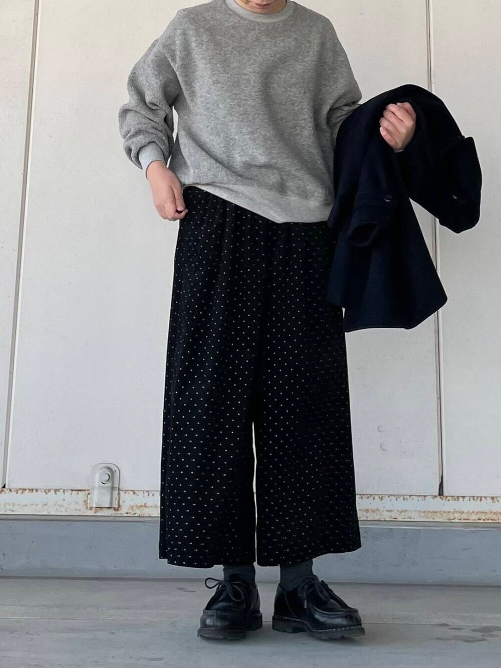 ドット柄のワイドパンツとあわせて、大人のカジュアルスタイルです。