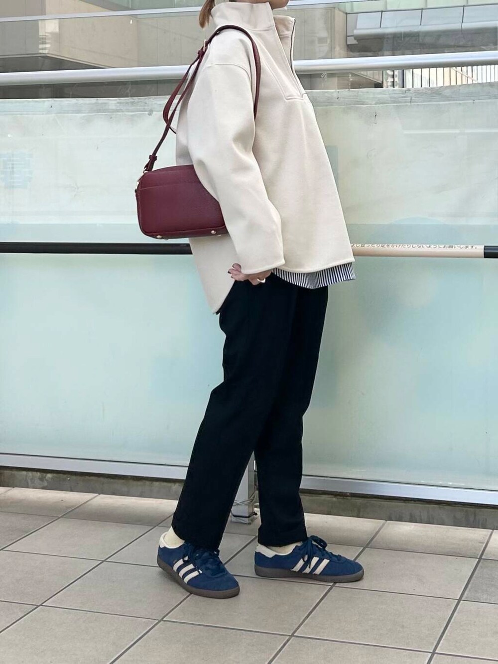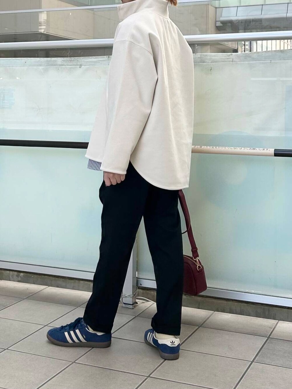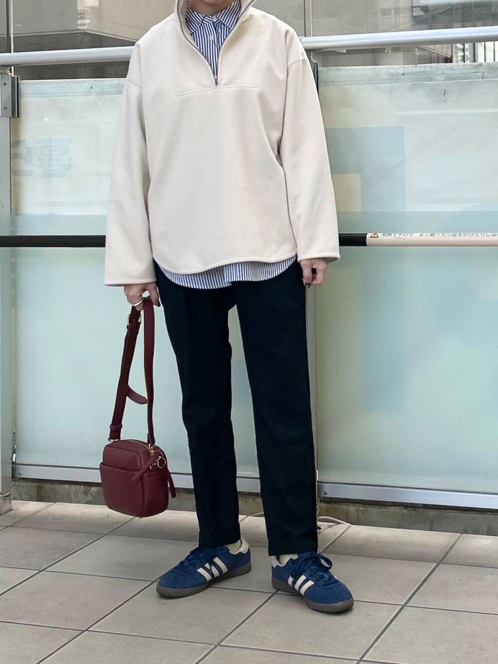 トップスがゆったりなのでボトムはスッキリとしたテーパードパンツを合わせました。