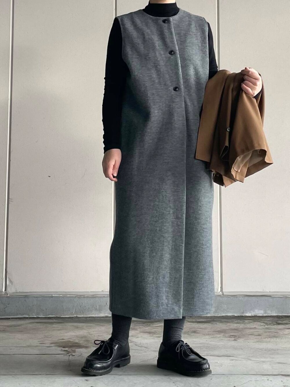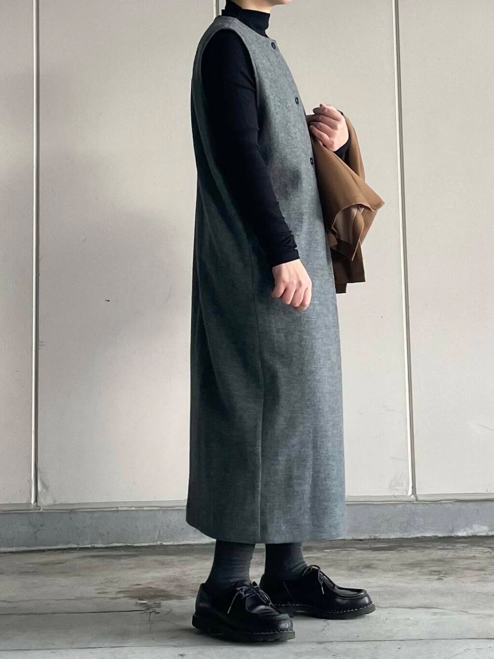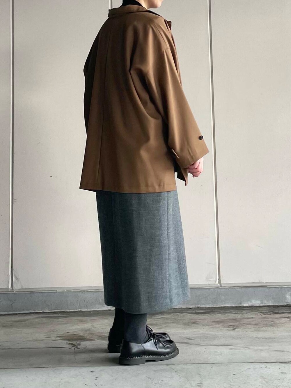 ボタンのアクセントと、さりげないタックは雰囲気が出ます。