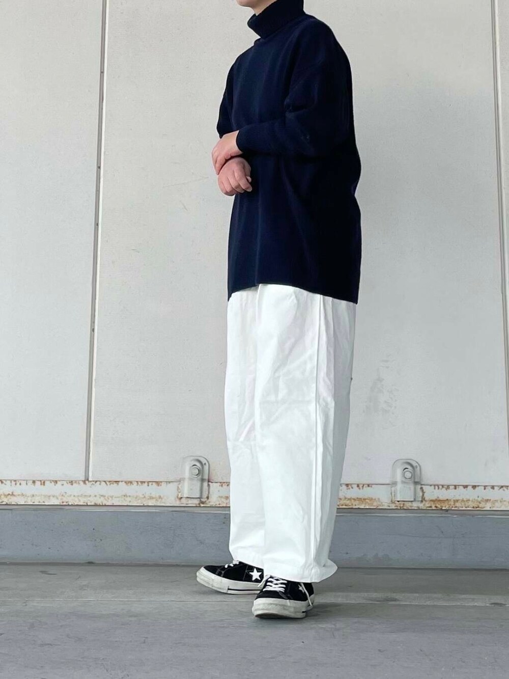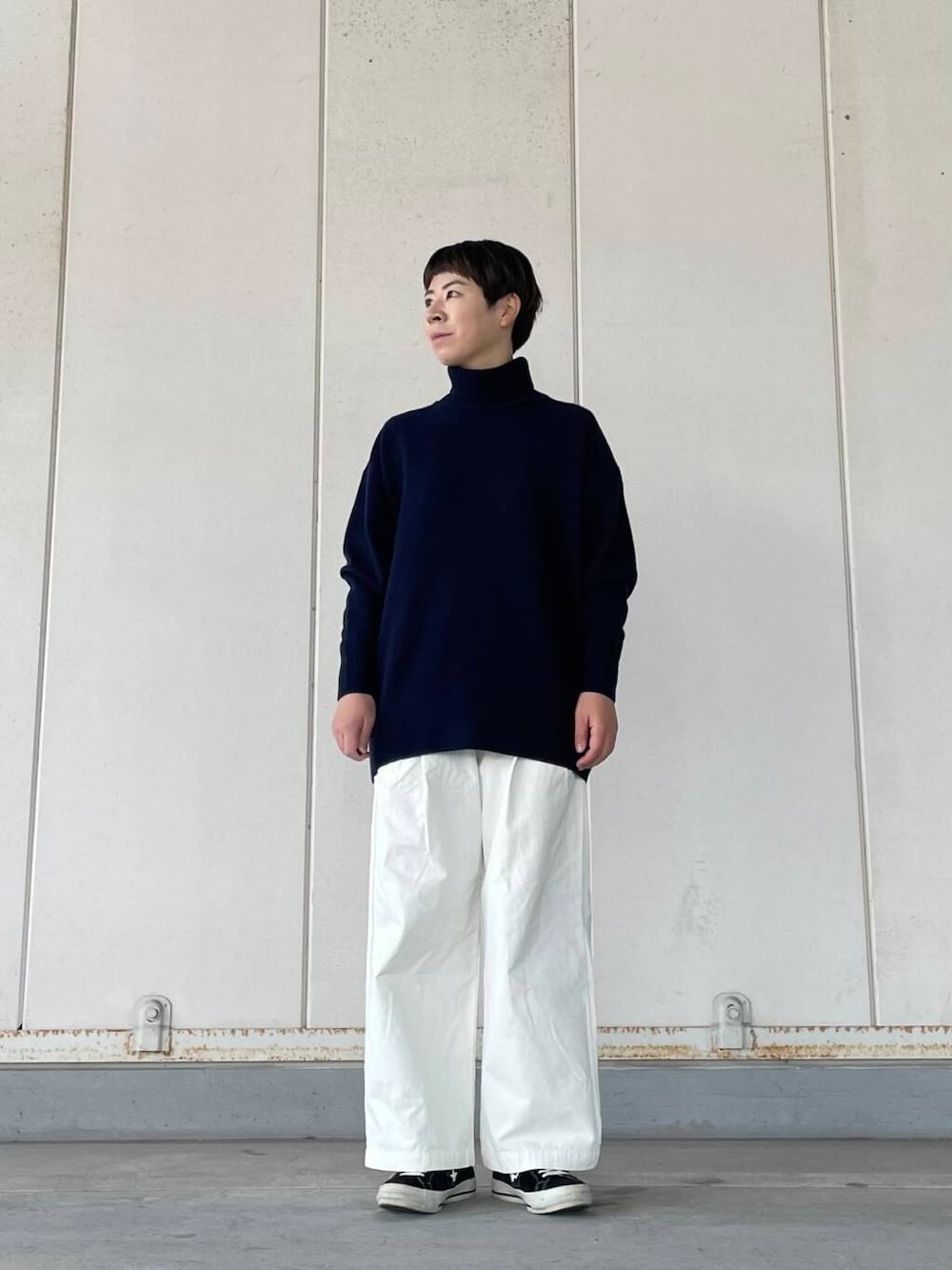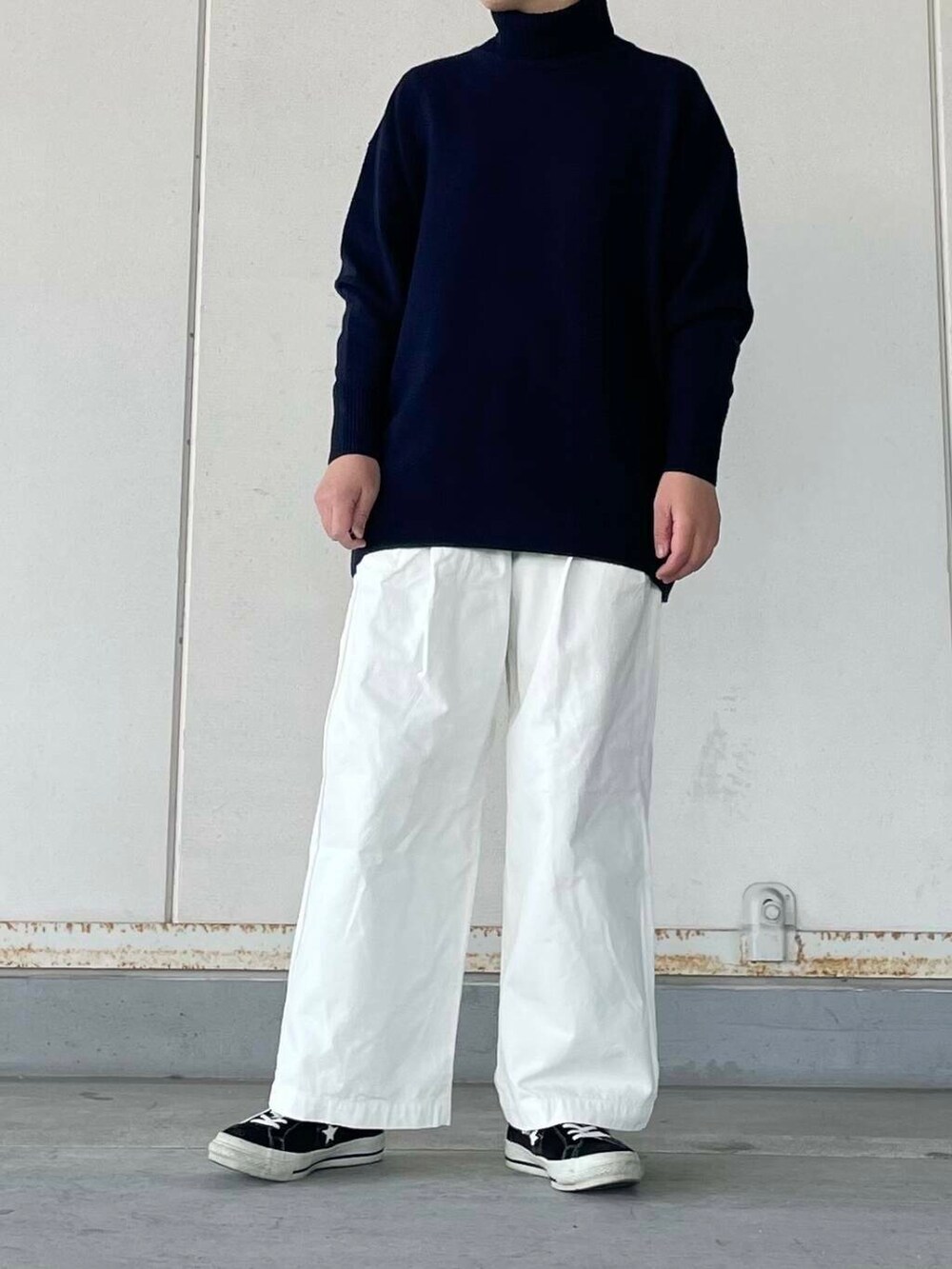 今回は白のワイドパンツとスニーカーと合わせてシックな大人カジュアルです。