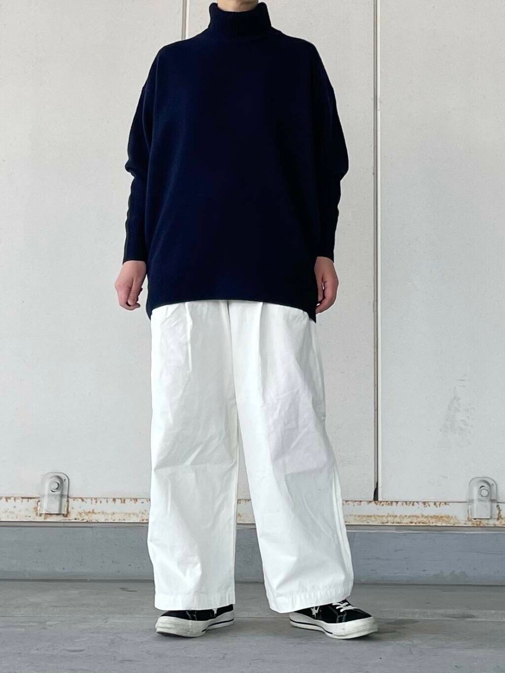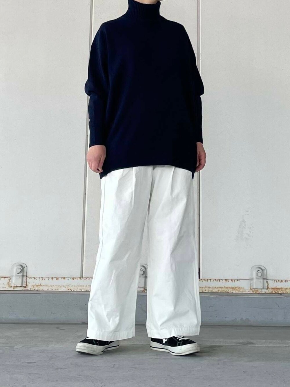 ワイドなシルエットですが、裾にかけて少し絞ったデザインのため広がりすぎません。
