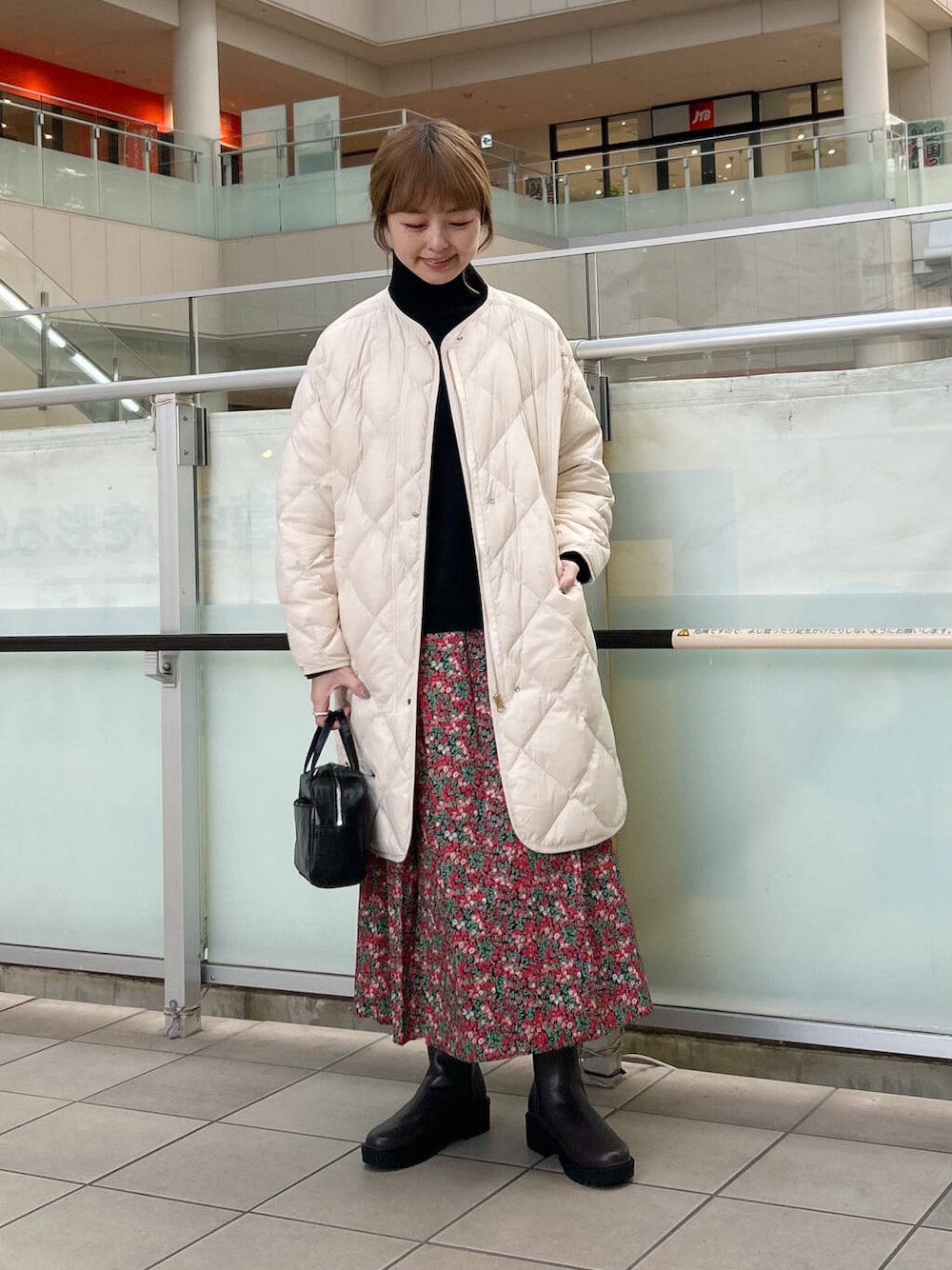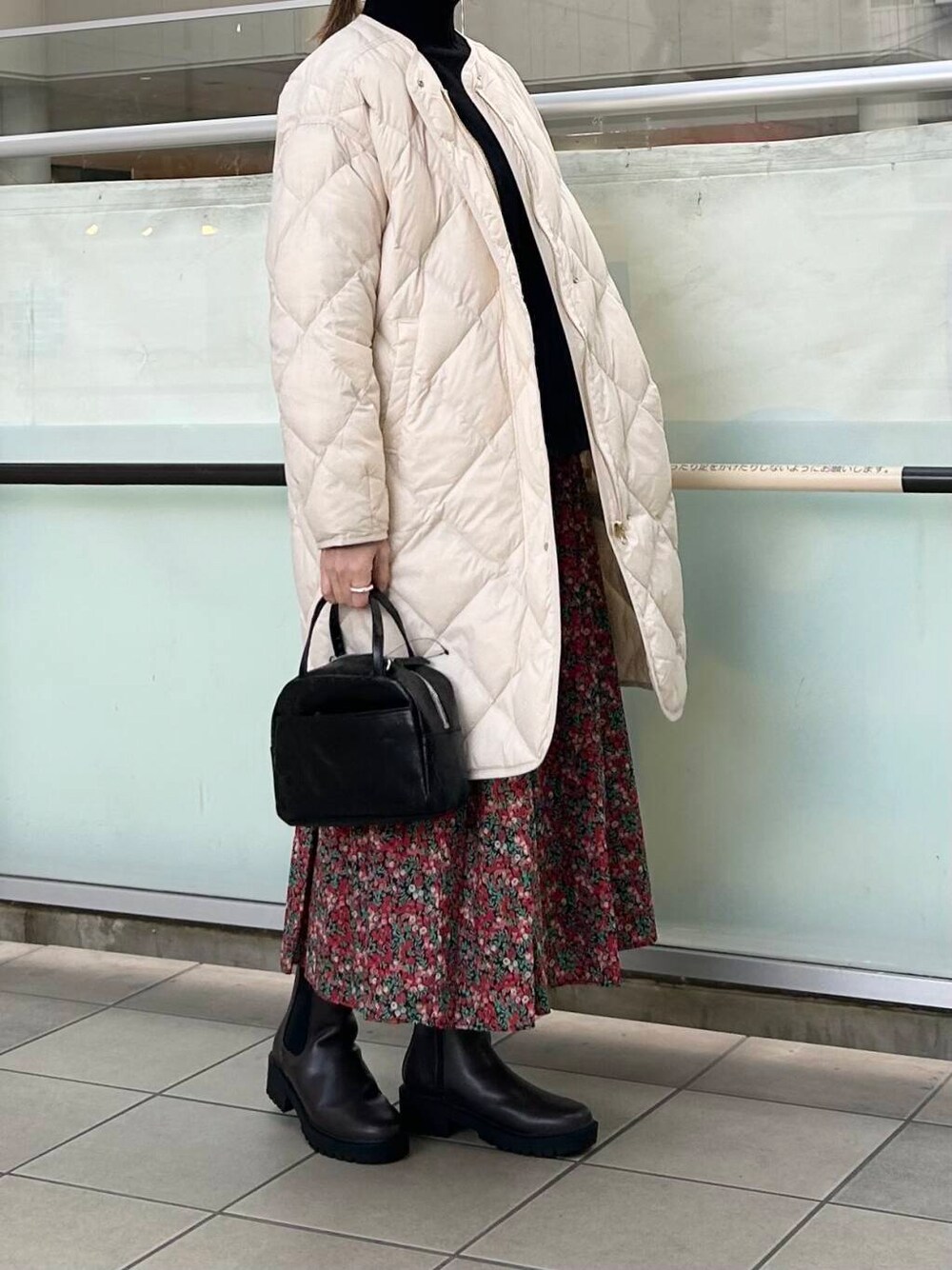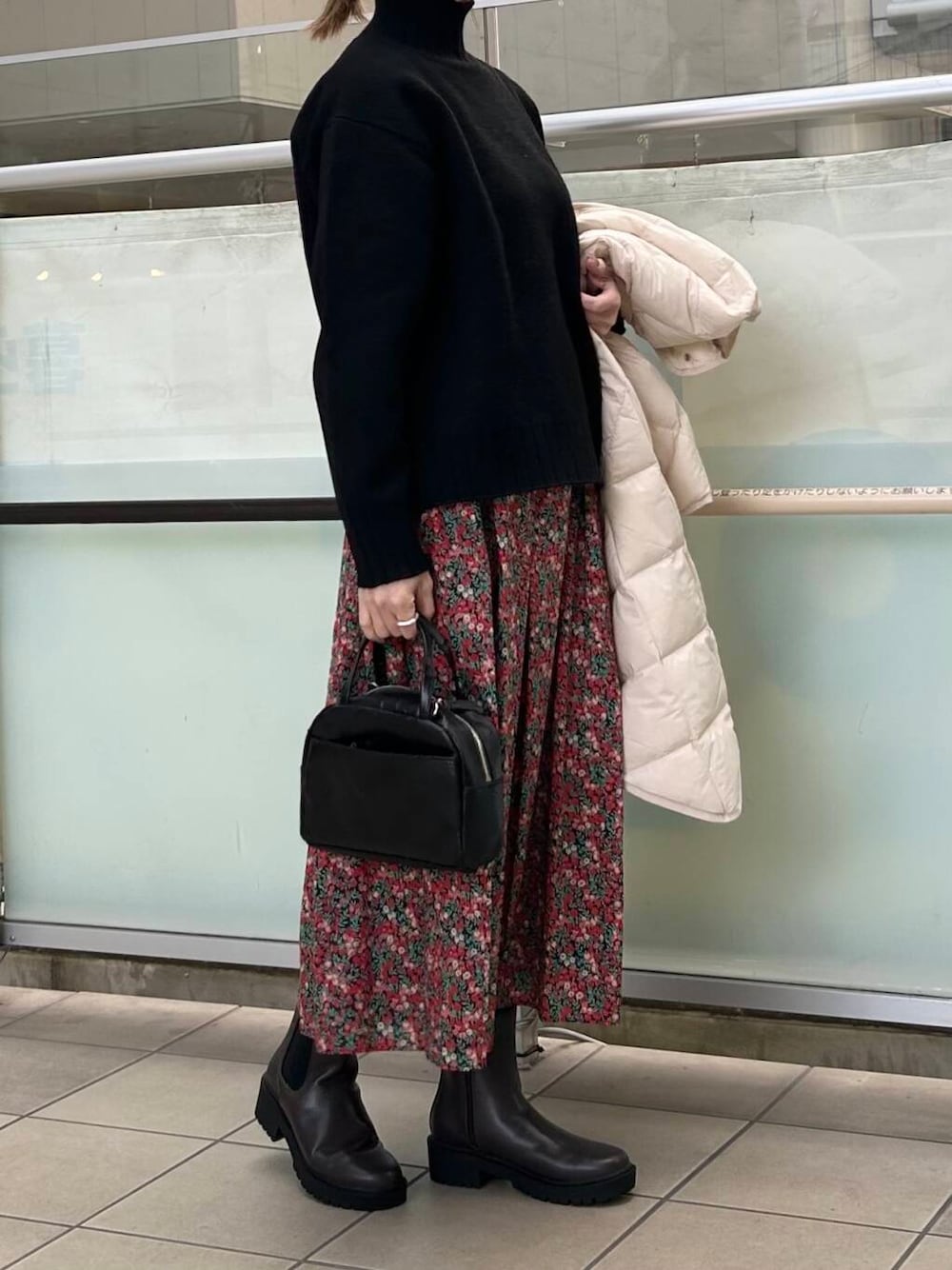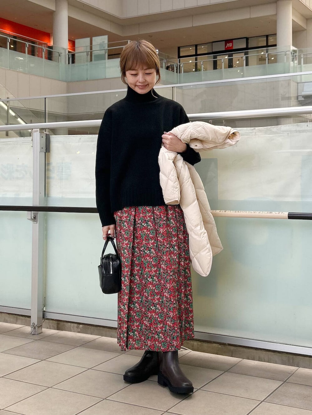 シンプルなタートルネックニットを合わせました。ブラックは何にでも合うので1枚持っていると着回しが効きくお色です。