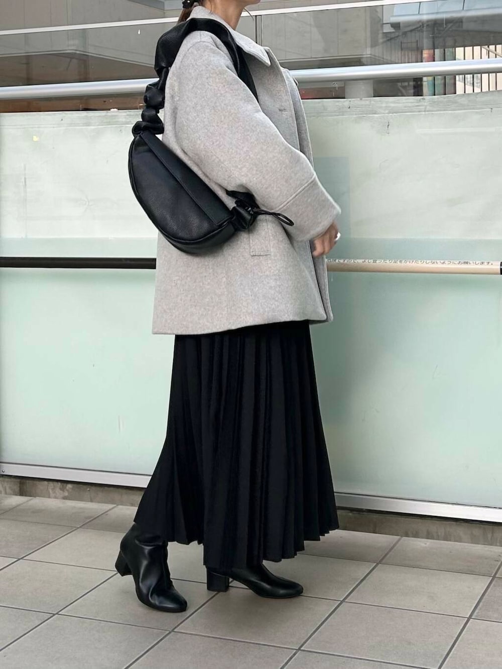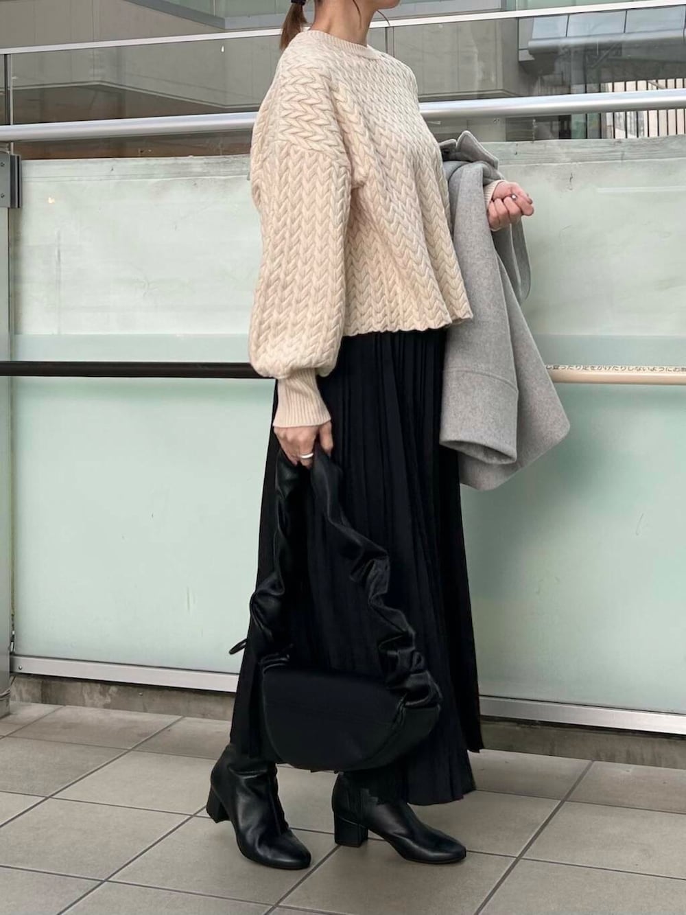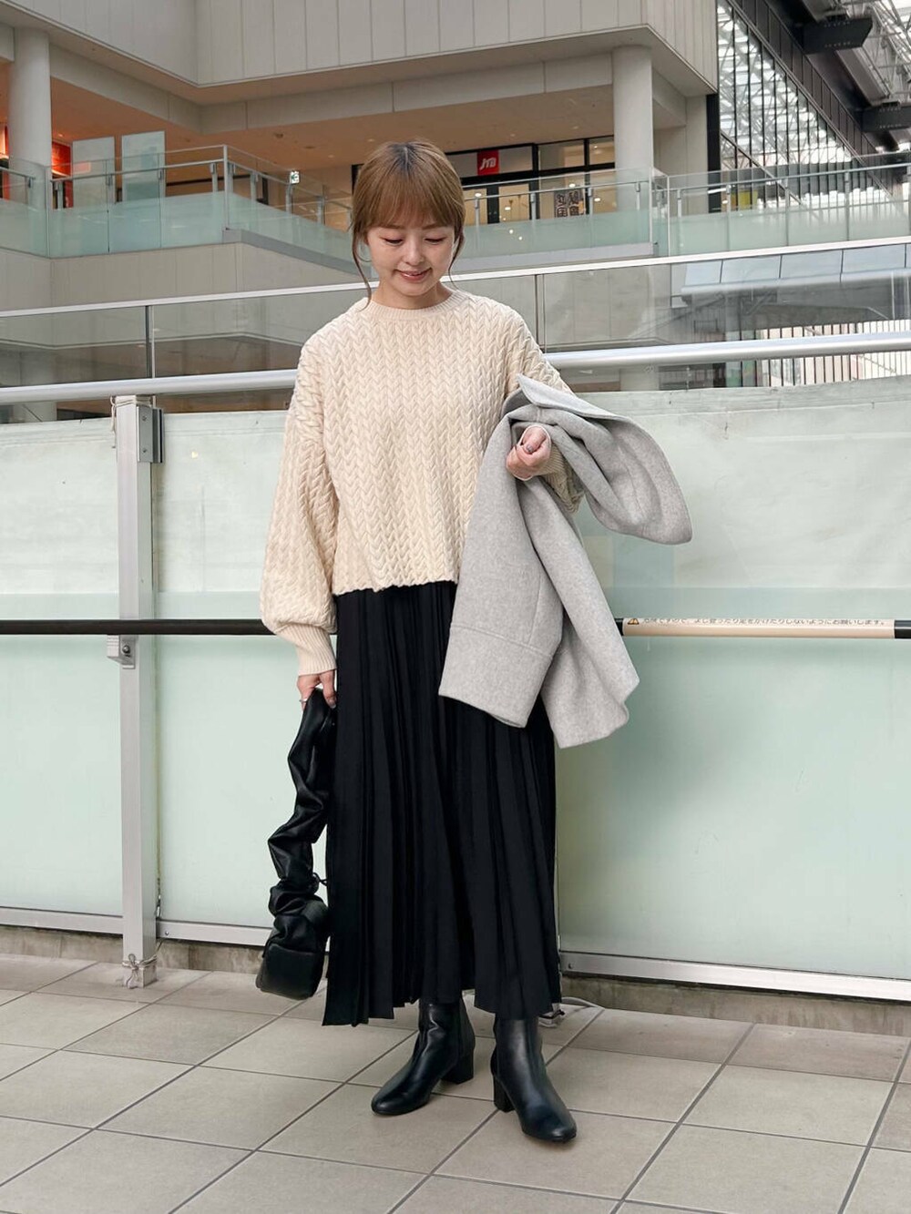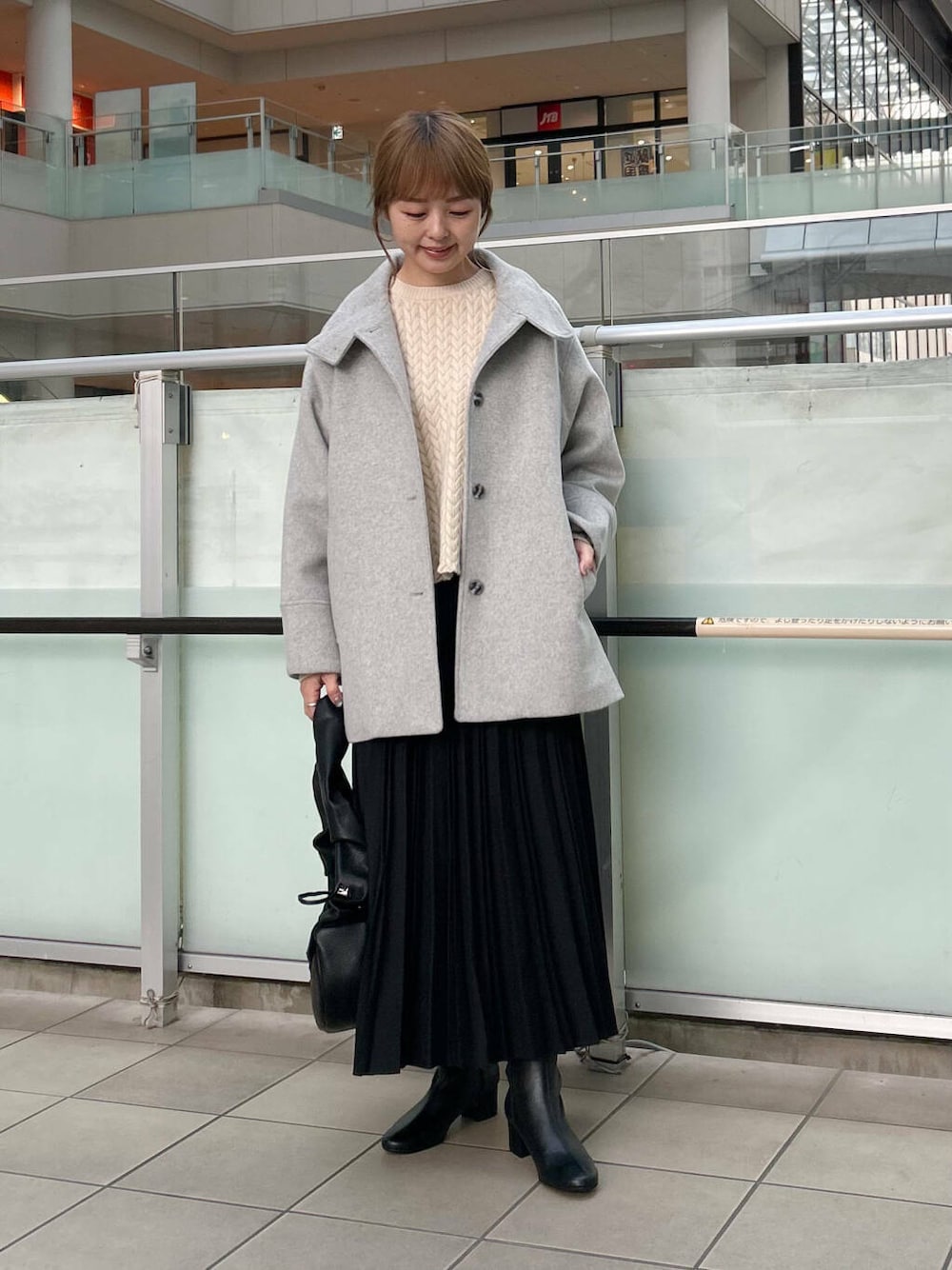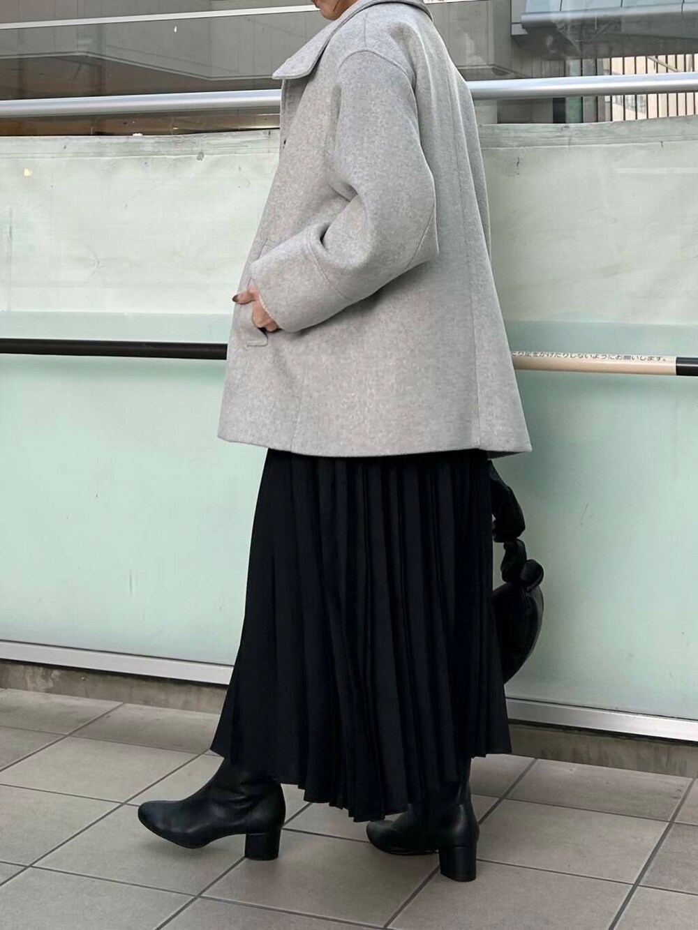 プリーツスカートとブーツを合わせてきちんと感のあるスタイルにしました。