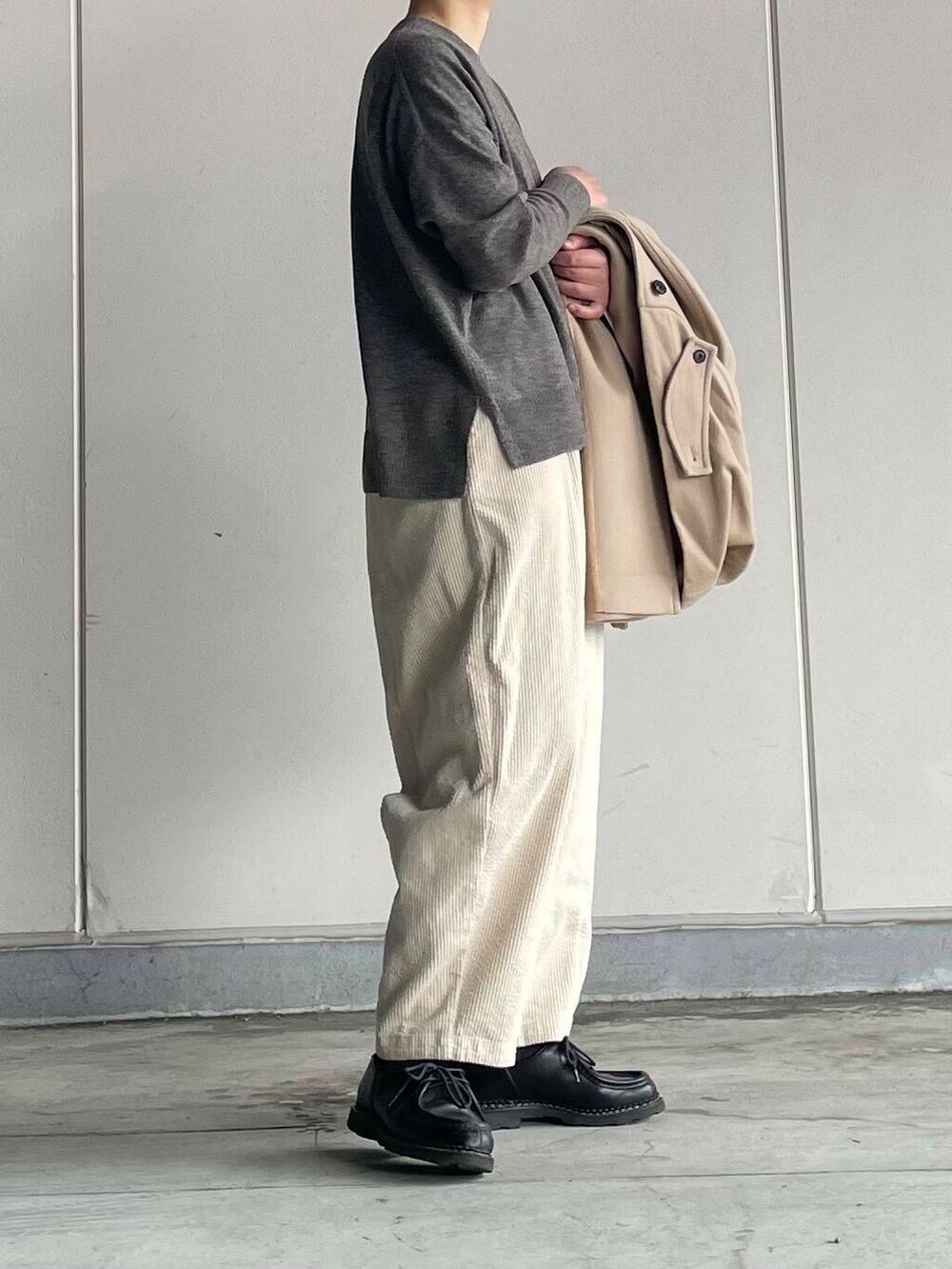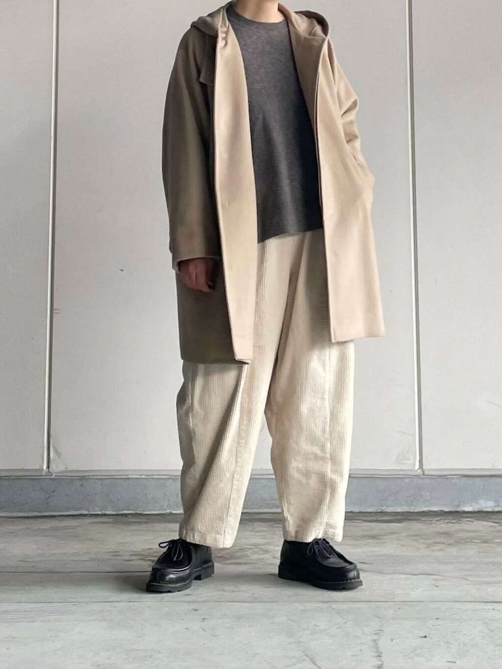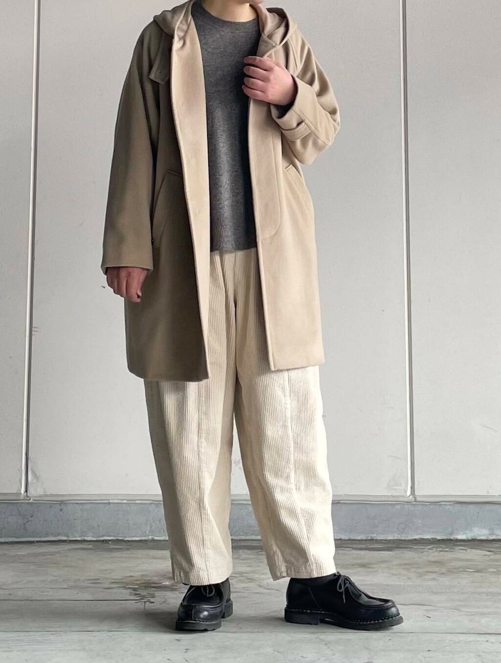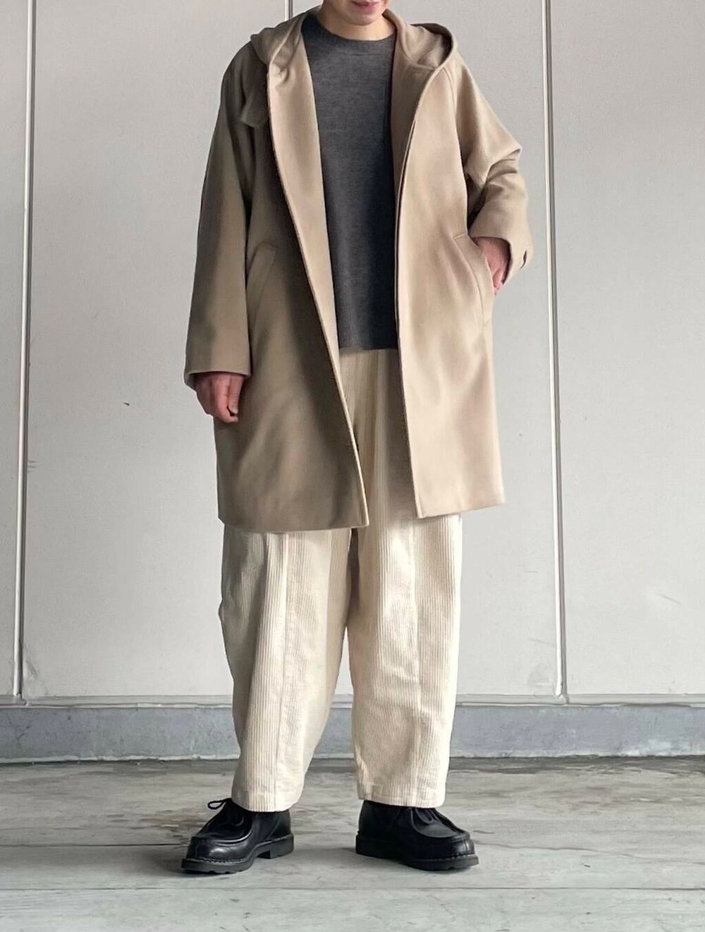 アウターはスタイリングを選ばず羽織れるフード付きのコートです。