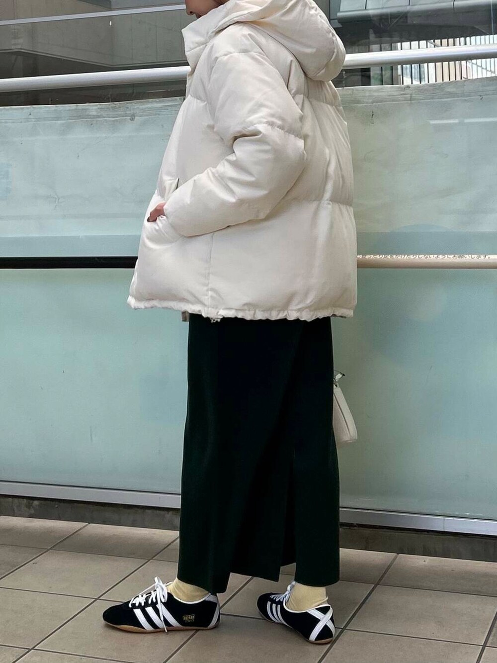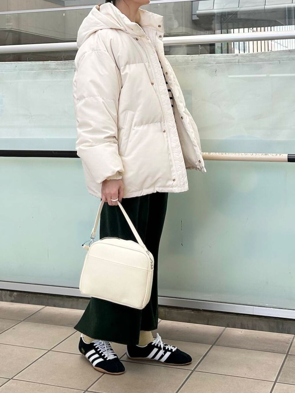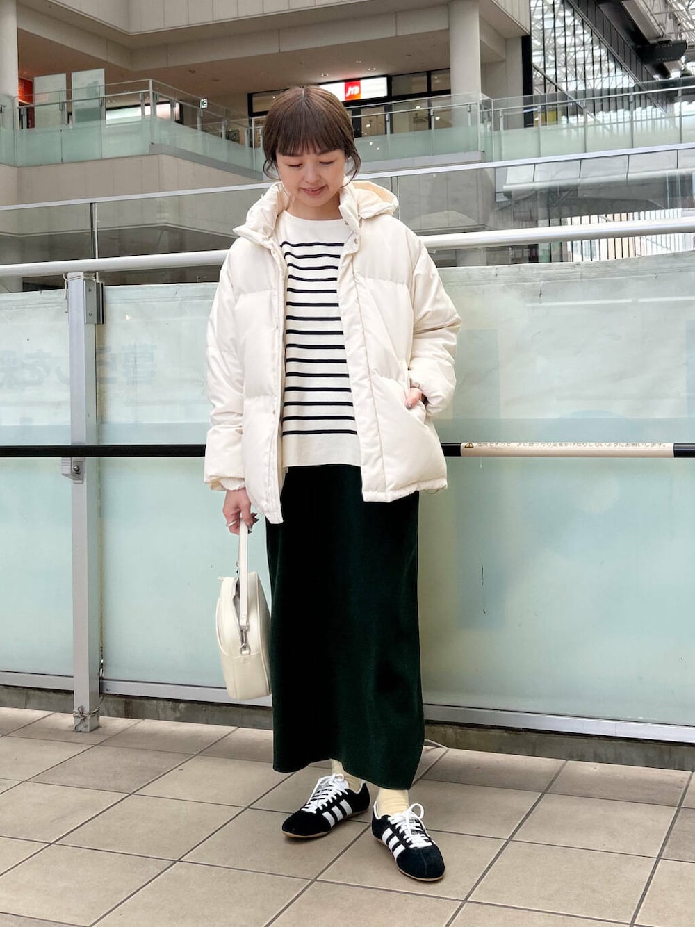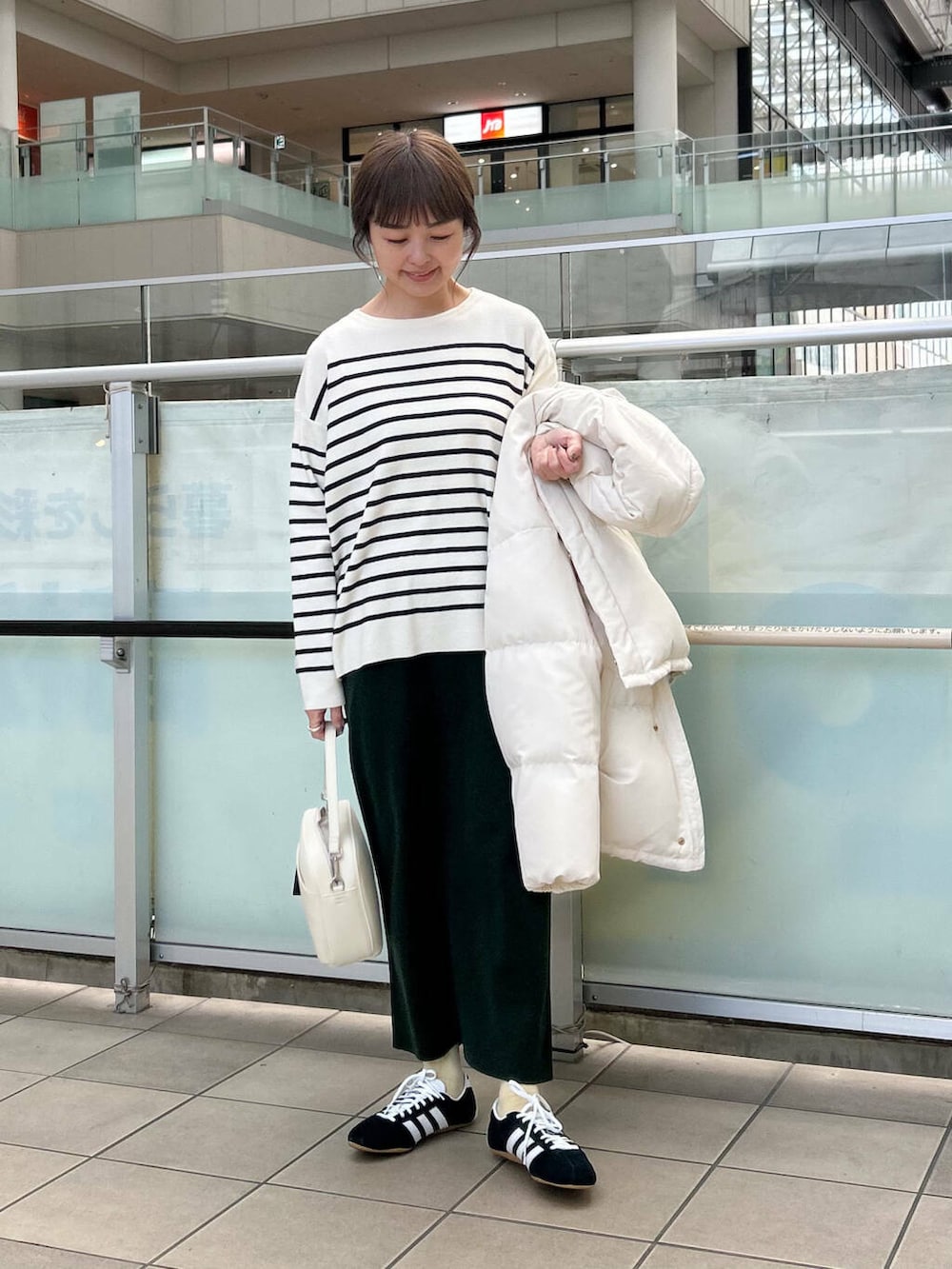 中は春先まで使えるボーダーニットを合わせました。ダウンなど暖かいアウターのときは薄手のニットがオススメです。
