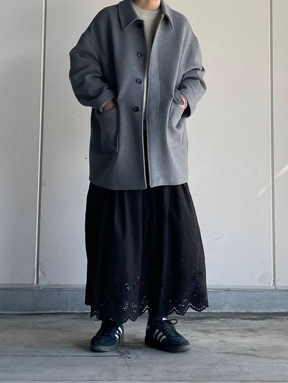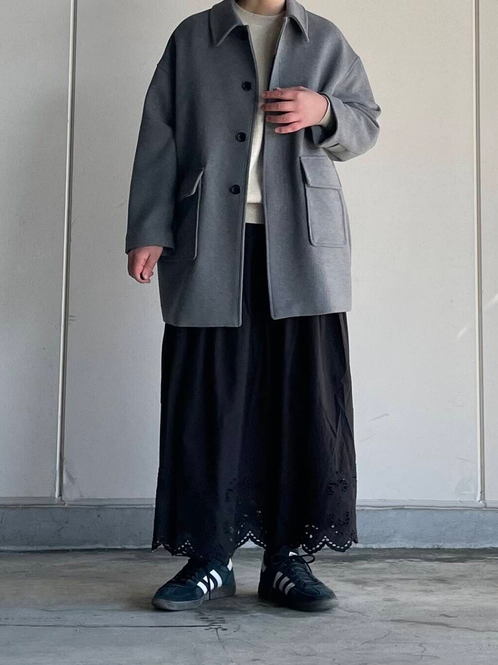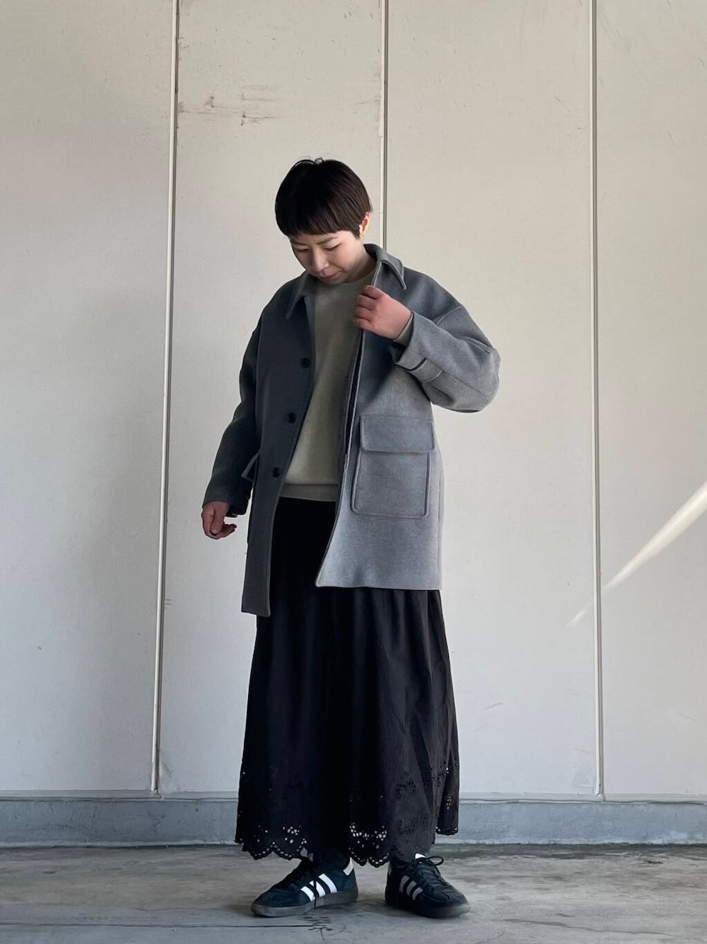 アウターは軽くて羽織りやすいです。落ち着いたグレーの色合いが合わせやすい1着です。