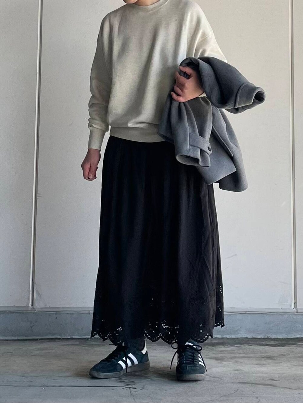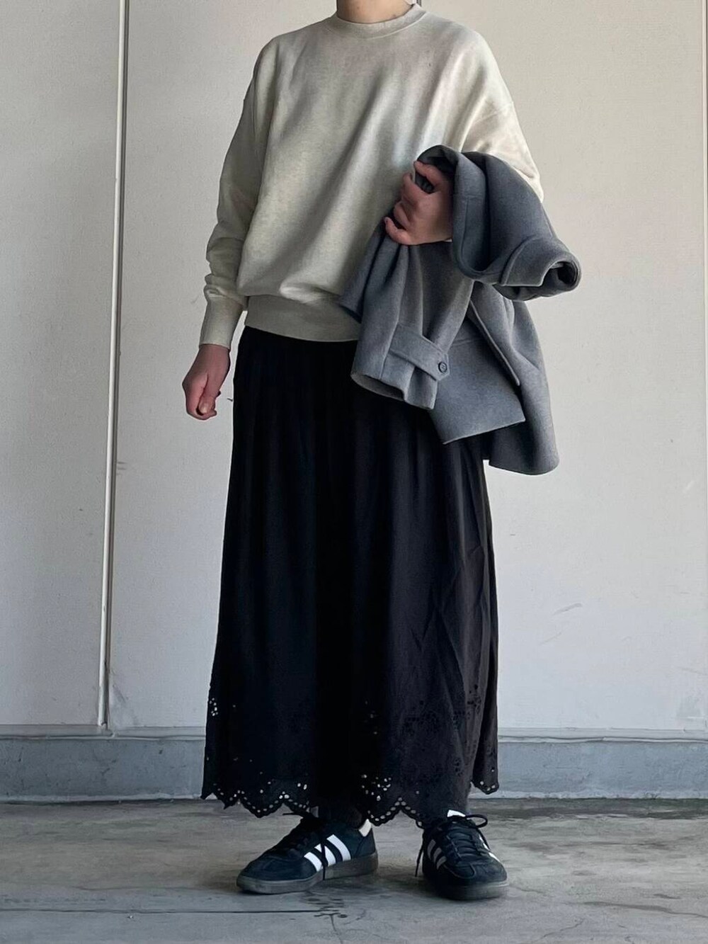 スウェットにスカートをあわせた大人のカジュアルスタイルです。
