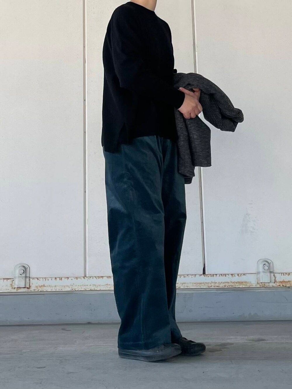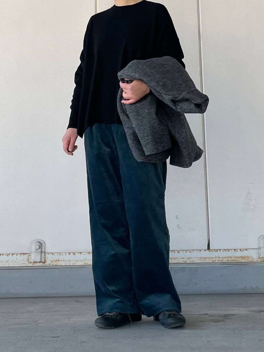 パンツは光沢があり、暖かみのある風合いです。少しストレッチが入っているため、楽に着用いただけます。