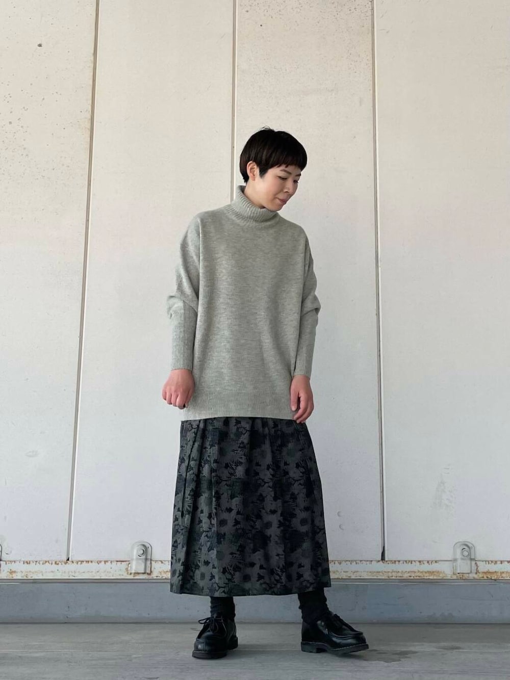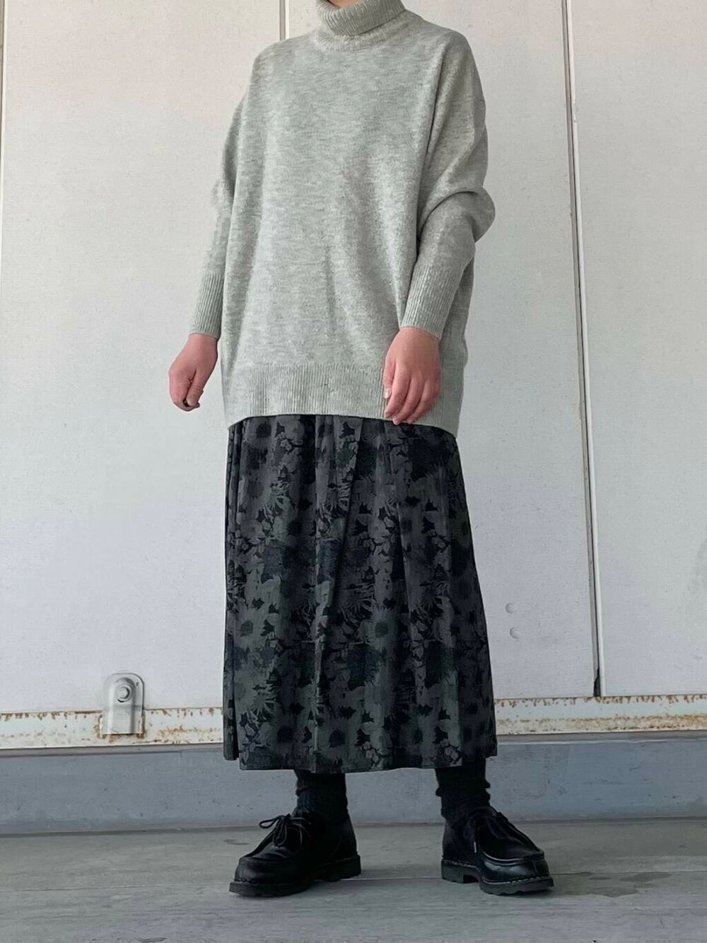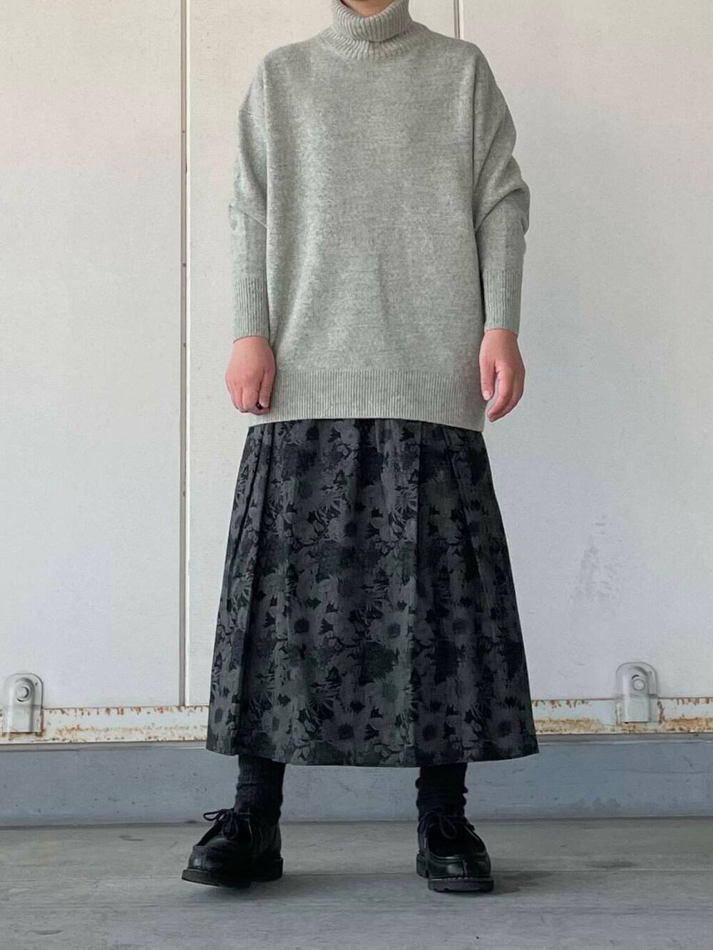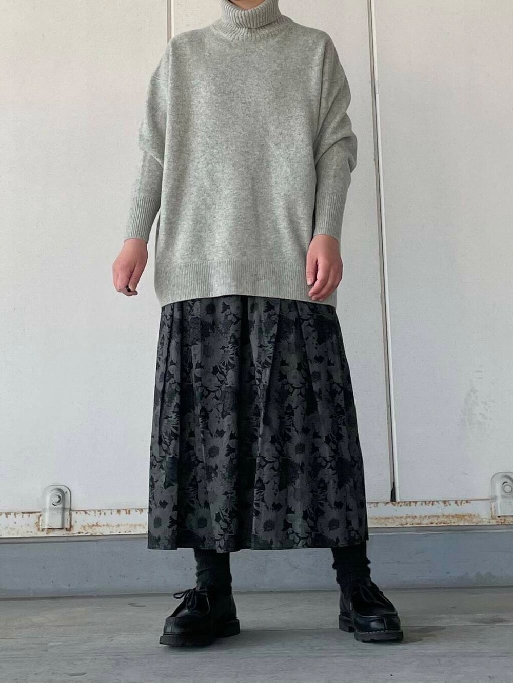 スカートはリバティプリントのスカートです。柄物ですが、落ち着いた色目であわせやすいです。広がりすぎず着やすい1着です。