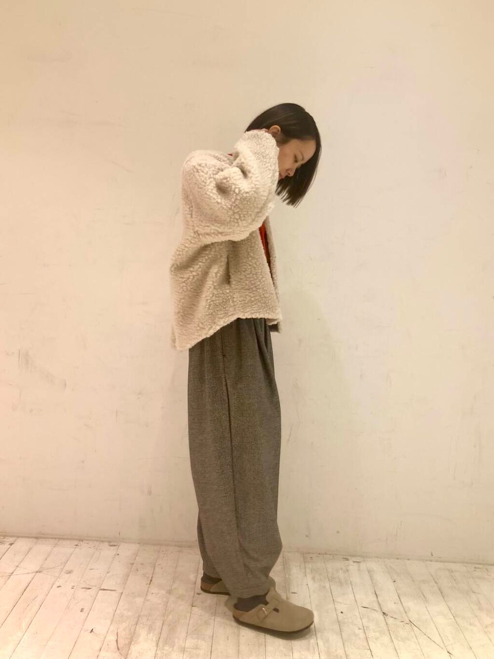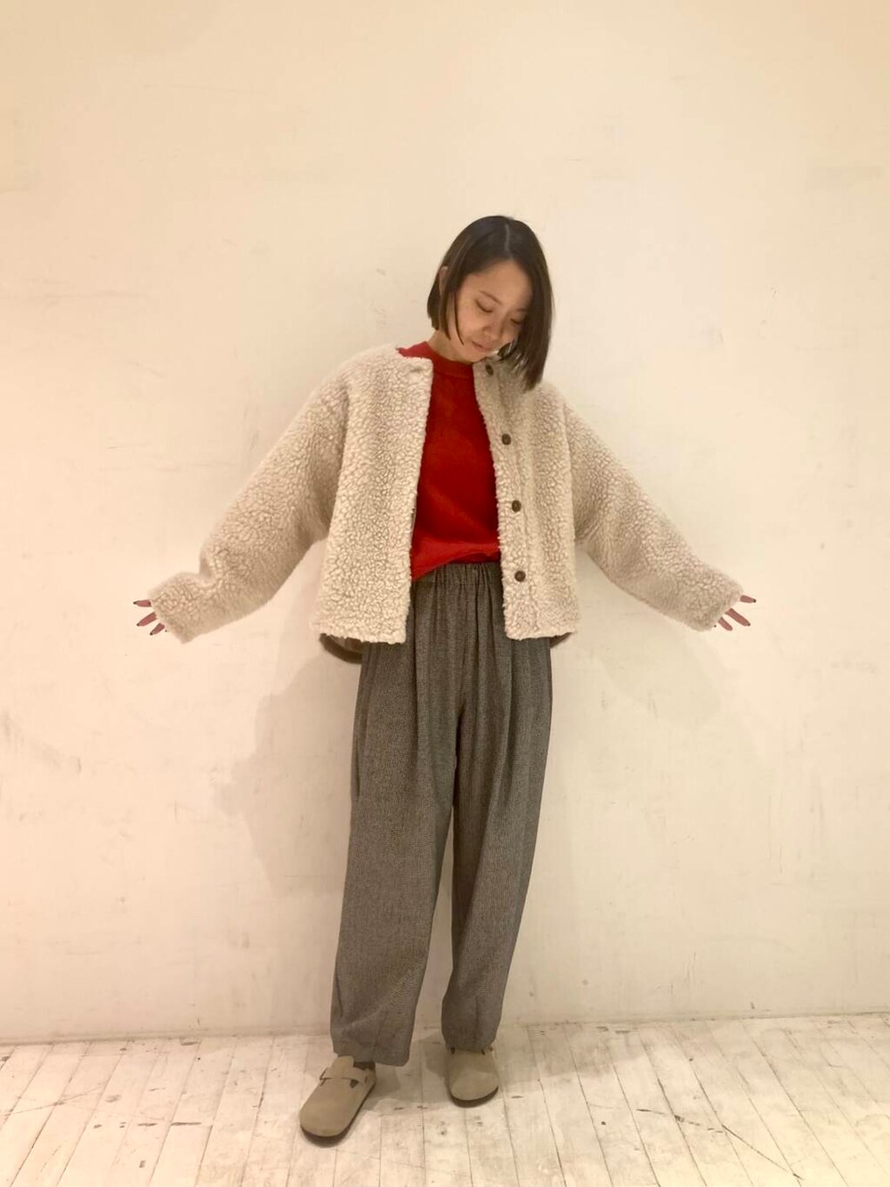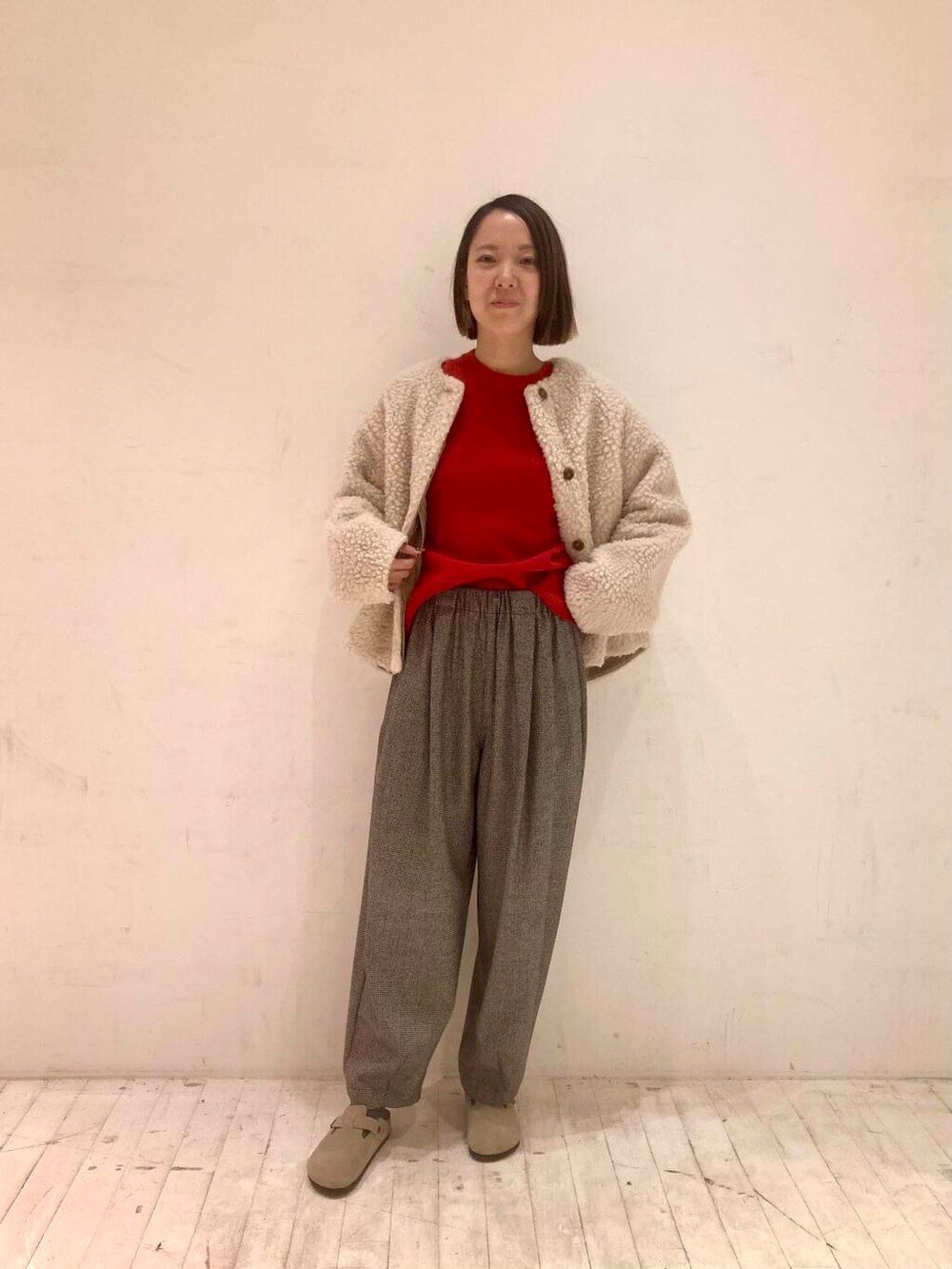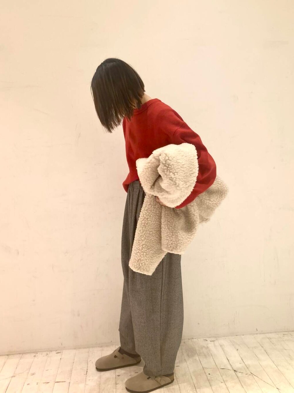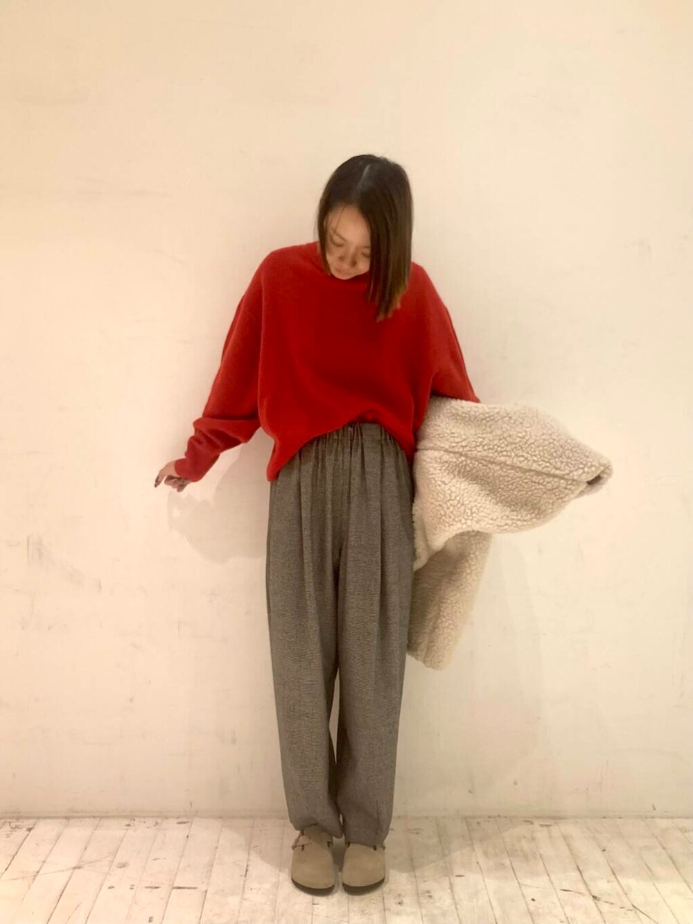 赤ニットはハミルトンウール使用でとても温かいですが、ボリュームたっぷりではないので、アウターも選ばずコーディネートのポイントになってくれます!