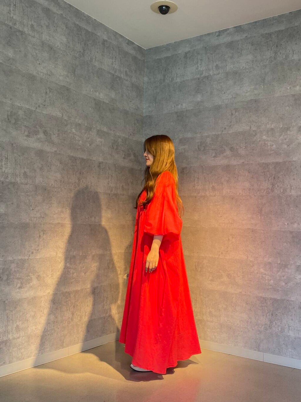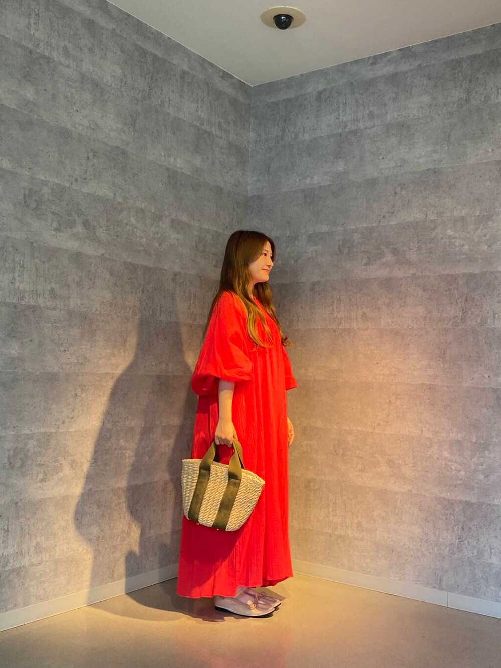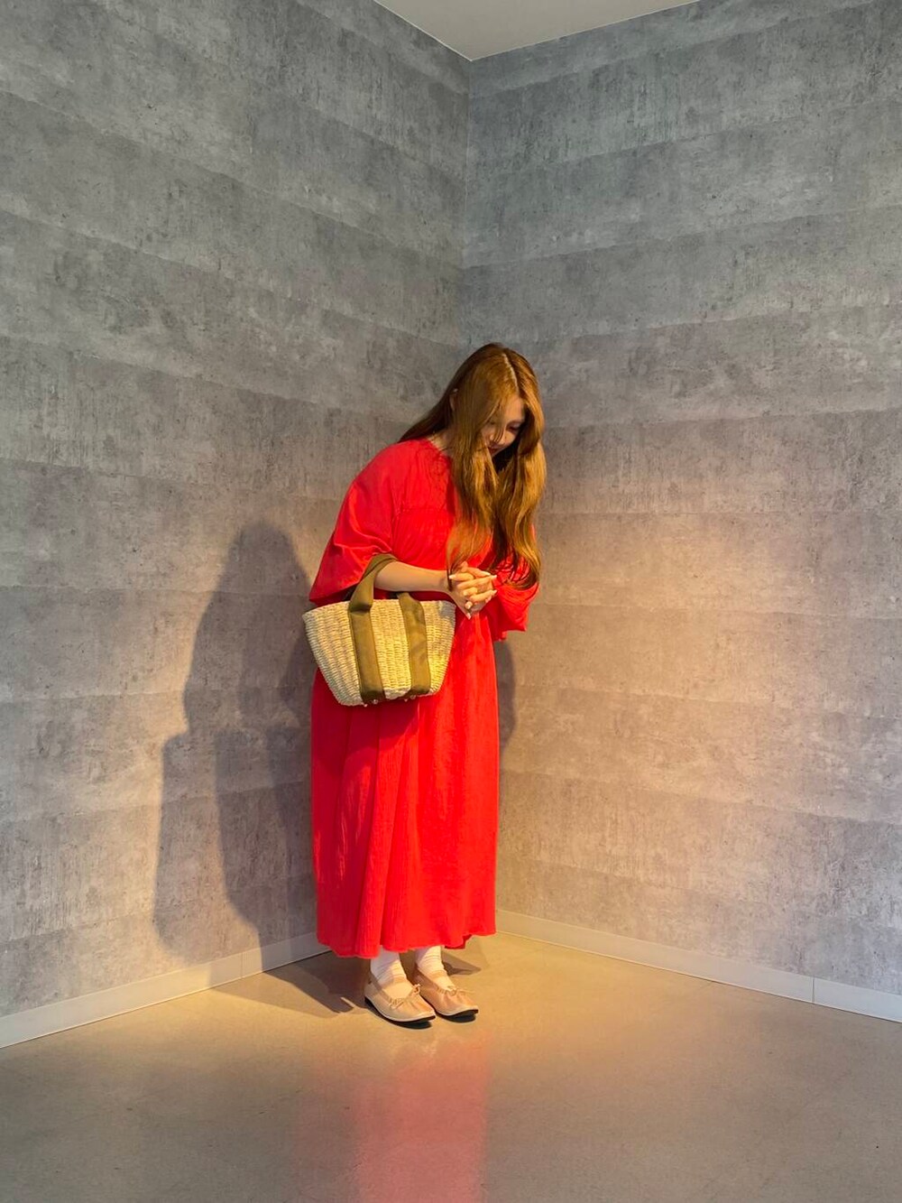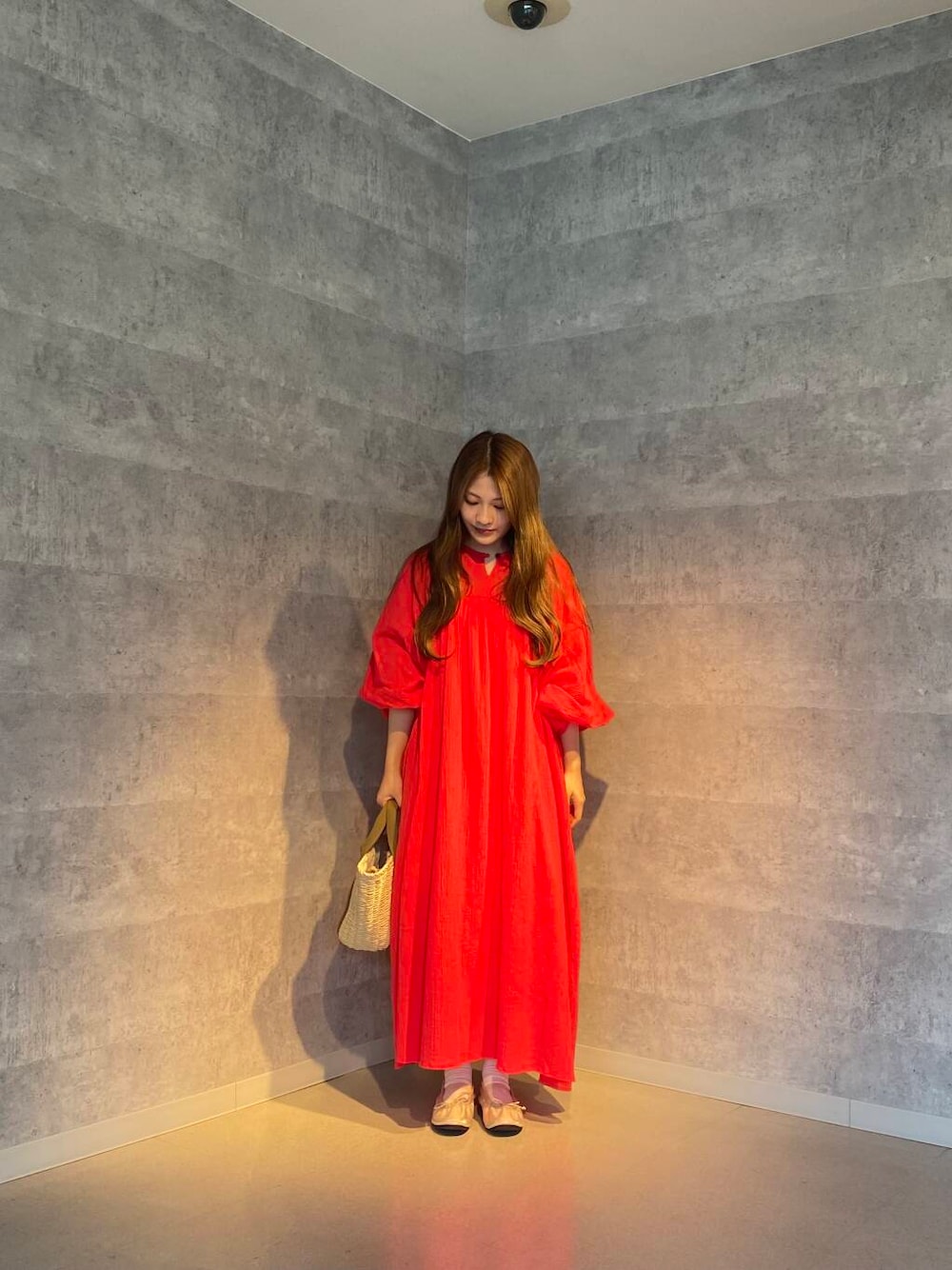 本日は、赤色のワンピースを使ったコーディネートにしました!色は赤色で派手な印象を受けますが、生地に透け感がありふんわりと着用できるので赤色に苦手意識がある方でも挑戦しやすいワンピースだと思います!