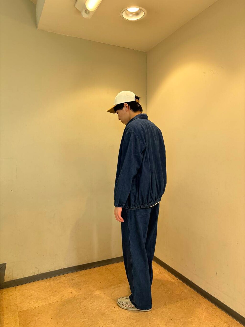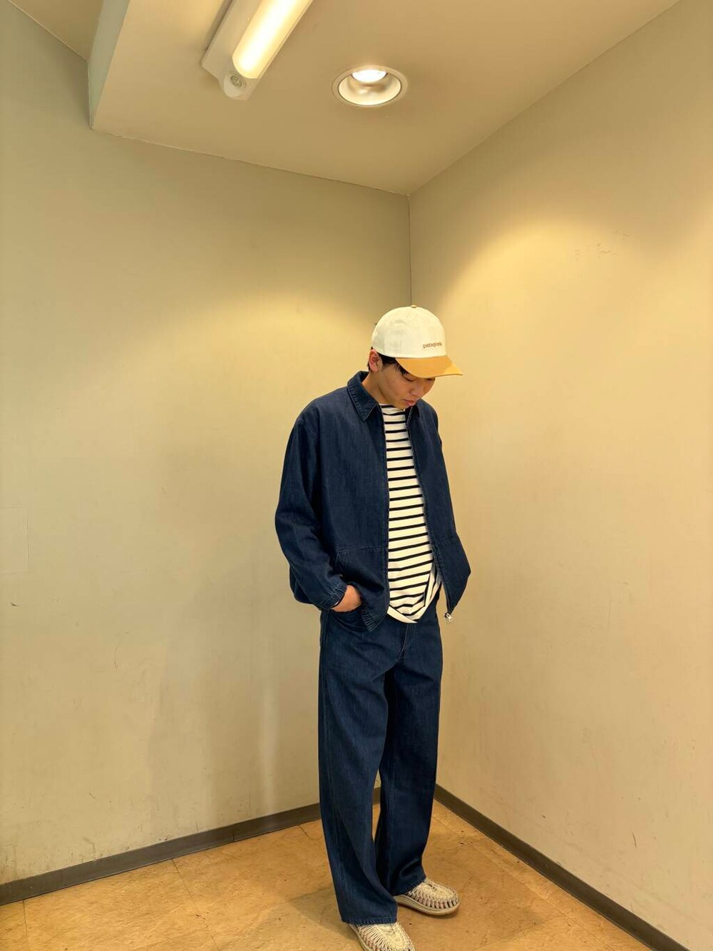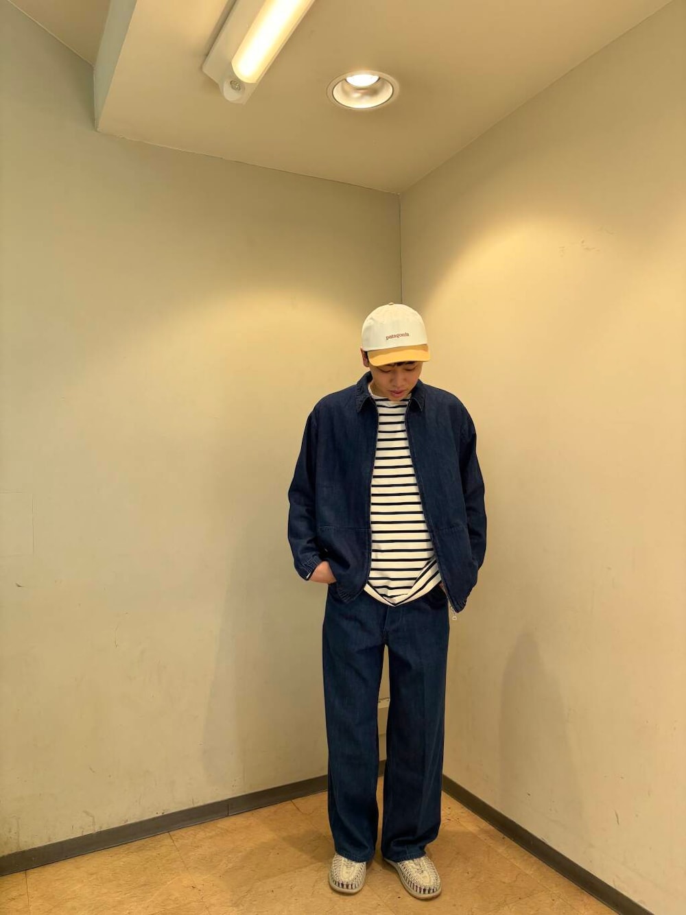 デニムの中にボーダーを入れてアクセントを加えてみました。頭の方が物足りなく感じたので差し色としてキャップをかぶってみました。