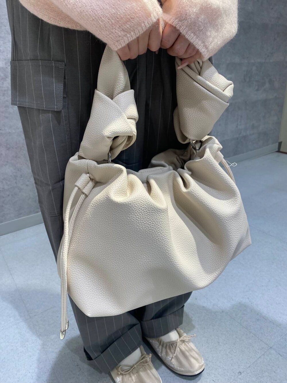 ニットは明るいピンクですが、肌に馴染むカラーでちくちくしないので快適に着ることができます!