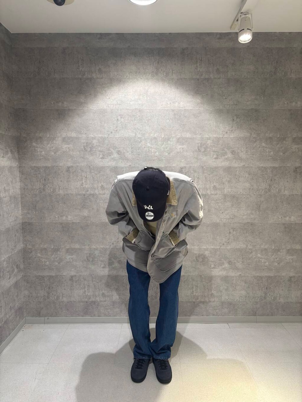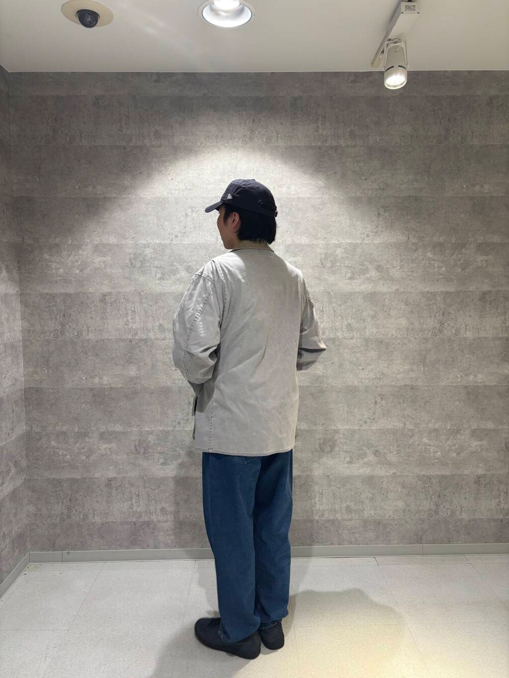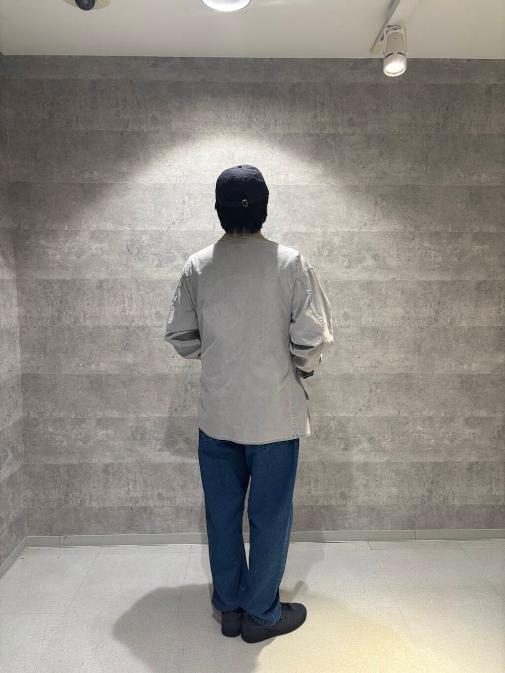 色が明るすぎるかなと思いアウターをグレー、キャップもブラックのものにして色の強弱をつけてみました!