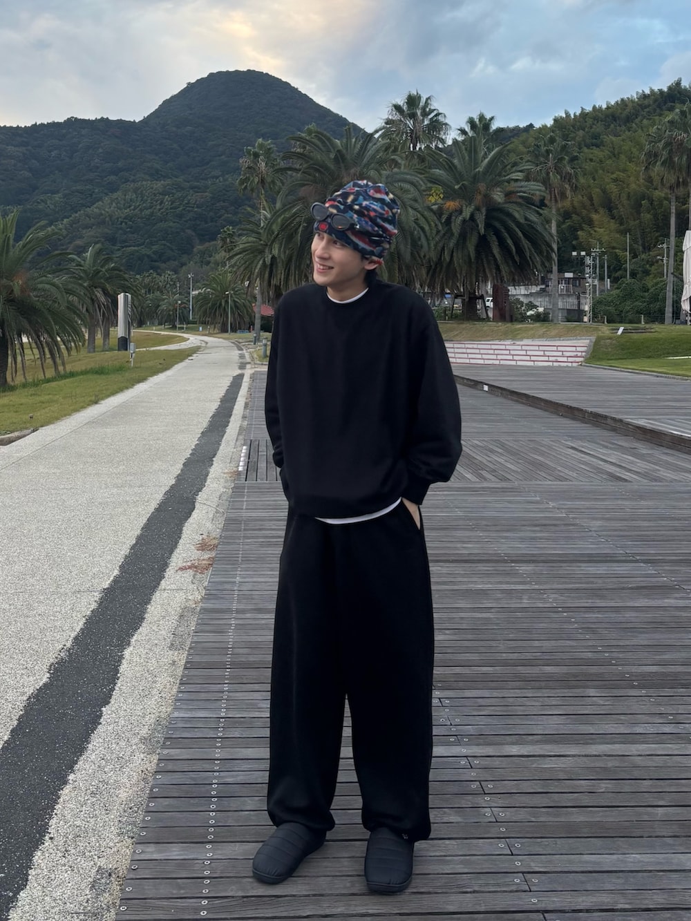 上下EKALのスウェットセットアップを着用し、白Tをレイヤードさせて抜け感をプラス✔︎︎︎︎