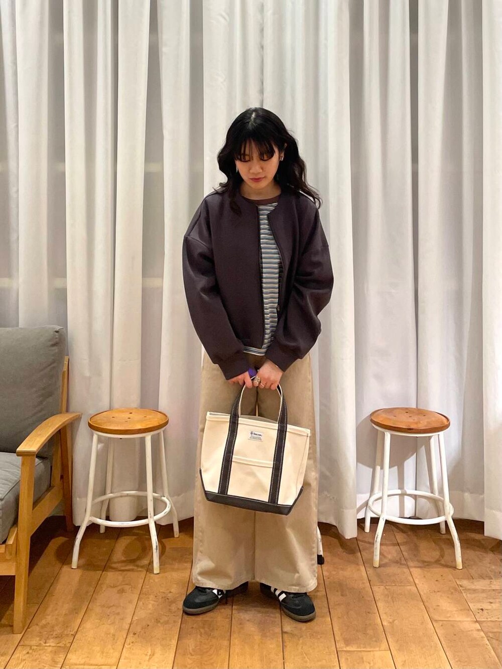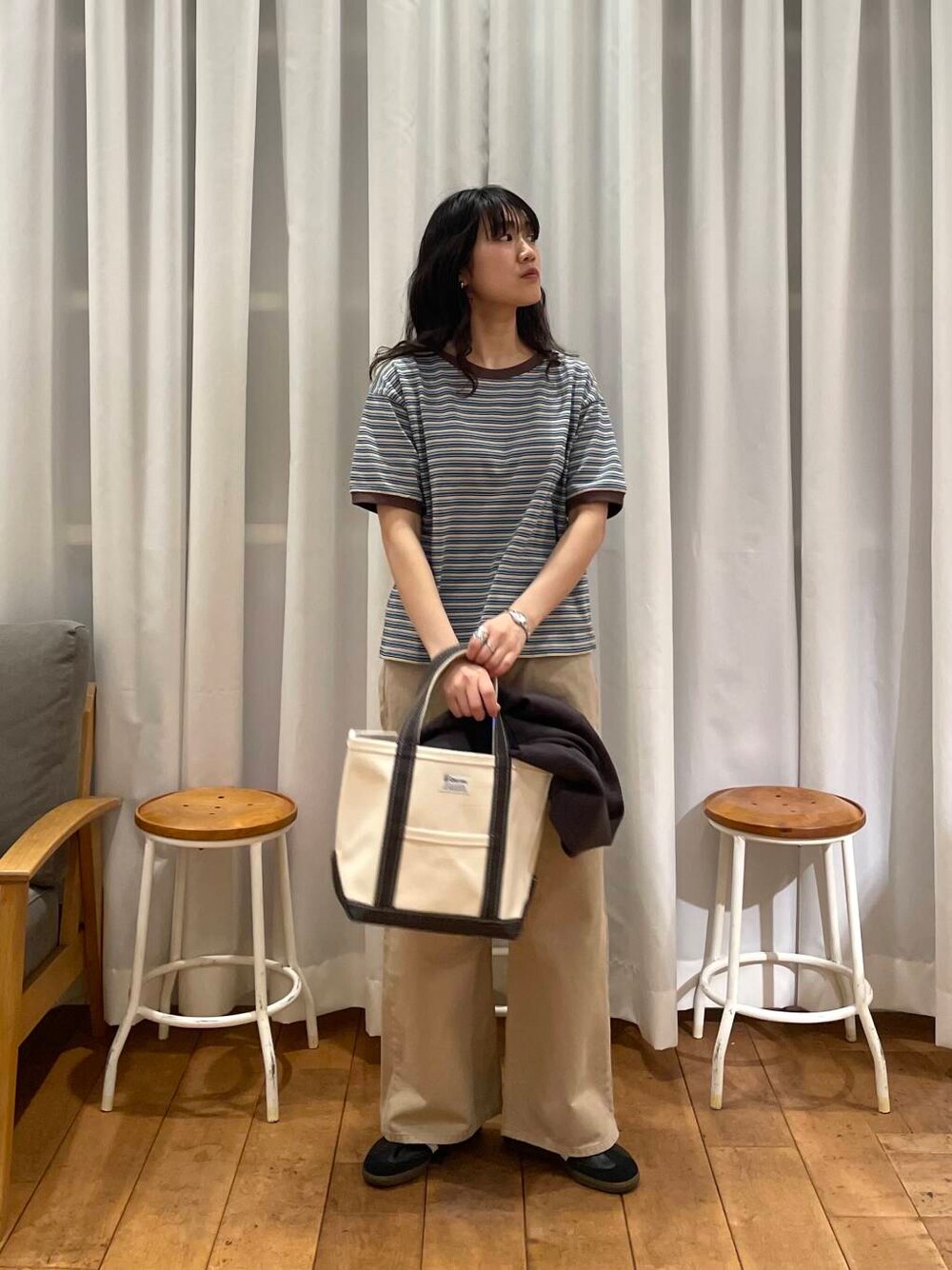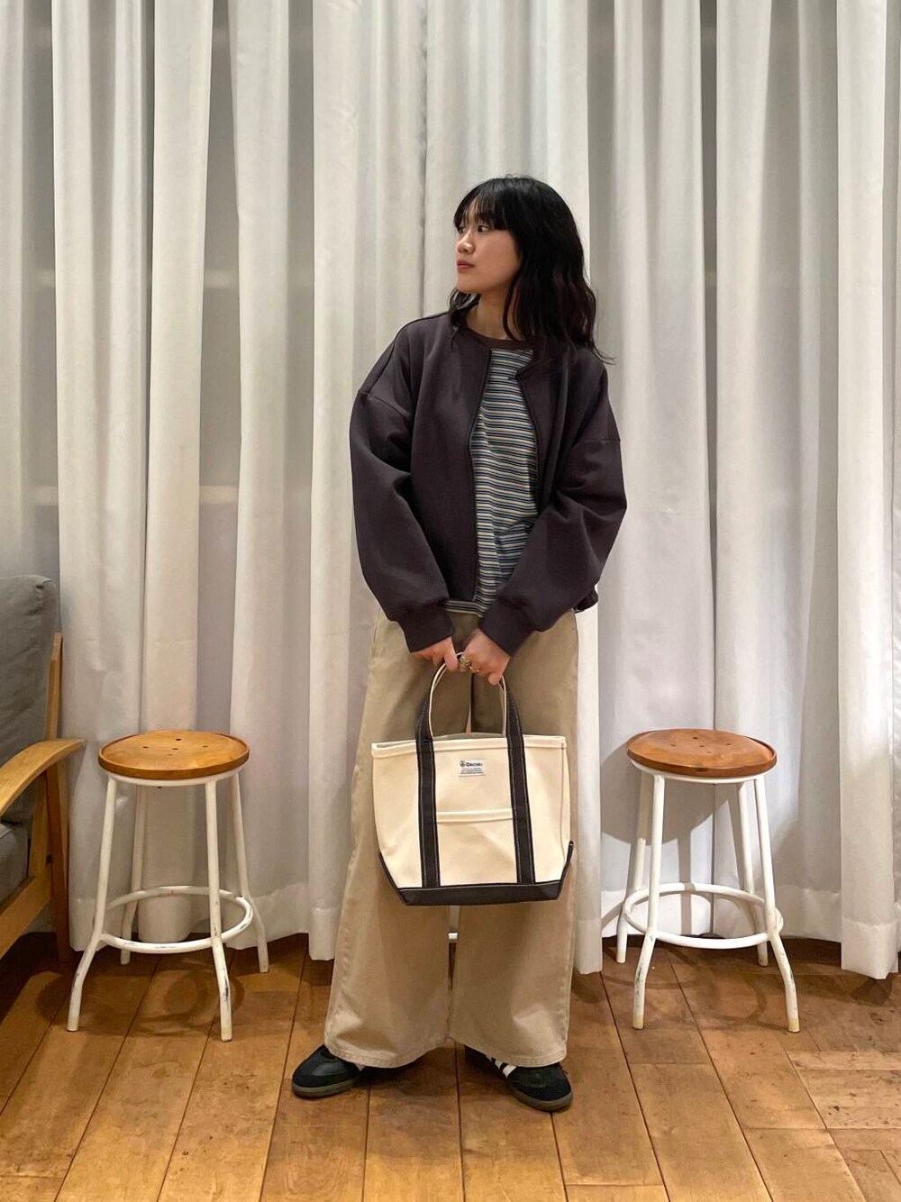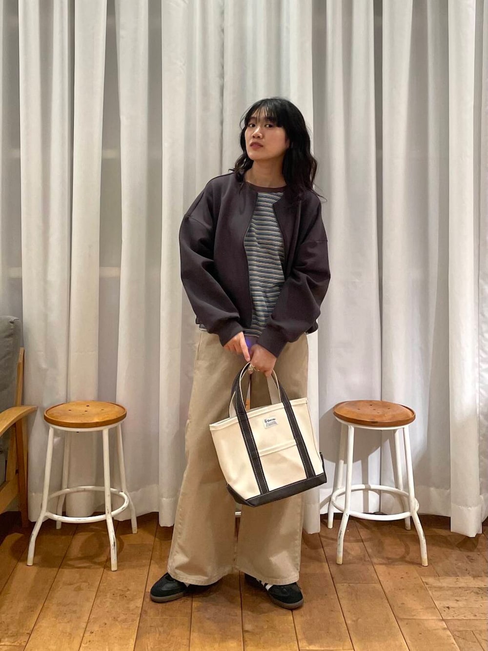 Tシャツのブラウンを拾って、小物やカーディガンはブラウンやグレーをチョイスしました!