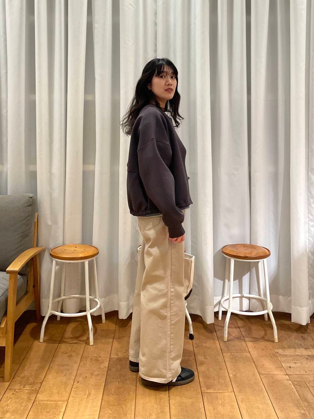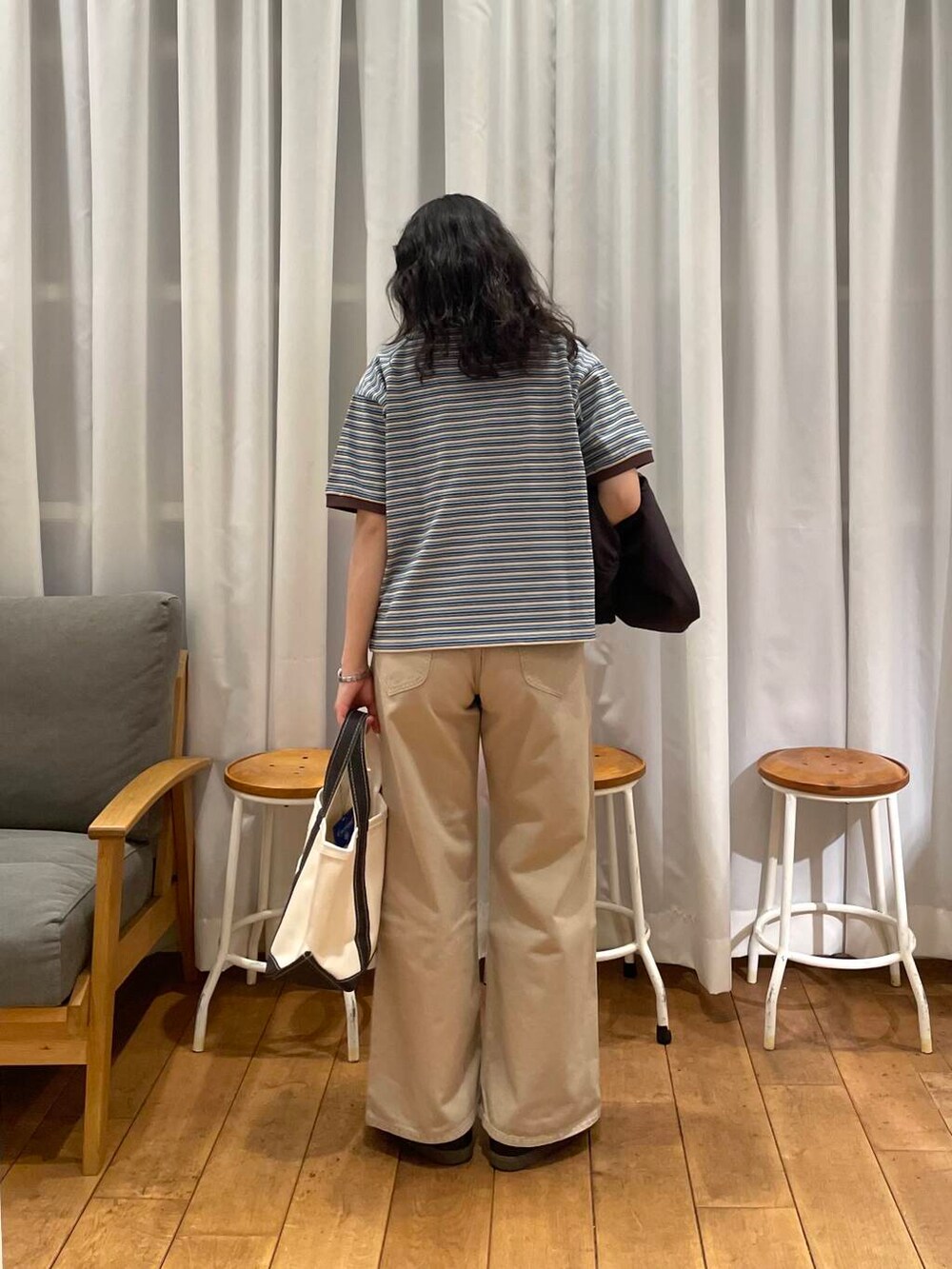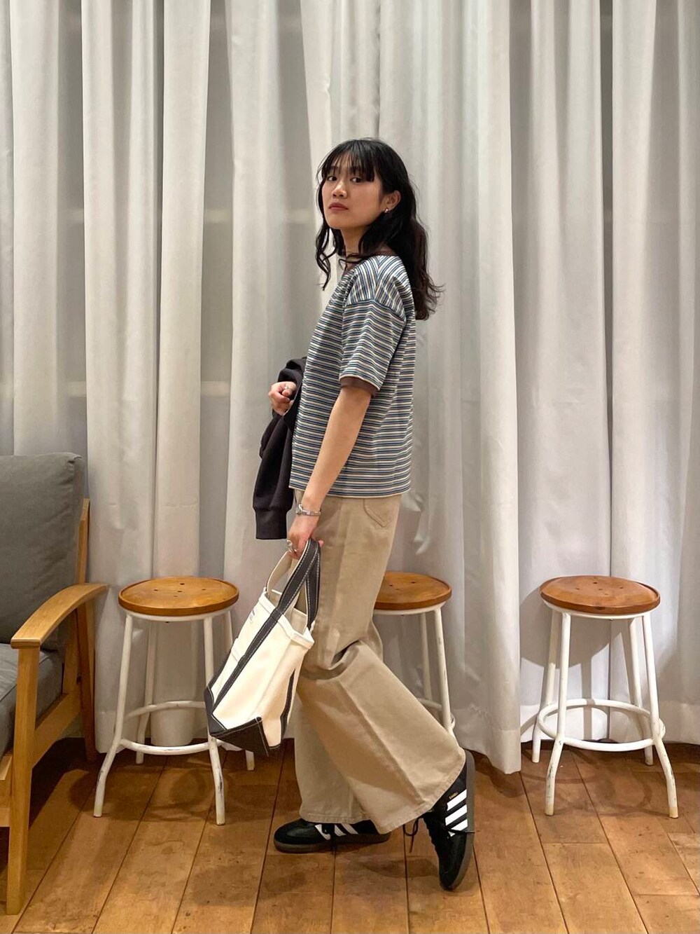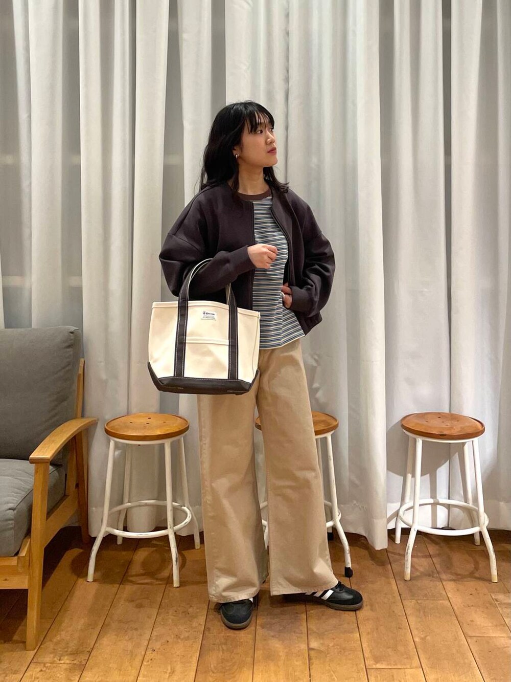 Tシャツのブラウンを拾って、小物やカーディガンはブラウンやグレーをチョイスしました!