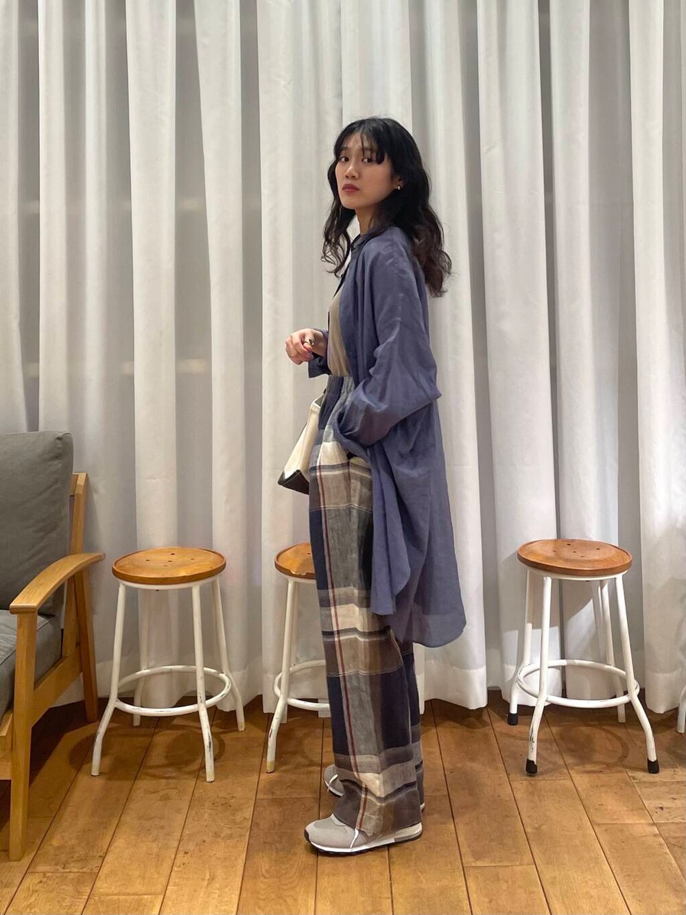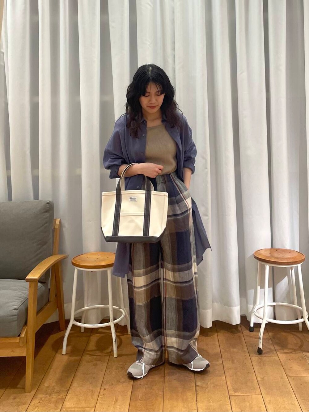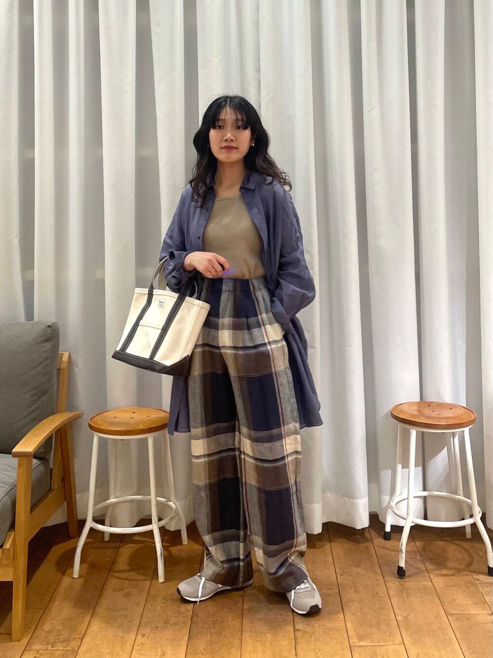 リネンチェックパンツとラミーコットンシャツのカラーがマッチして可愛いです😍