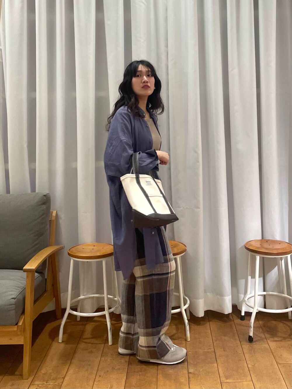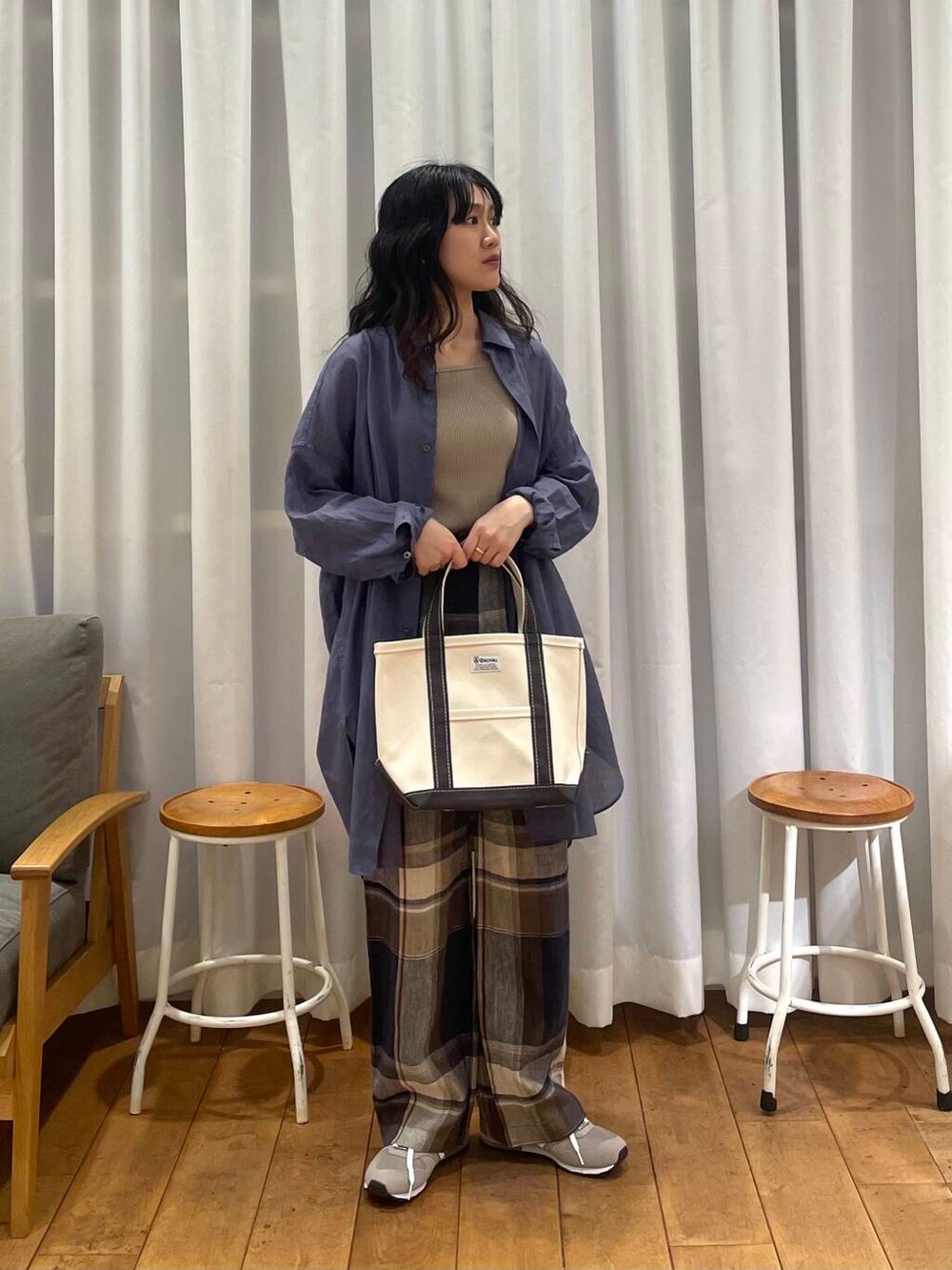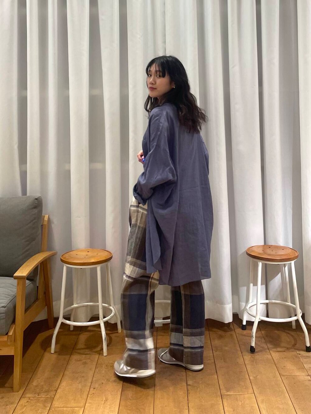 リネンチェックパンツとラミーコットンシャツのカラーがマッチして可愛いです😍