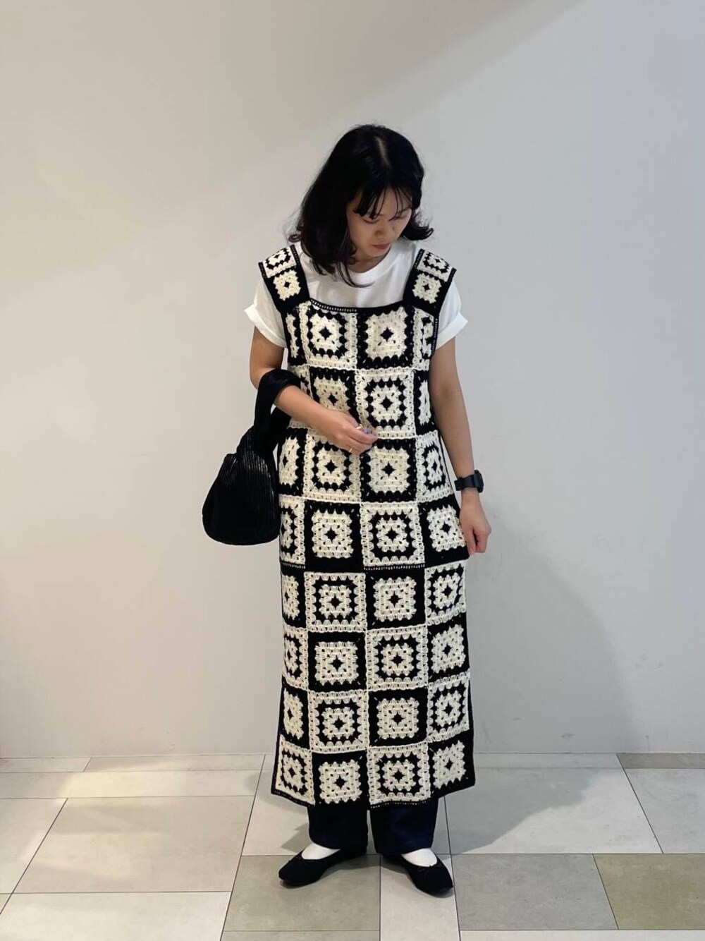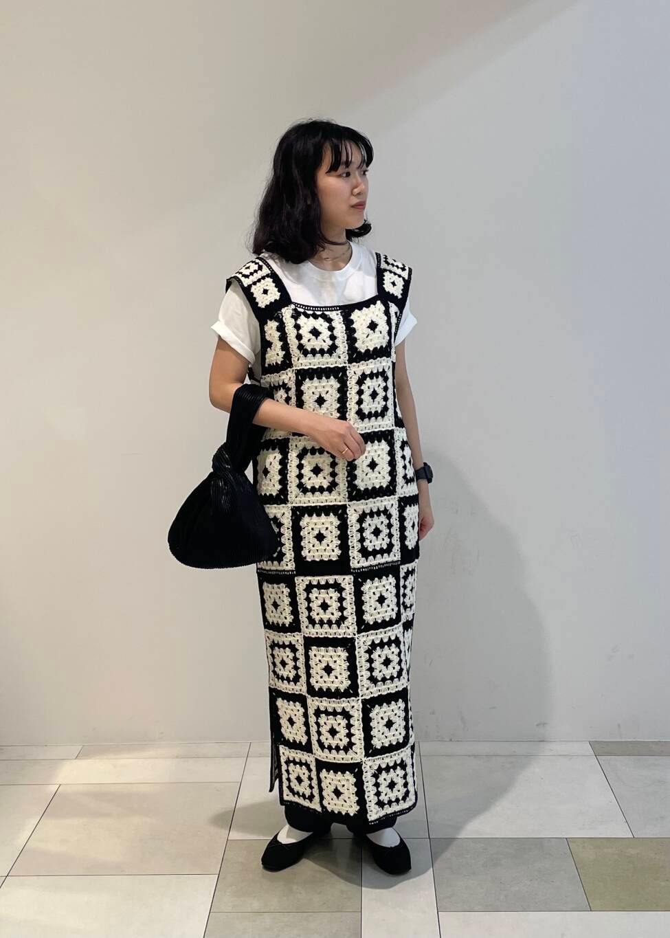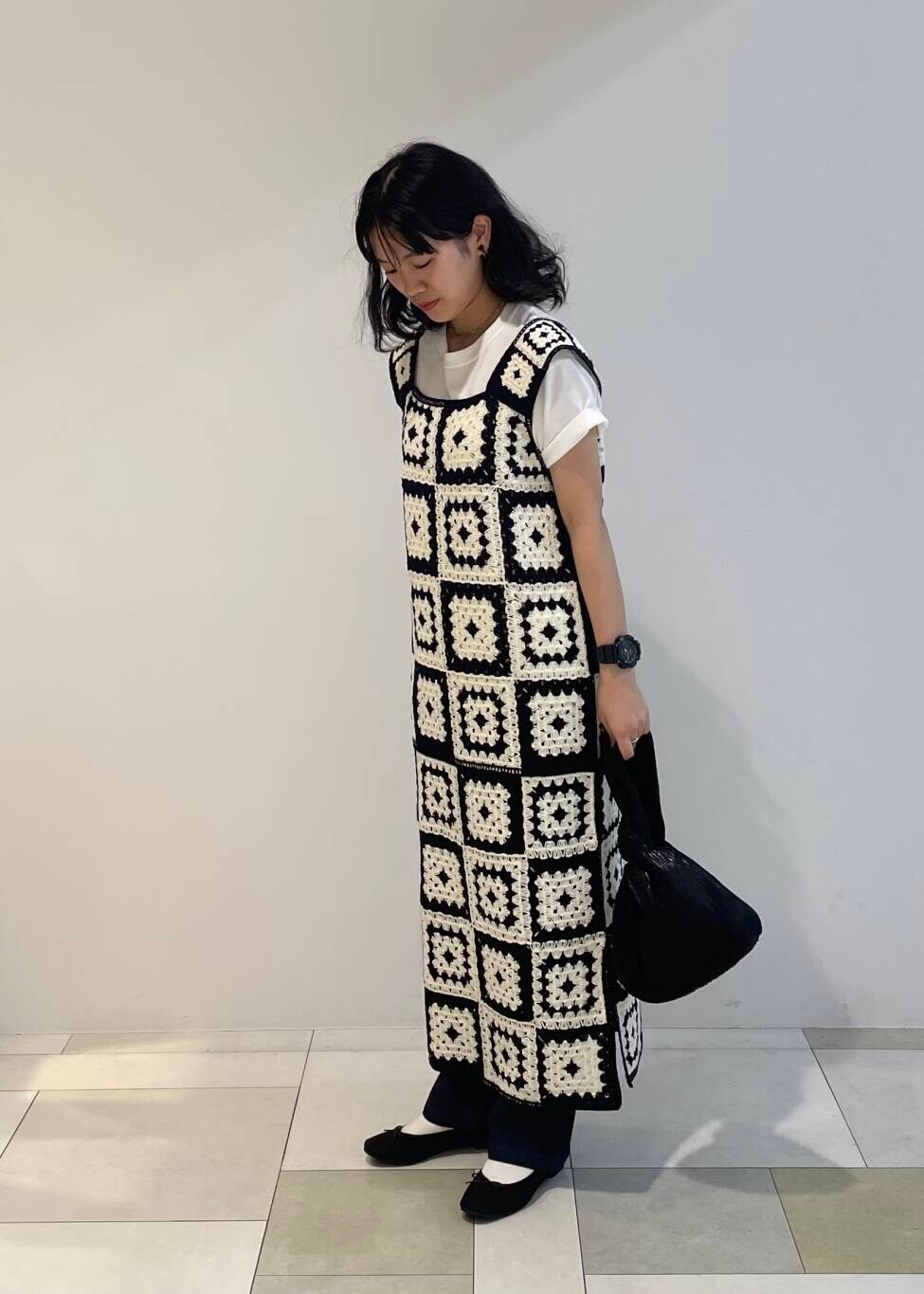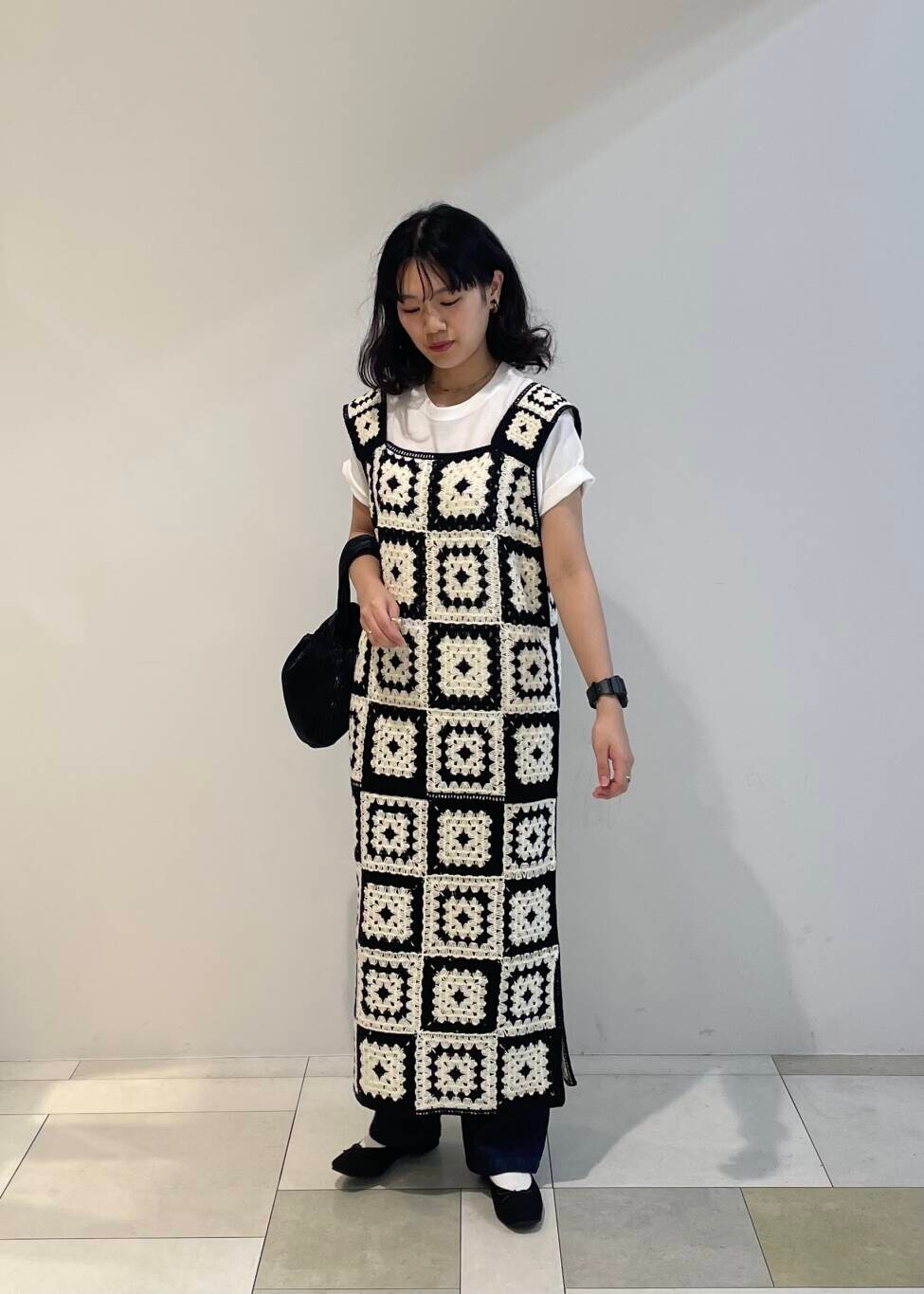 クロシェ編みが可愛いニットワンピースが一際目を引きます。