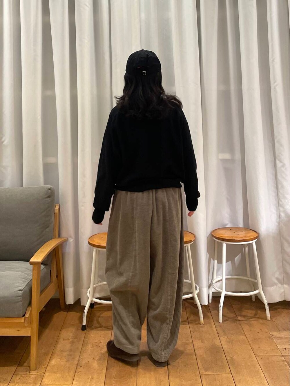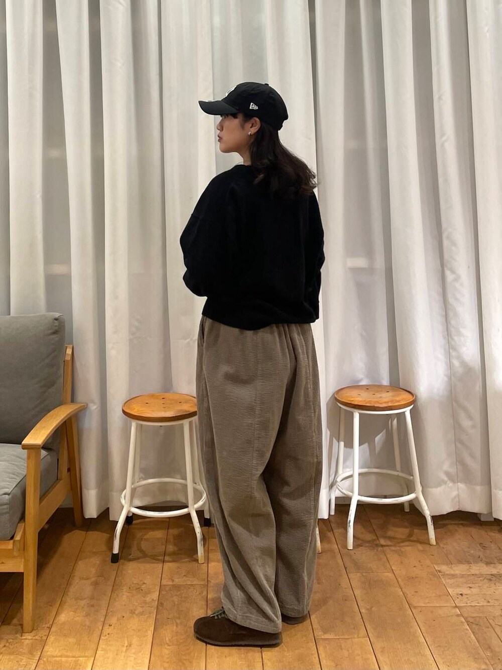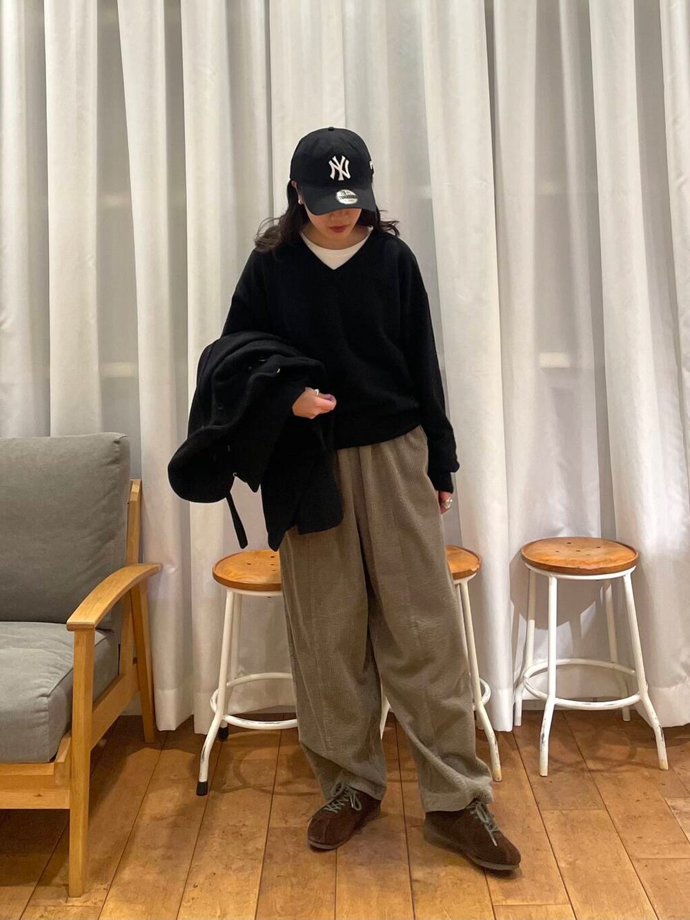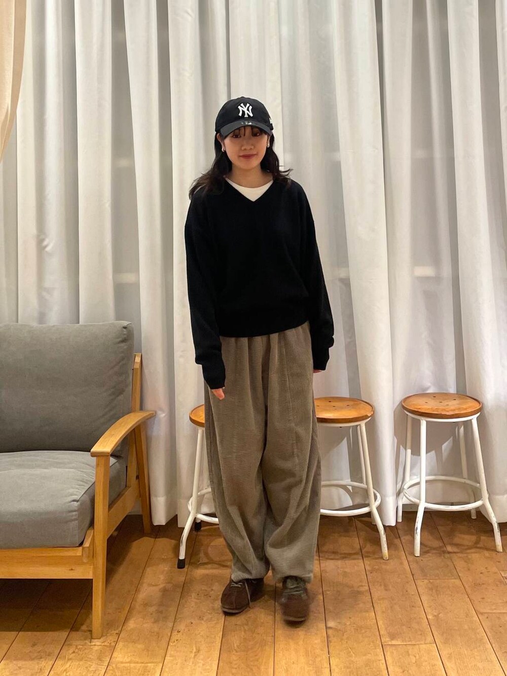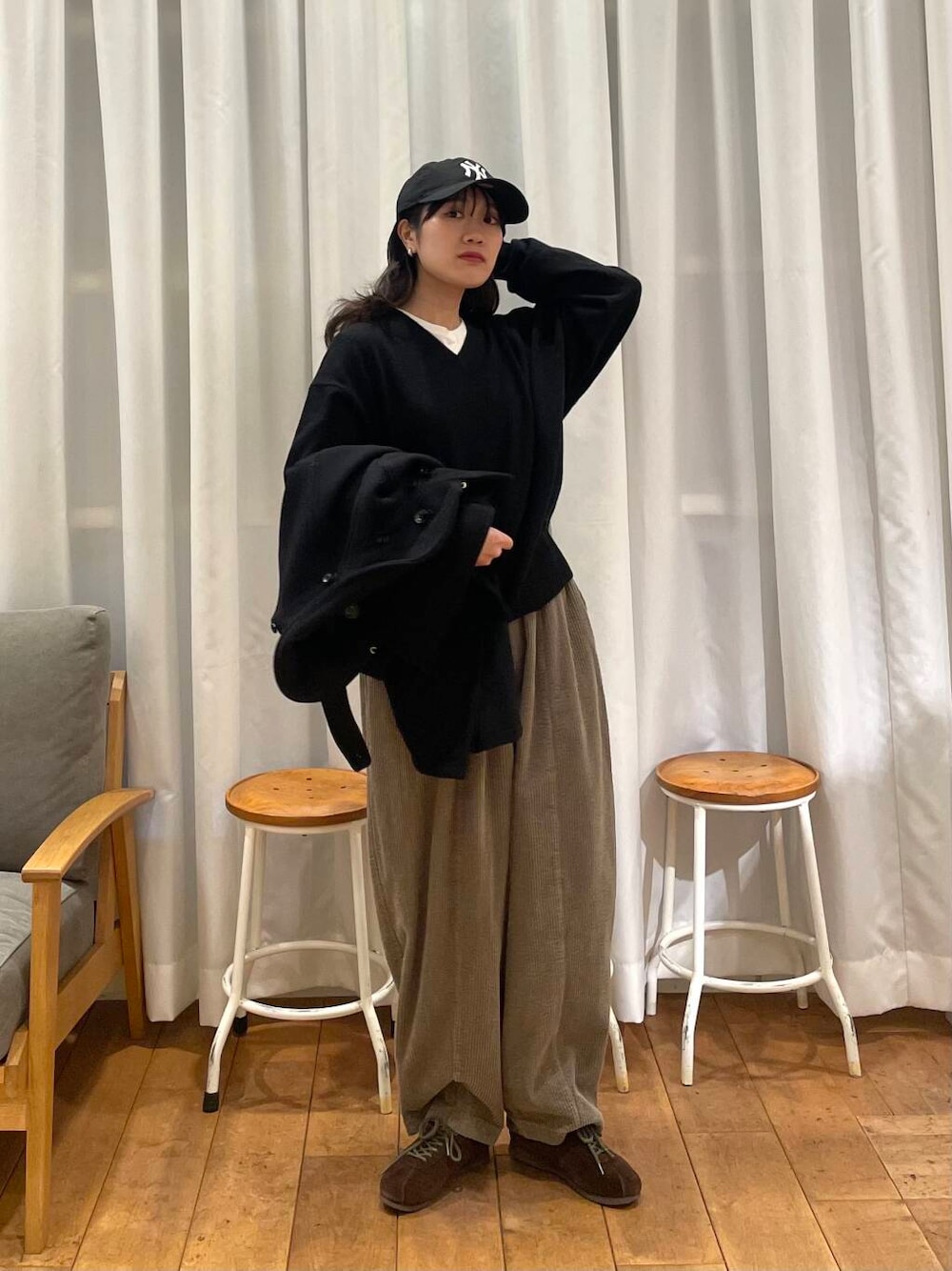 かぐれのコーデュロイボリュームパンツとVネックプルオーバーを合わせたコーデです。