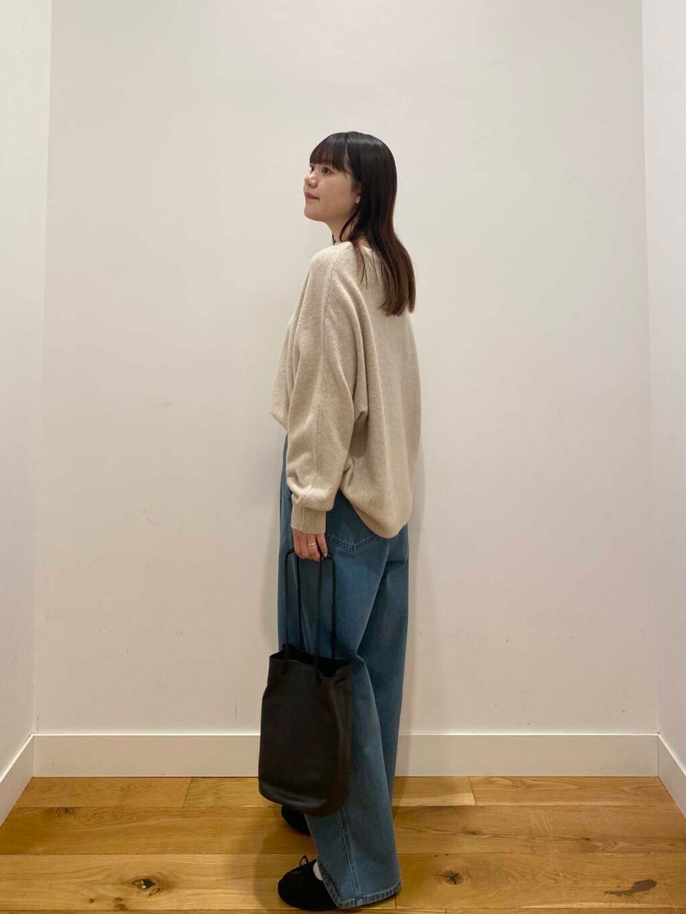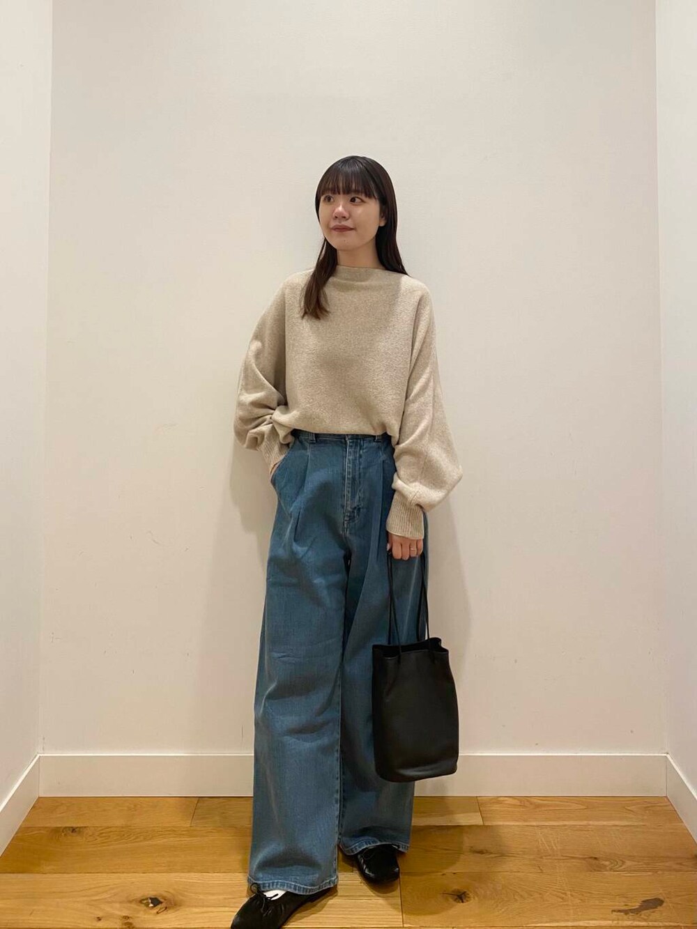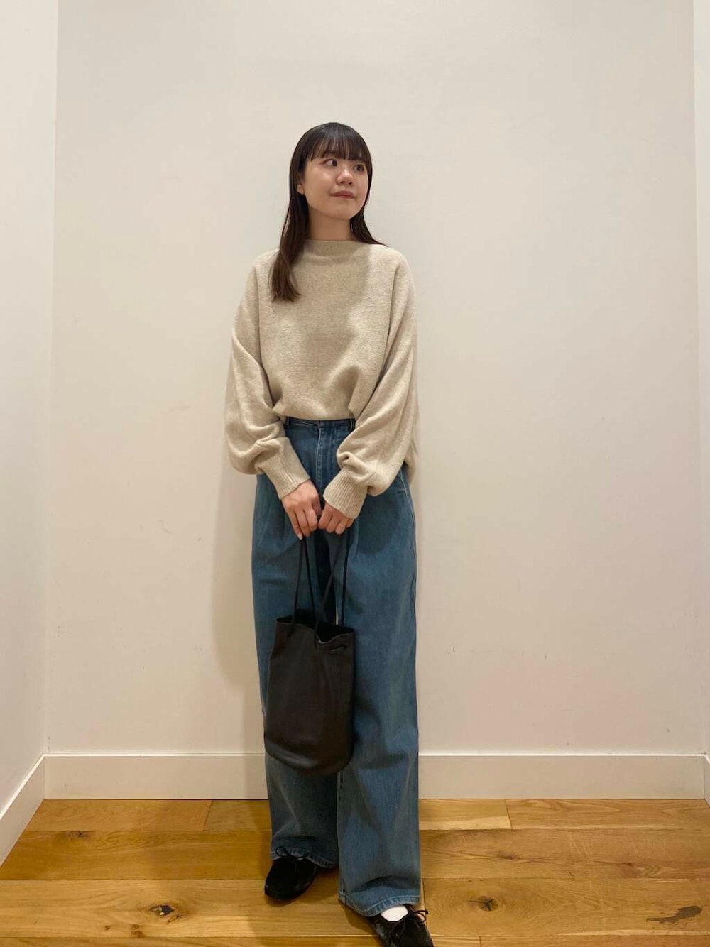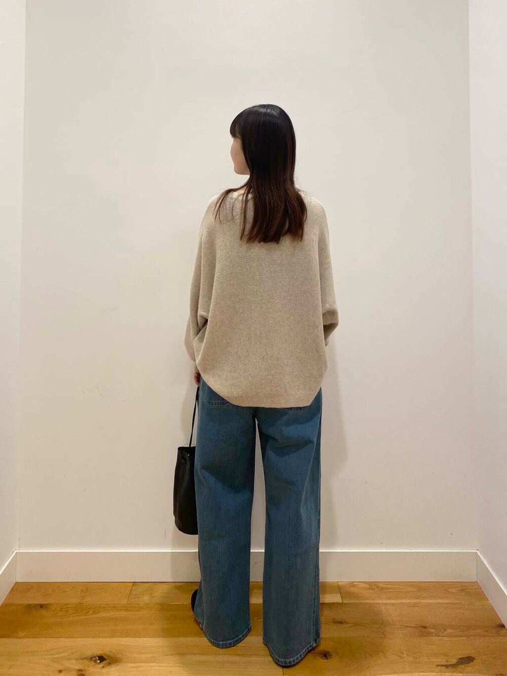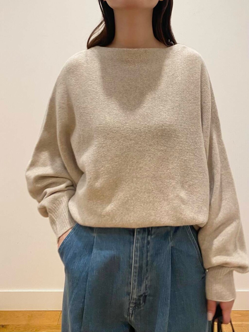 すっきり見えするボートネックの首元と、ゆるさの出るワイドシルエットは女性らしい印象になります。