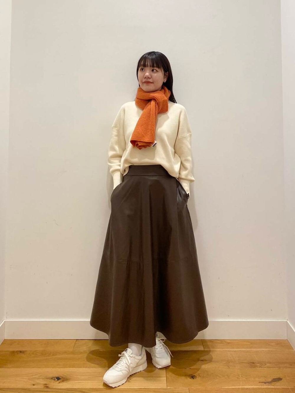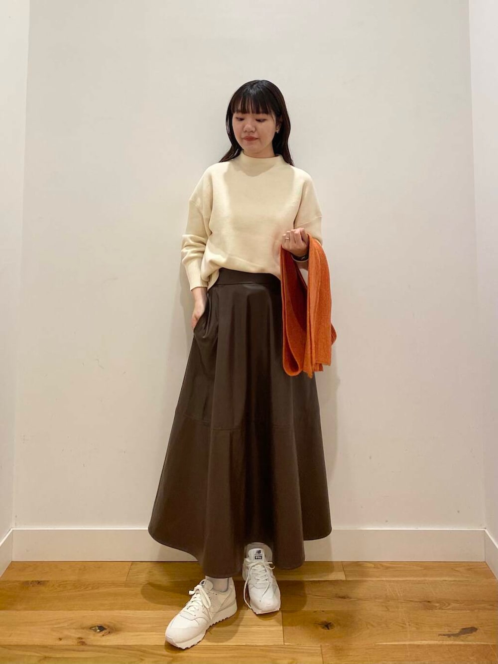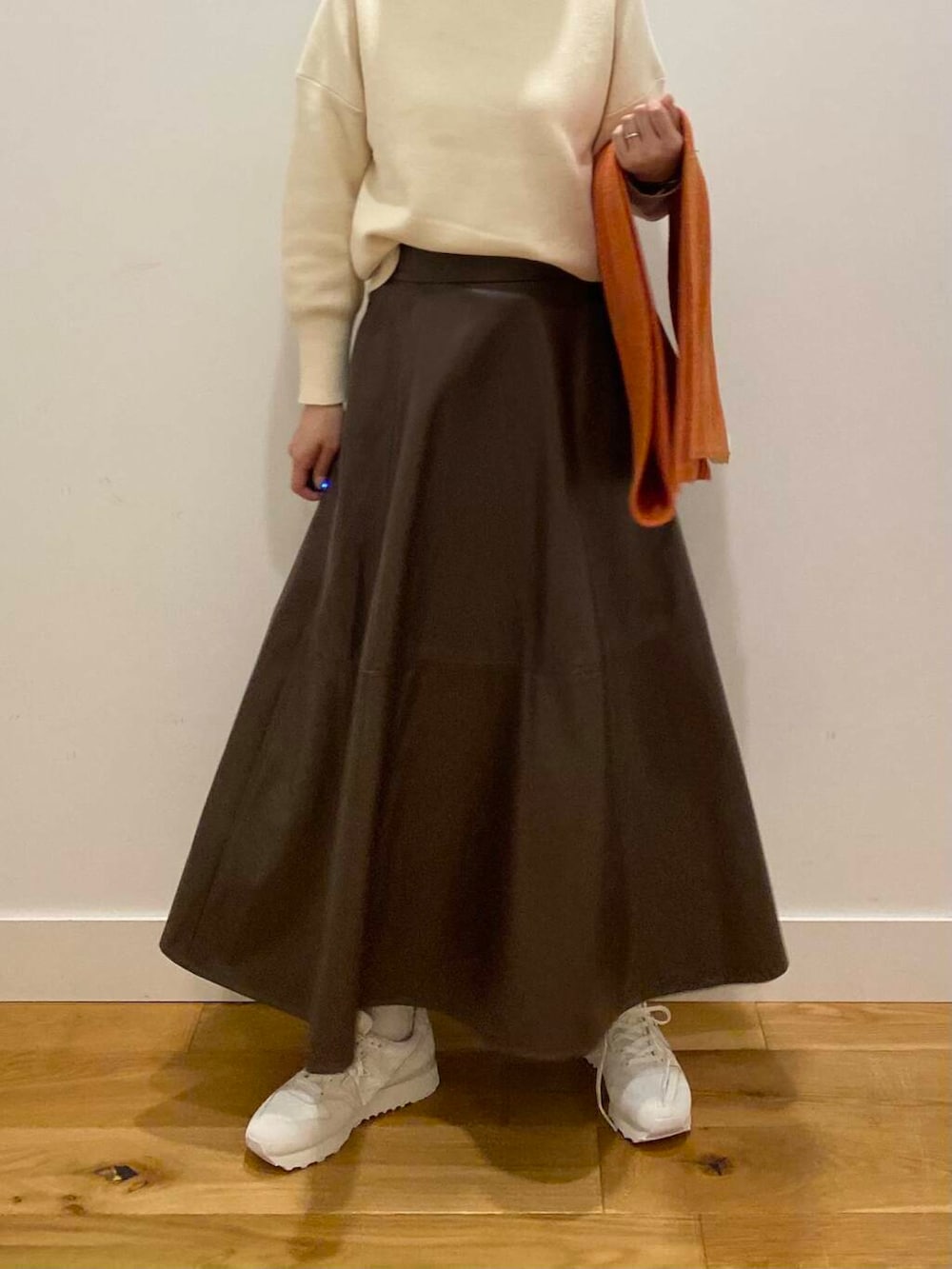 トレンドのフェイクレザー生地のスカートは、シンプルなニットと合わせても一気に今年っぽくなってオススメなアイテムです!