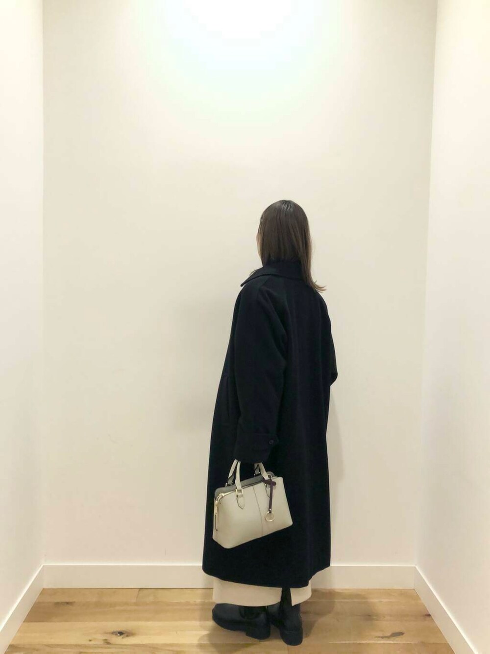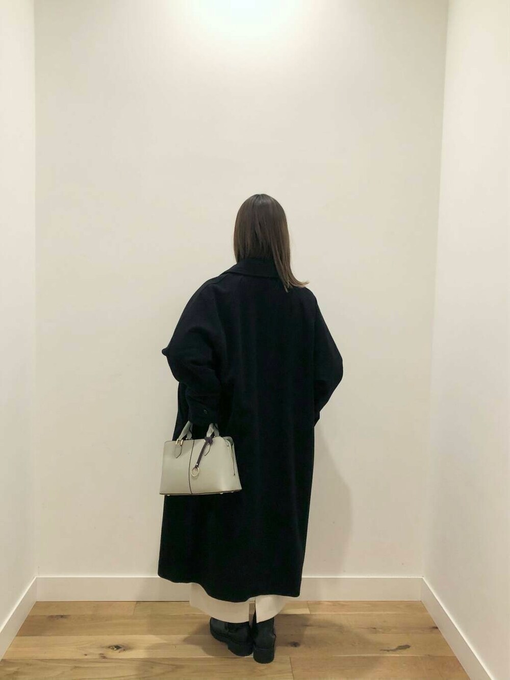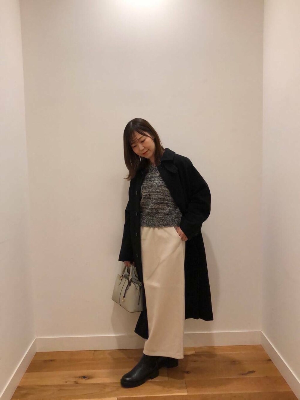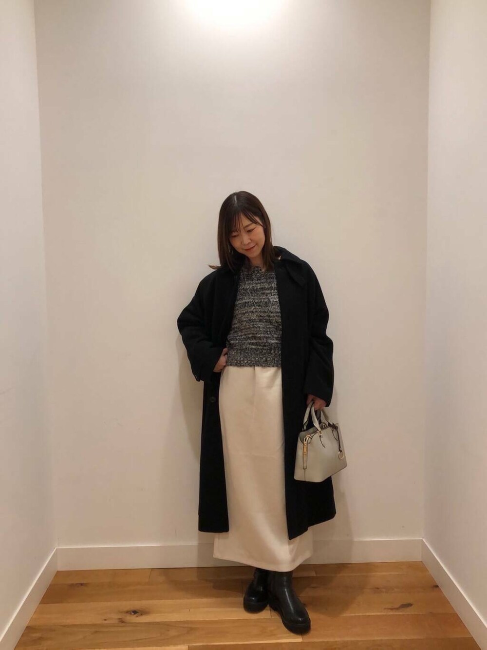 黒のバルマカンコートを羽織ることで、モノトーンコーデのきれいめカジュアルに仕上げました。