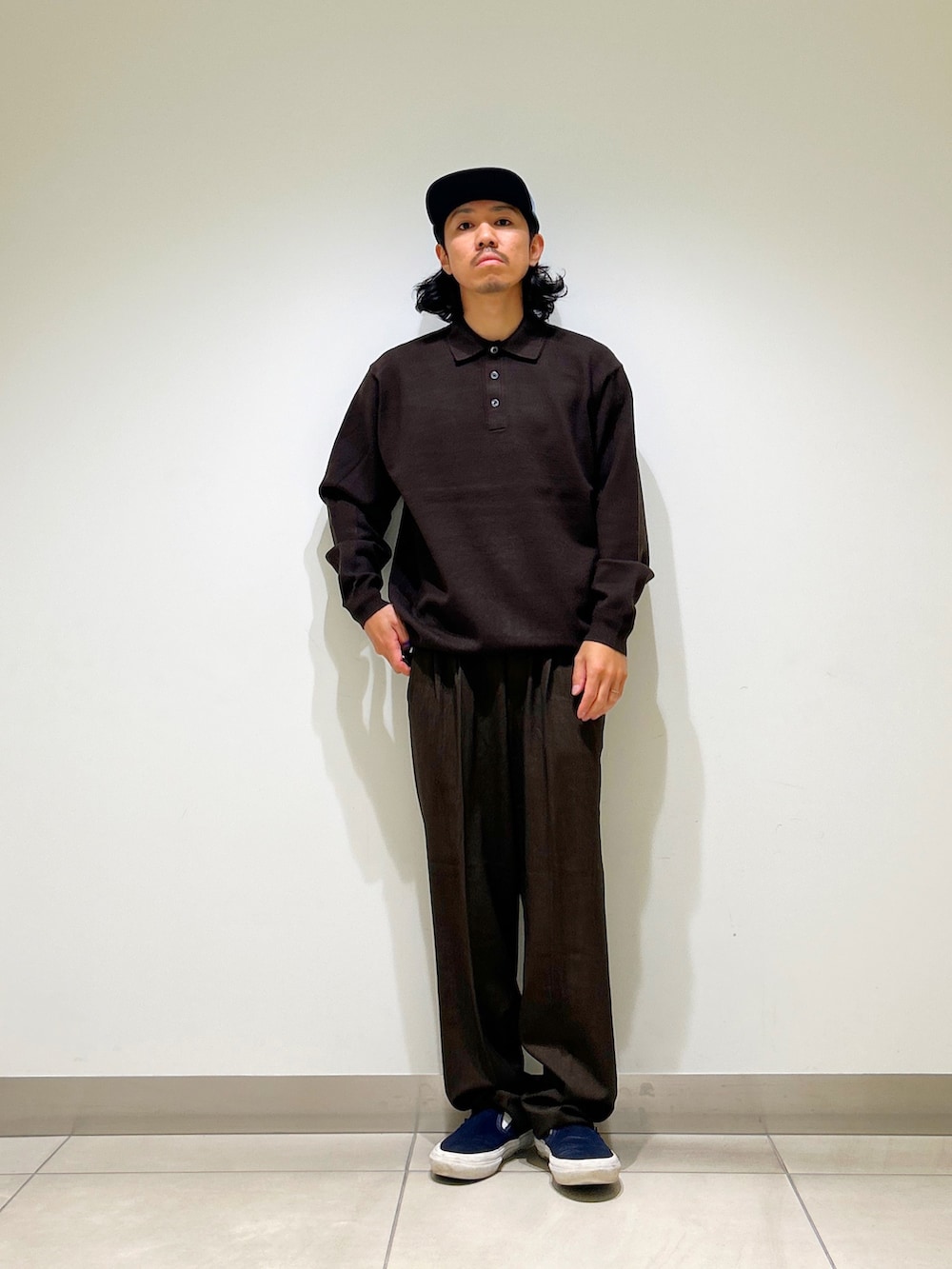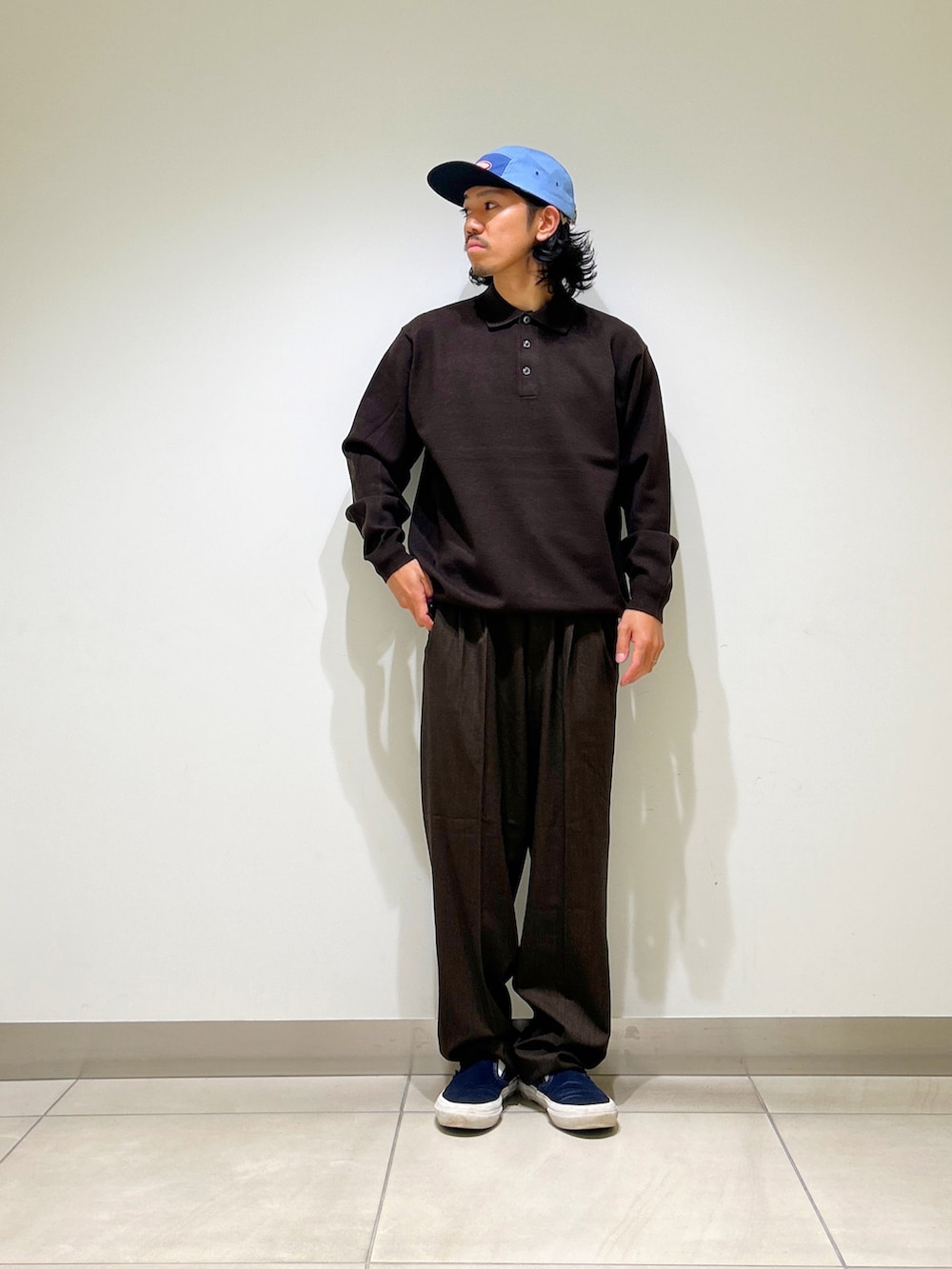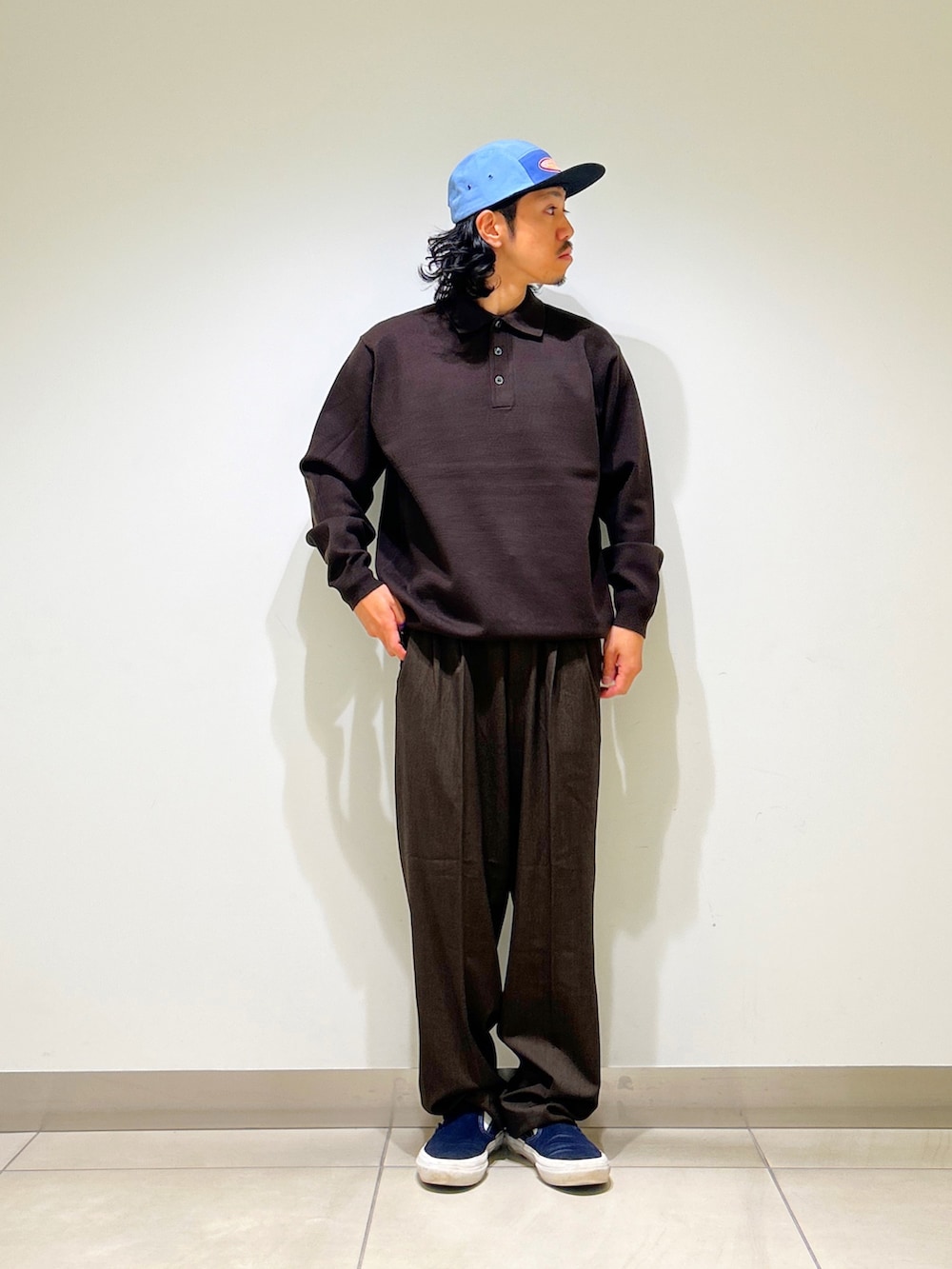 ポロシャツとワイドトラウザーでキレイめ感を維持しつつ、ルーズなシルエットでカジュアル感もプラスしたちょうどいいバランス◉
